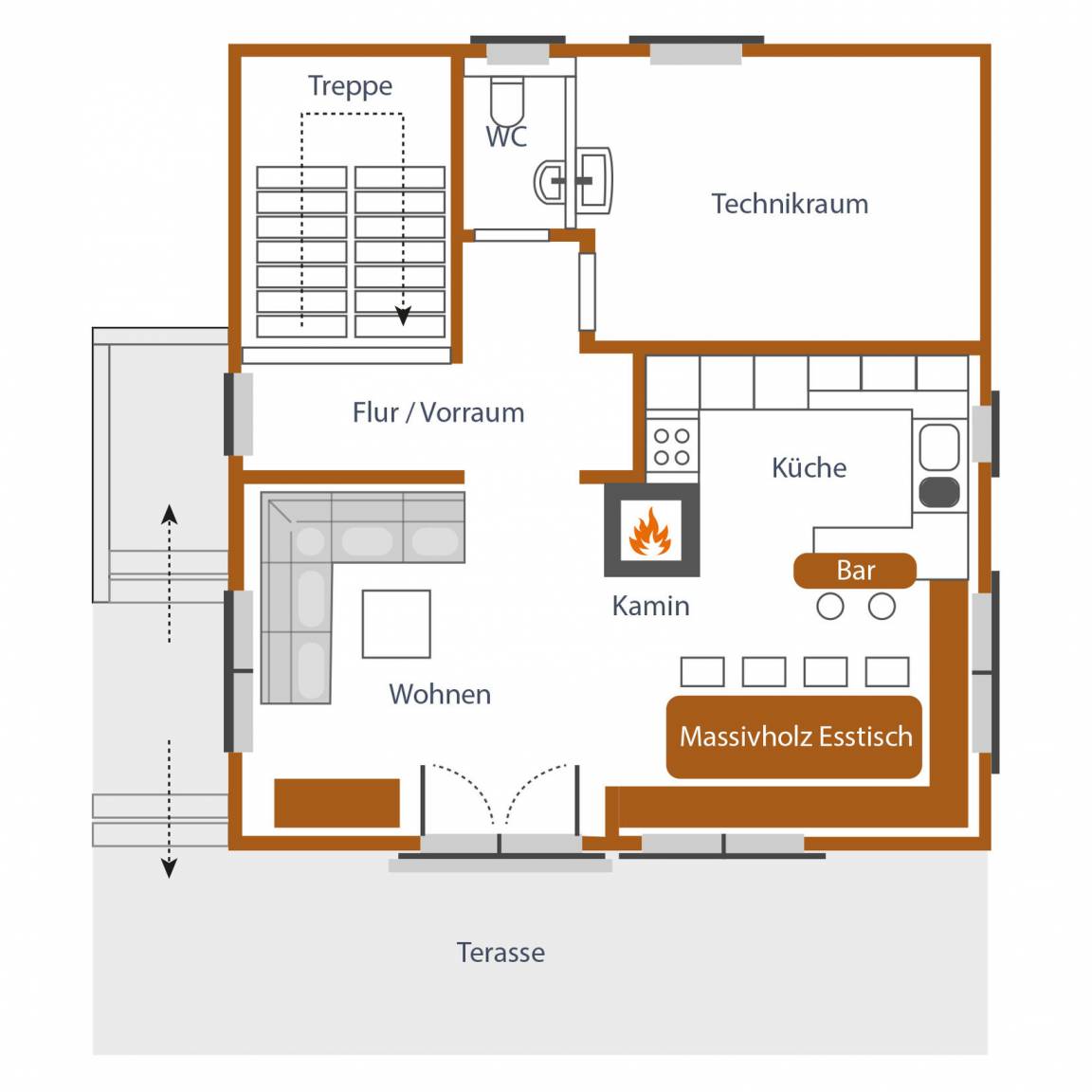 Im großzügigen Wohnbereich lädt ein Kaminofen mit bereitgestelltem Holz dazu ein, den Tag in behaglicher Atmosphäre ausklingen zu lassen. Für zusätzliches Wohlbefinden sorgt die kostenfrei nutzbare Infrarotkabine. In den Sommermonaten lädt ein großer Gasgrill auf der Terrasse zu geselligen Abenden im Freien ein.