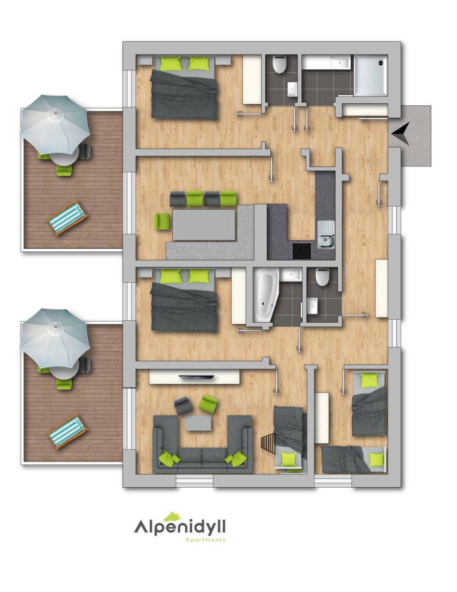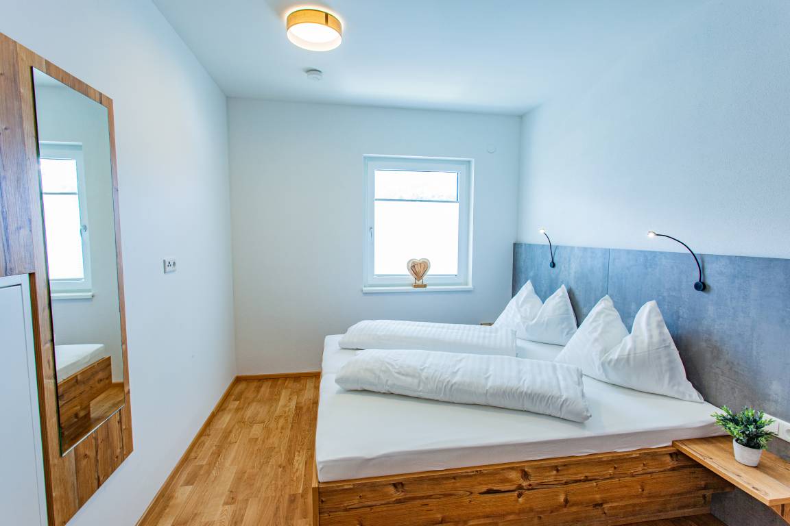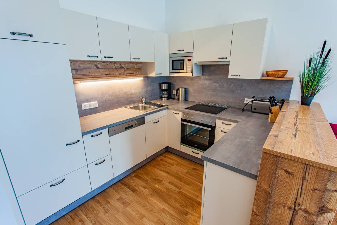 Die gemütliche, modern eingerichtete Wohnung für bis zu 10 Personen liegt im Obergeschoss eines neu errichteten Gebäudes und besteht aus drei Schlafzimmern, zwei Wohnküchen (Herd mit Backofen, Geschirrspüler, Toaster, Wasserkocher), zwei Bädern, zwei WCs und einer großzügigen Terrasse.