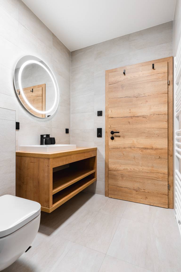 The living area invites you to relax with a large dining table, cosy seating area and direct access to the 22 m² panoramic terrace – here you can enjoy breakfast with a view of the Alps or the sunset over the peaks of Ski Amadé in the evening.