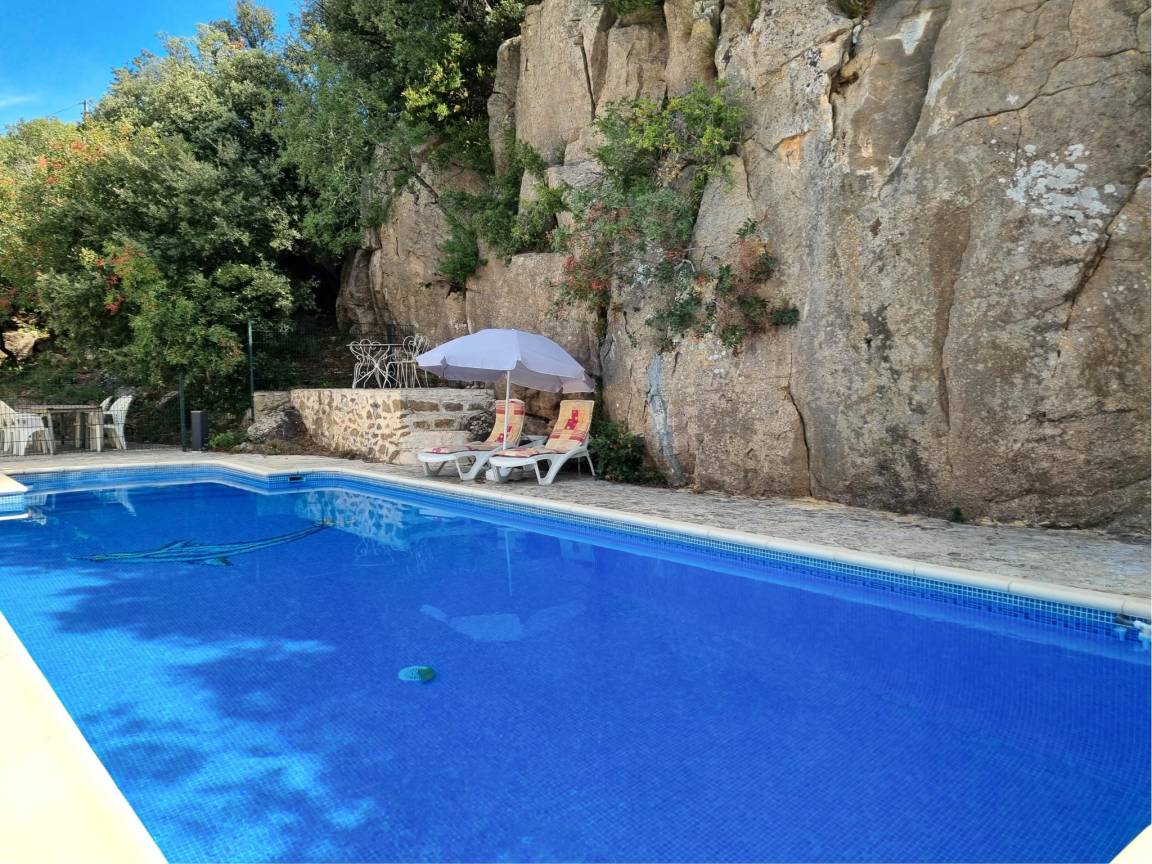 Die Natursteinmauer entlang des Pools verleiht ihm ein besonderes und anmutiges Aussehen.
