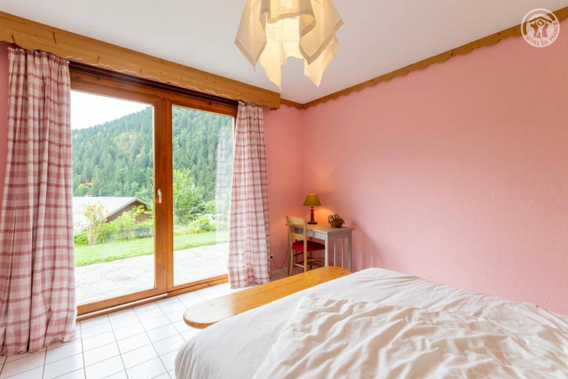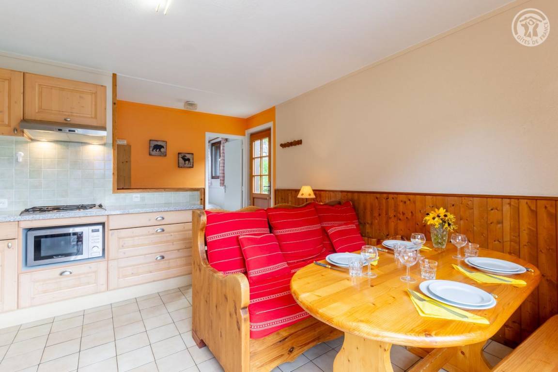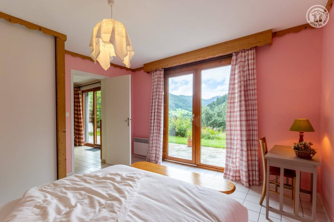 Gîte im Erdgeschoss des Chalets des Eigentümers (Zugang von der Straße über den sanft abfallenden Garten (keine Stufen oder Treppen), bestehend aus Wohnküche (kombinierter Mikrowellenherd), 2 Schlafzimmern (1 Doppelbett 160x200 cm / 2 Einzelbetten). 90x190 cm), ein Badezimmer (Dusche und WC).
