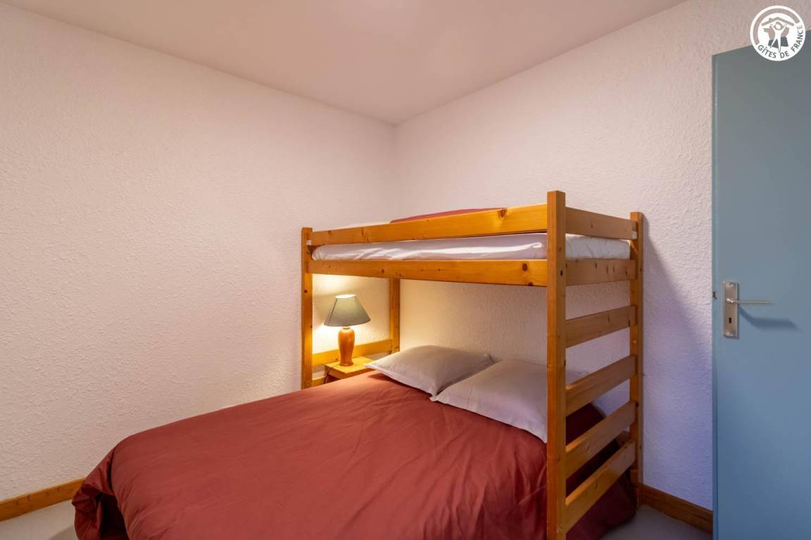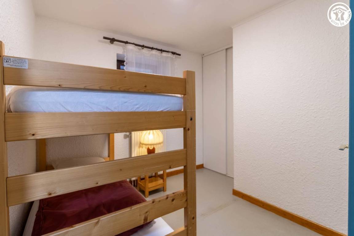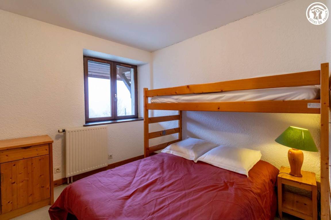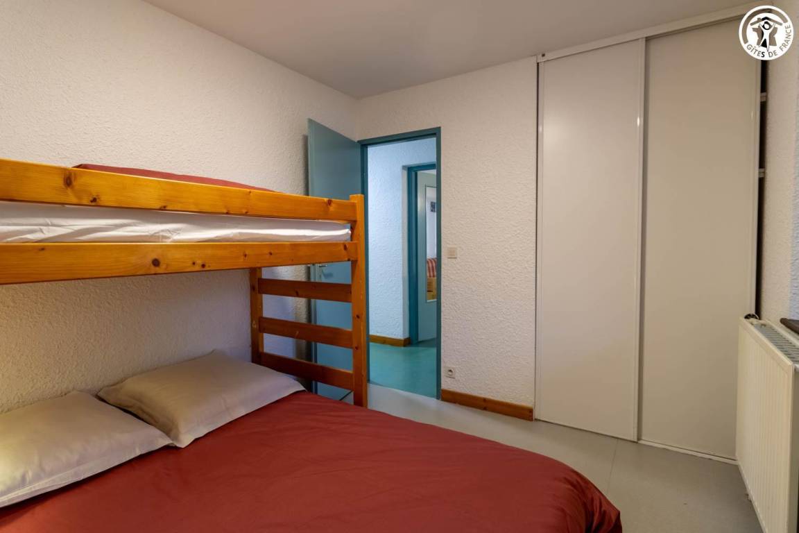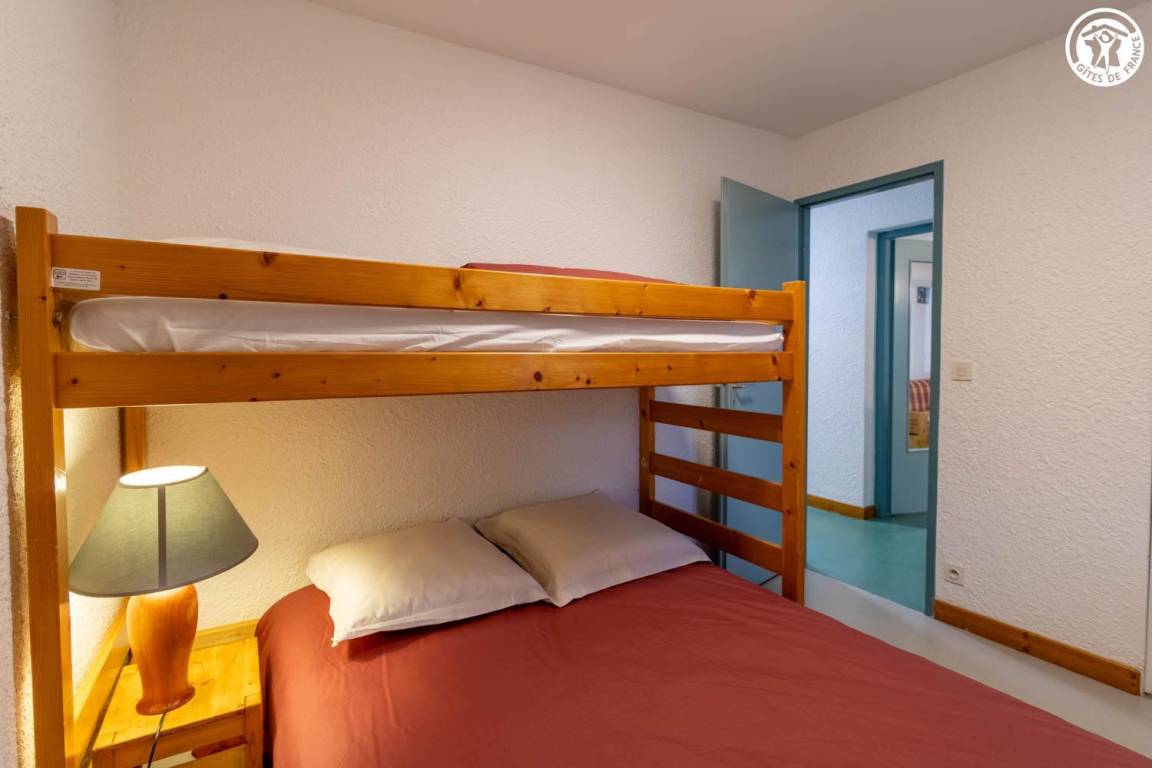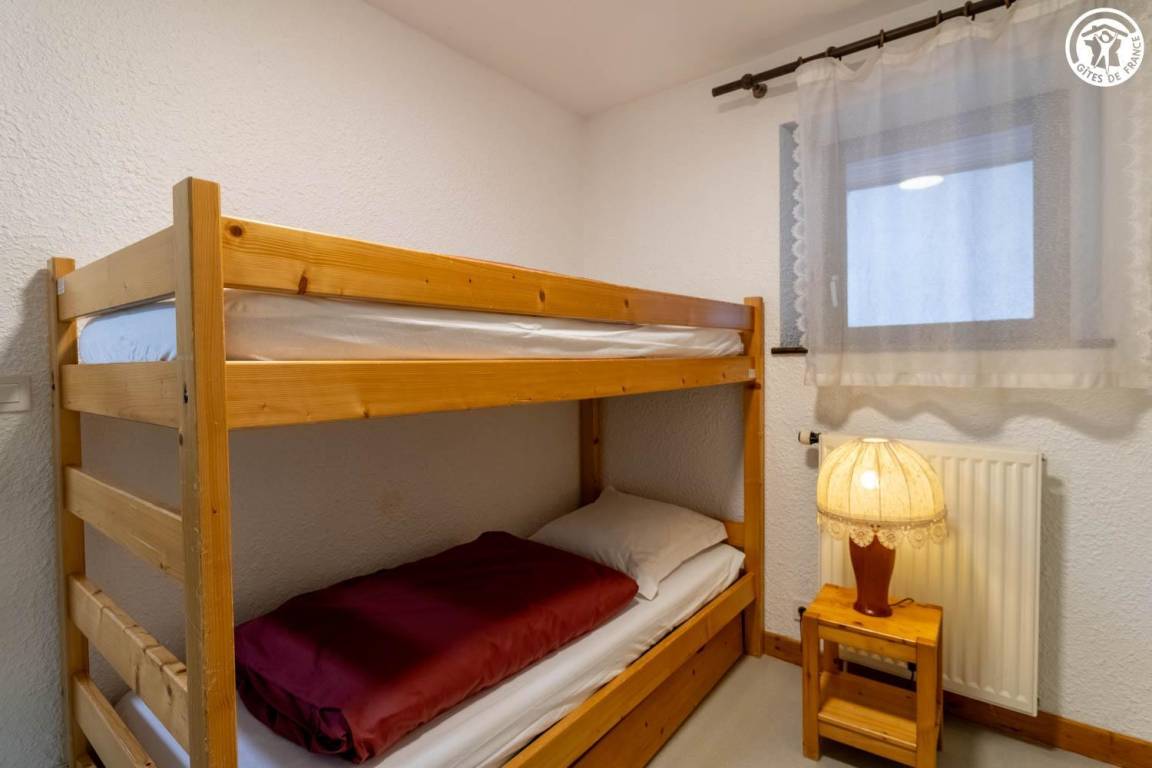 Wohnung im 1. Stock eines Hauses mit 2 weiteren Unterkünften. 1. Stock: Wohnküche mit 1 Ausziehbett 140x190 cm, 2 Schlafzimmer (1 Doppelbett 140x190 und 1 Einzeletagenbett 90x190 cm / 2 Einzeletagenbetten 90x190 cm), Duschbad. Gemeinsamer Waschraum im Keller.