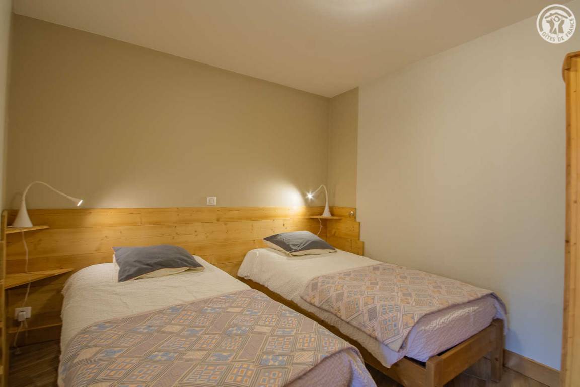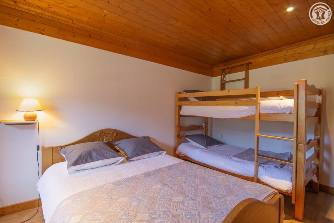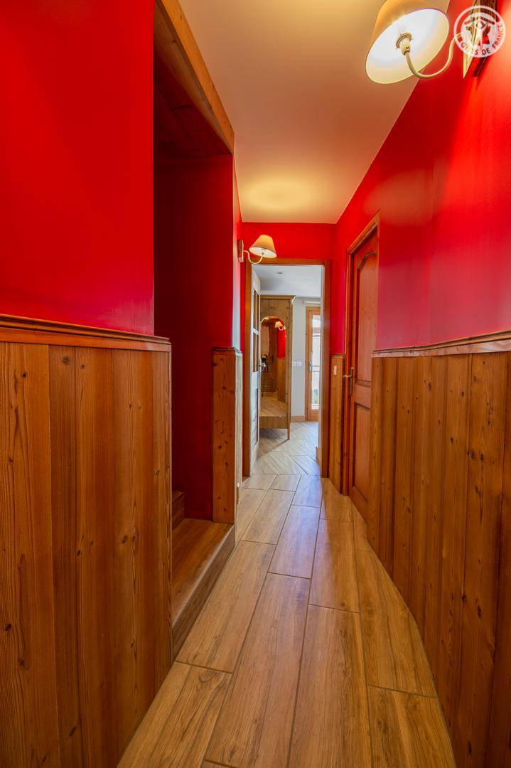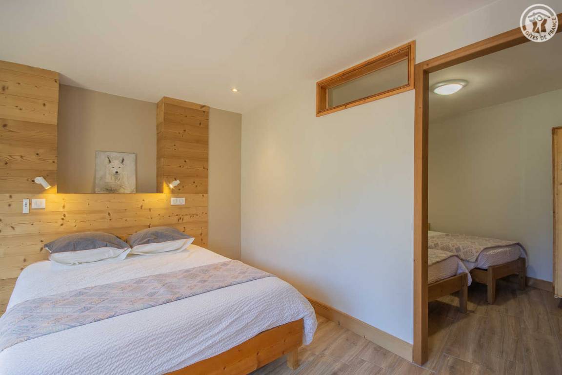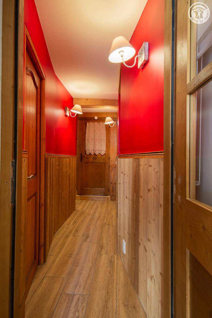 Gîte auf 3 Ebenen (Erdgeschoss + 1. + 2. Stock) in einem Reihenhaus. Erdgeschoss: Eingangshalle, 1 Schlafzimmer mit gewölbter Decke (1 Doppelbett). 1. Stock: separates WC mit Waschbecken. 2. Stock: Wohnküche, Wohnzimmer, eine Familiensuite mit 2 miteinander verbundenen Schlafzimmern, von denen 1 ein zweites Tagesfenster hat (1 Doppelbett und 2 Einzelbetten), 1 Schlafzimmer mit Waschbecken (2 Einzel-Etagenbetten und 1 Doppelbett). Personen), 2 Schlafzimmer (2 Etagenbetten / 1 Doppelbett). 3 Duschräume (davon eine begehbare Dusche) und 2 separate WCs mit Waschbecken. 2 Balkone + privater eingezäunter Garten. Skiraum mit elektrischem Schuhtrockner.