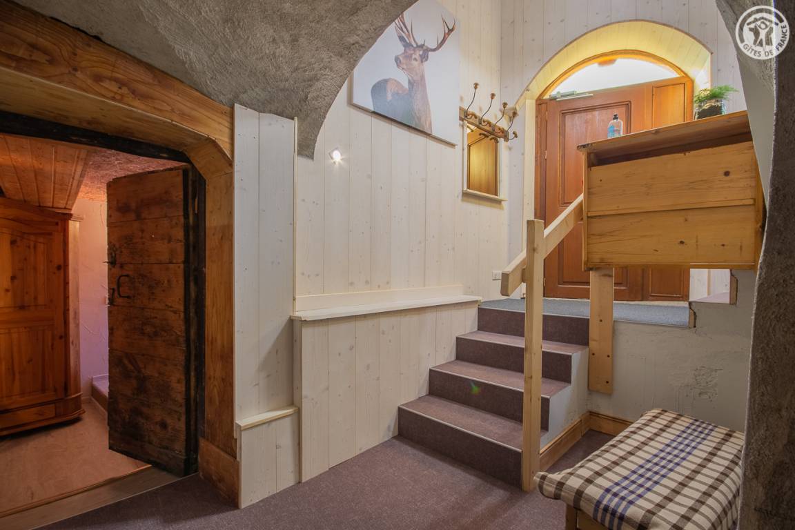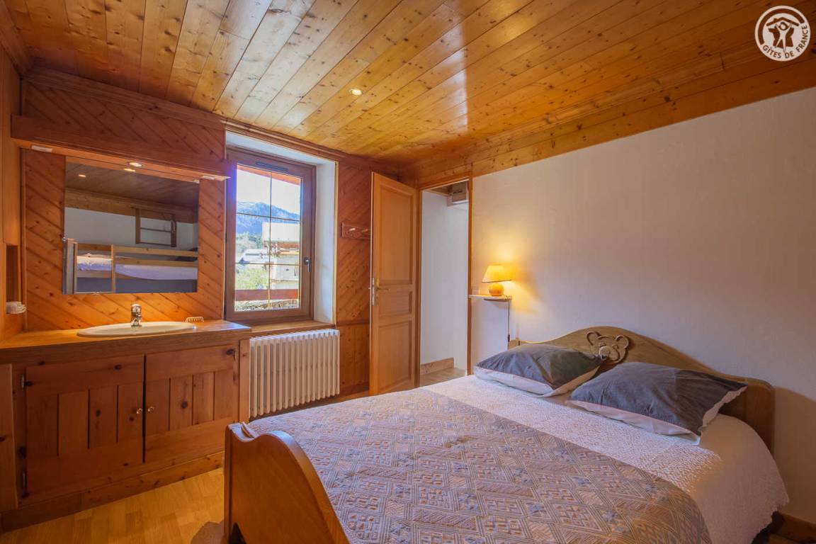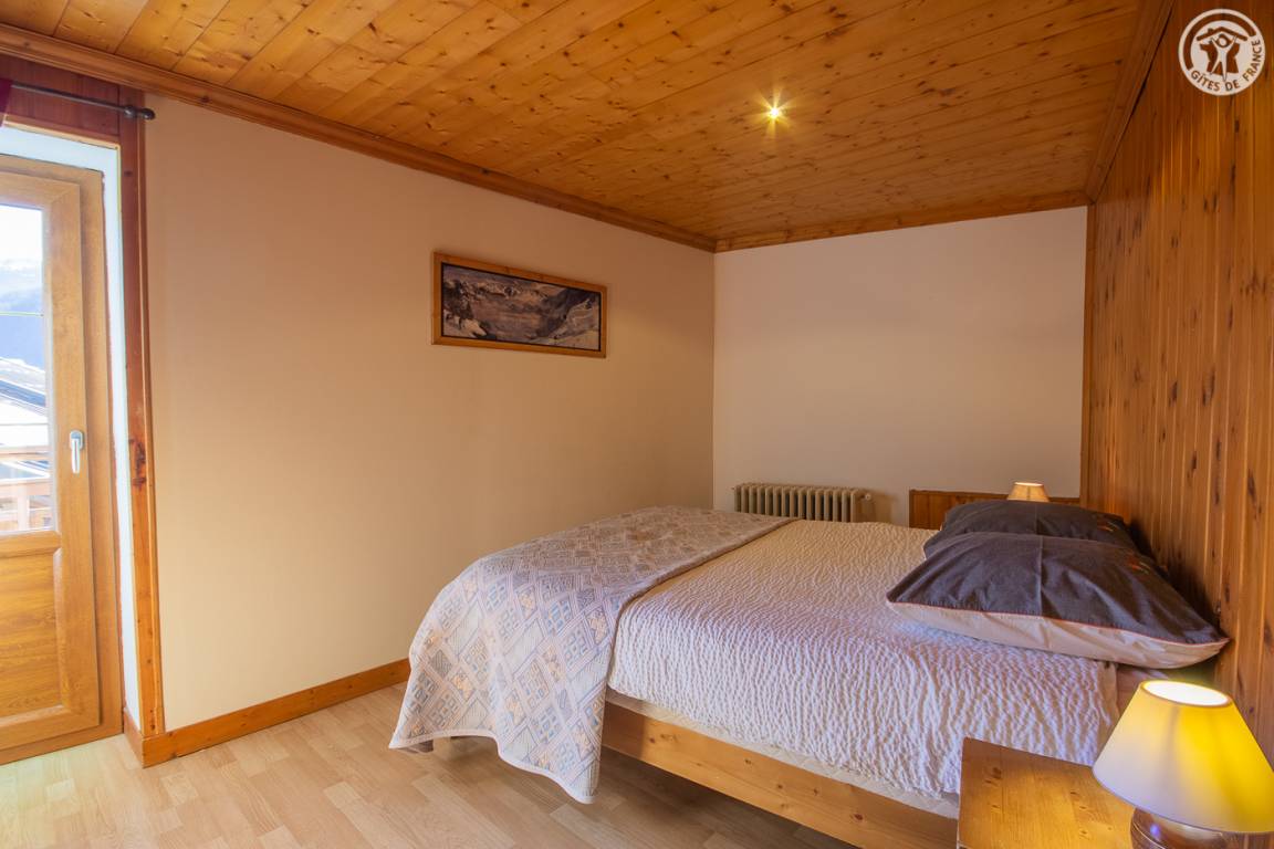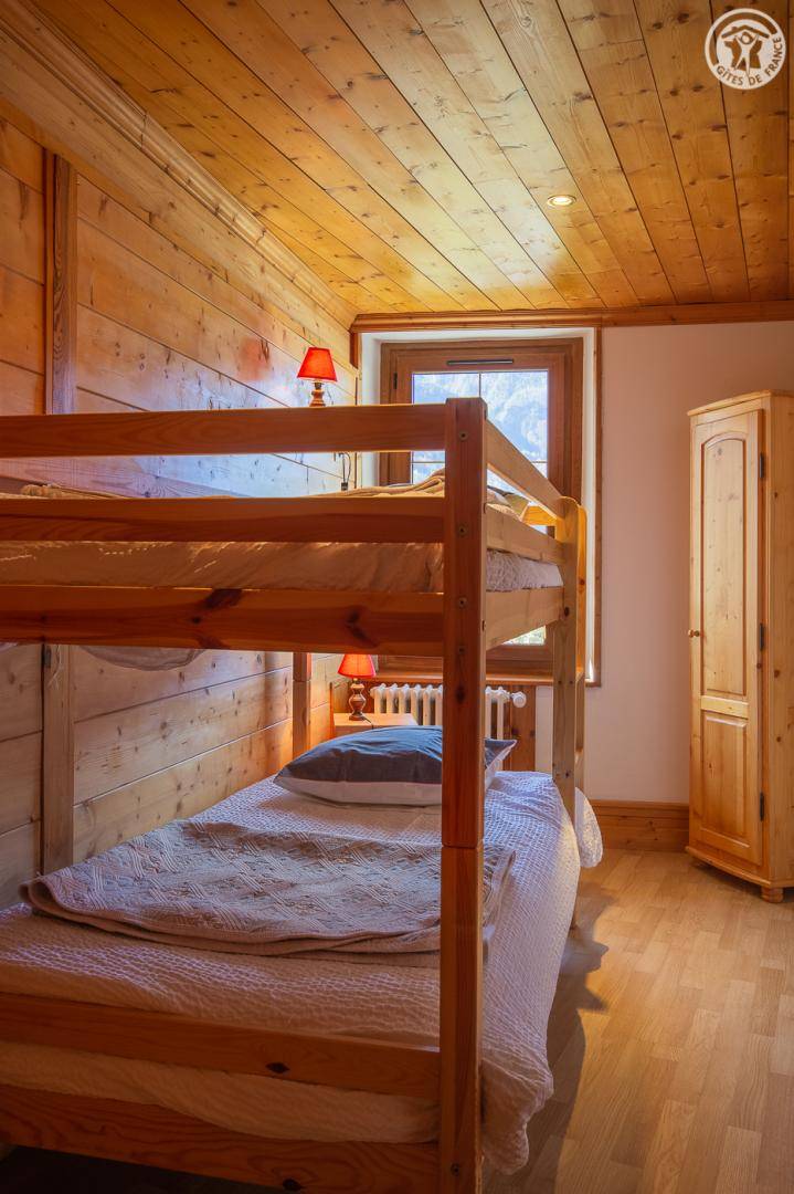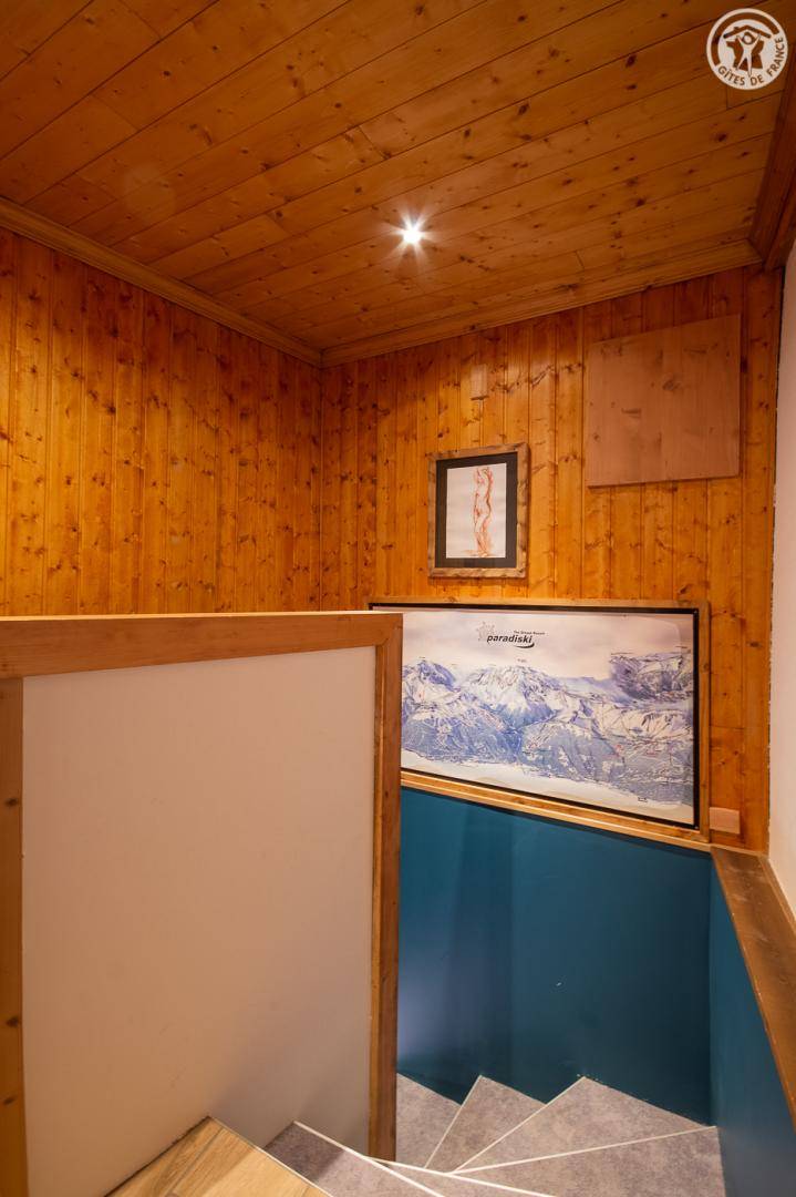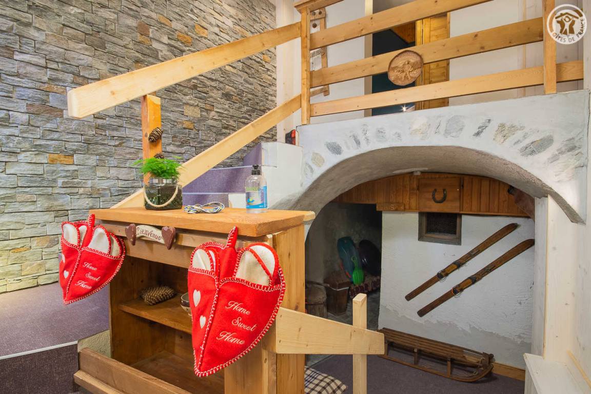 Gîte auf 3 Ebenen (Erdgeschoss + 1. + 2. Stock) in einem Reihenhaus. Erdgeschoss: Eingangshalle, 1 Schlafzimmer mit gewölbter Decke (1 Doppelbett). 1. Stock: separates WC mit Waschbecken. 2. Stock: Wohnküche, Wohnzimmer, eine Familiensuite mit 2 miteinander verbundenen Schlafzimmern, von denen 1 ein zweites Tagesfenster hat (1 Doppelbett und 2 Einzelbetten), 1 Schlafzimmer mit Waschbecken (2 Einzel-Etagenbetten und 1 Doppelbett). Personen), 2 Schlafzimmer (2 Etagenbetten / 1 Doppelbett). 3 Duschräume (davon eine begehbare Dusche) und 2 separate WCs mit Waschbecken. 2 Balkone + privater eingezäunter Garten. Skiraum mit elektrischem Schuhtrockner.