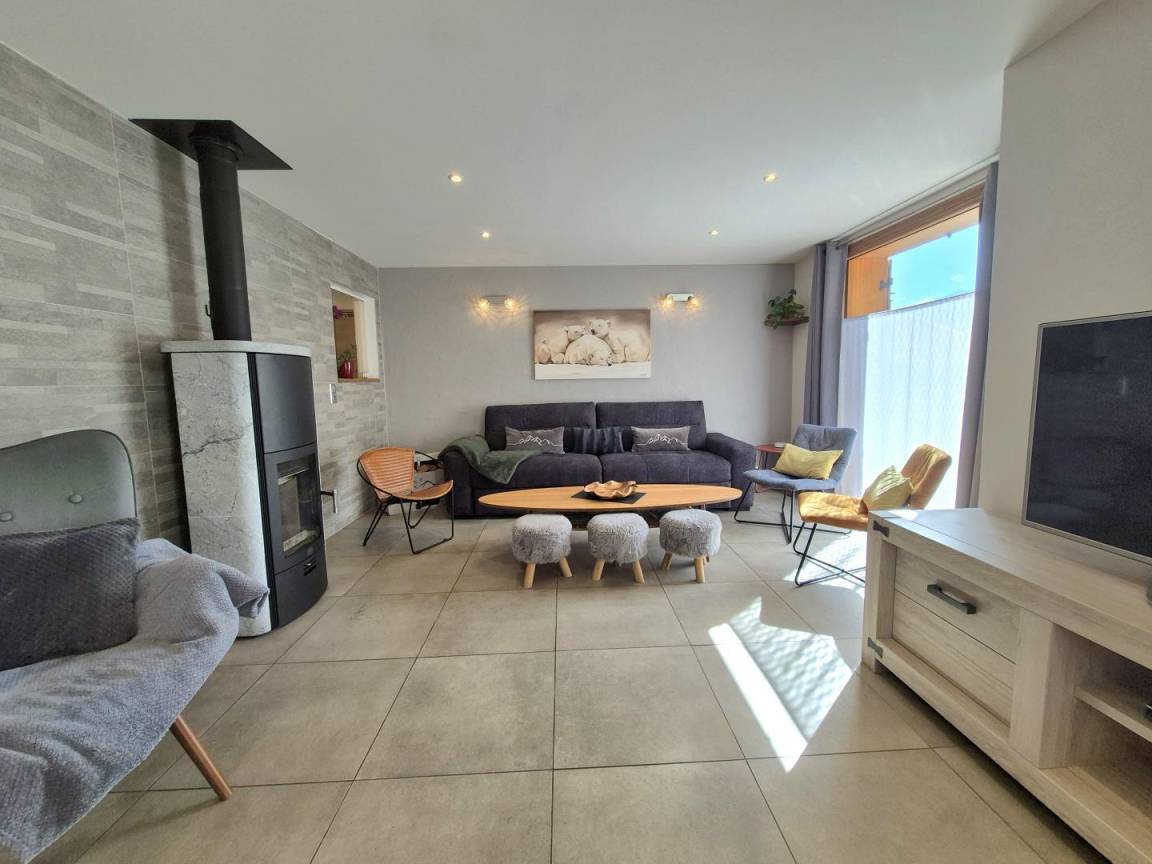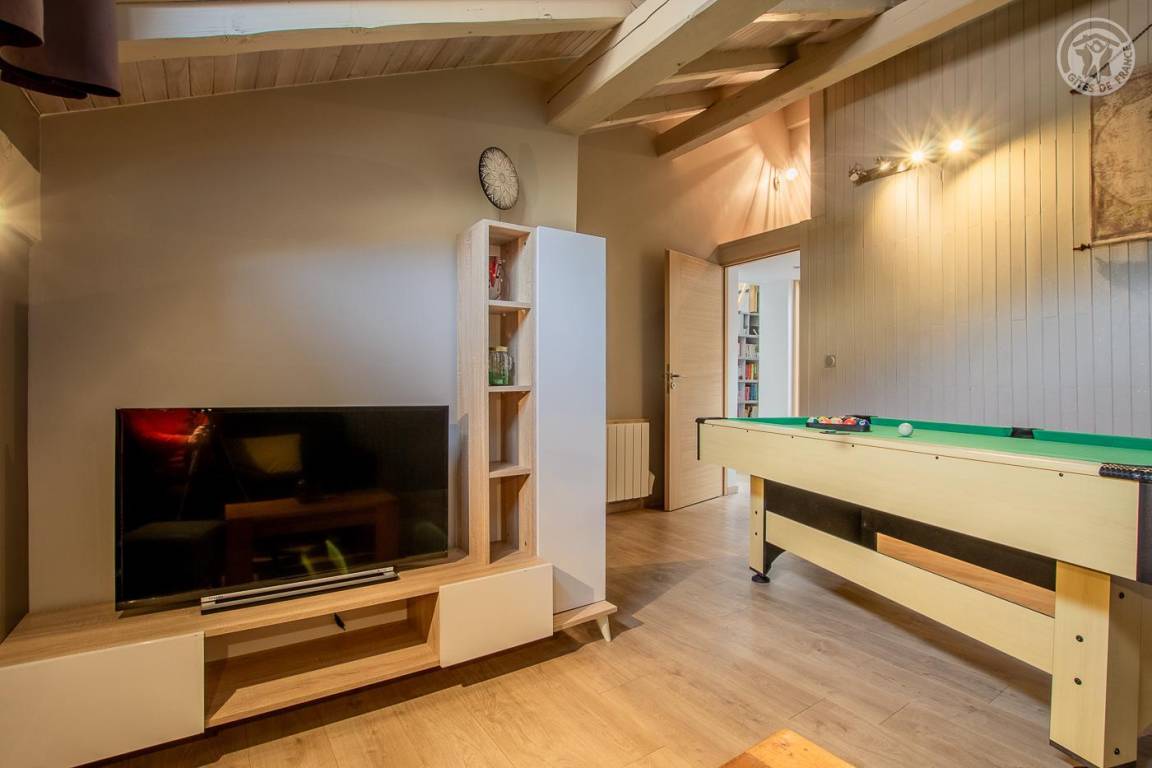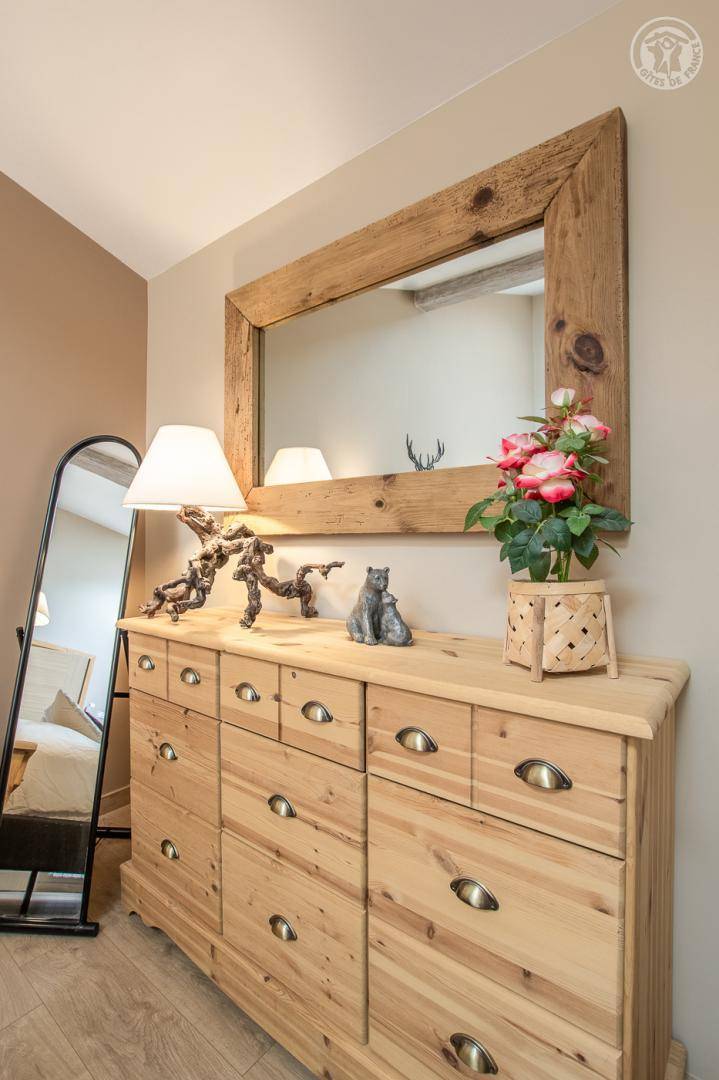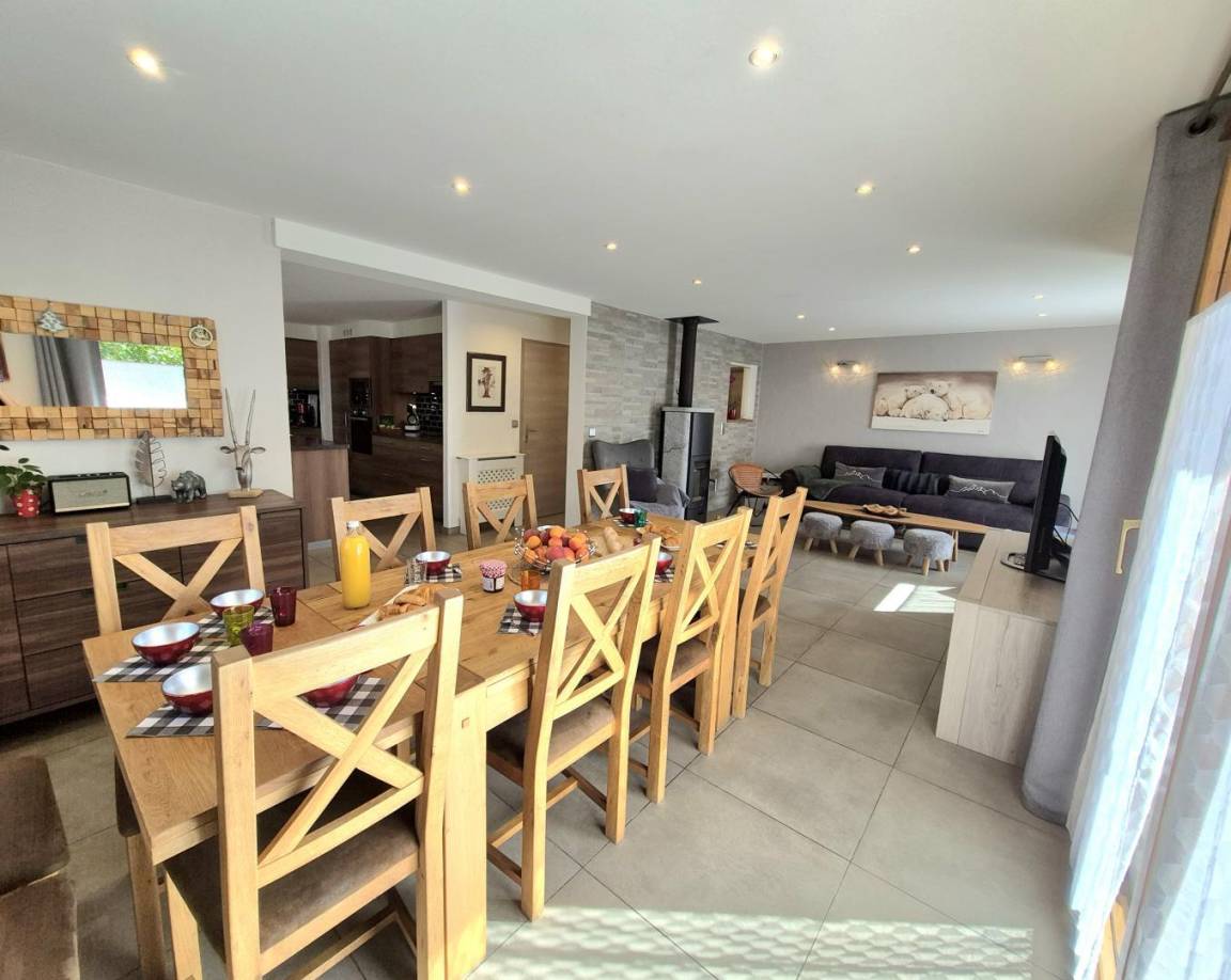 Maisonette-Gîte über der Wohnung der Eigentümer, im 1. und 2. Stock des Hauses (Zugang über eine unabhängige Außentreppe). 1. Etage: Wohnzimmer (Smart-TV) und offene Küche (Zugang zu Terrasse und Garten auf einer Ebene), 1 Schlafzimmer (1 Doppelbett 160 x 200 cm), Badezimmer mit Badewanne und Dusche, separates WC, Ruhebereich mit Infrarotsauna u Tischfußball. 2. Etage: 4 Schlafzimmer (1 Doppelbett 160 x 200 cm/1 Doppelbett 160 x 200 cm/1 Doppelbett 140 x 190 cm mit 1 Babybett/2 Einzelbetten 90 x 200 cm), davon 1 mit TV und eigenem Bad und 1 Zwischengeschoss/Schlafbereich mit Zugang über die Müllertreppe (1 Doppelbett 140 x 190 cm – Höhe unter 1,80 m), 1 separates WC, Ruhebereich mit Billard. Großer freiliegender Balkon, große Terrasse und privater umzäunter Garten mit privatem Spa für 6 Personen. Alles inklusive (Bettwäsche und Endreinigung). Brennholz wird bereitgestellt (Dezember bis April).