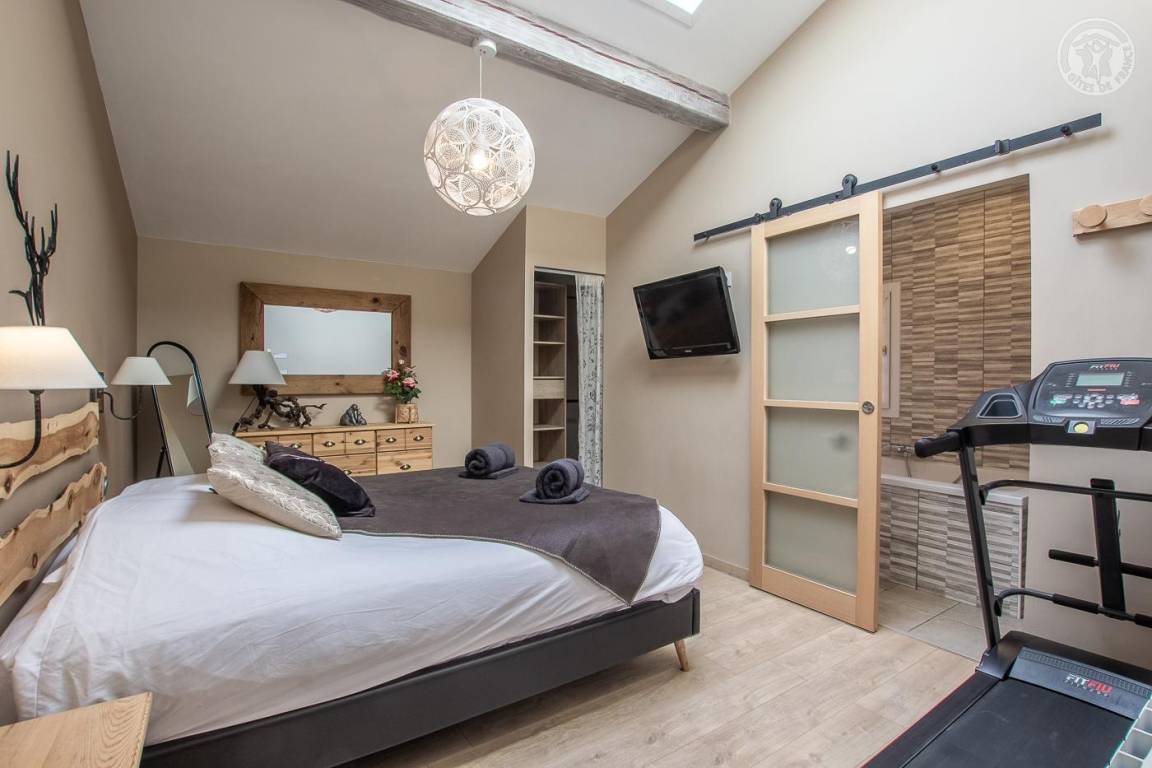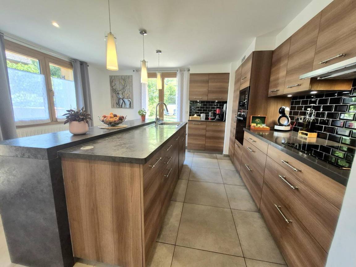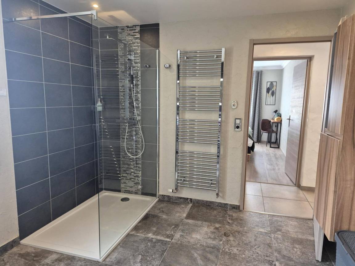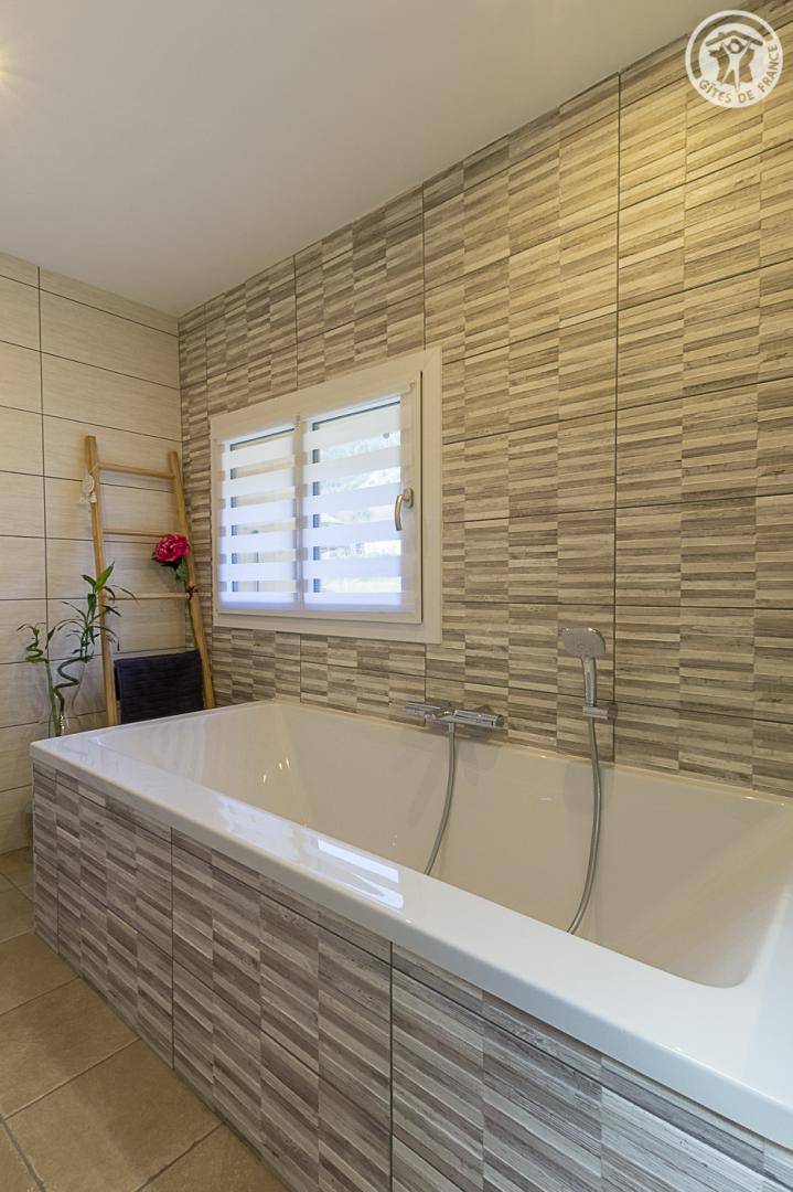 Maisonette-Gîte über der Wohnung der Eigentümer, im 1. und 2. Stock des Hauses (Zugang über eine unabhängige Außentreppe). 1. Etage: Wohnzimmer (Smart-TV) und offene Küche (Zugang zu Terrasse und Garten auf einer Ebene), 1 Schlafzimmer (1 Doppelbett 160 x 200 cm), Badezimmer mit Badewanne und Dusche, separates WC, Ruhebereich mit Infrarotsauna u Tischfußball. 2. Etage: 4 Schlafzimmer (1 Doppelbett 160 x 200 cm/1 Doppelbett 160 x 200 cm/1 Doppelbett 140 x 190 cm mit 1 Babybett/2 Einzelbetten 90 x 200 cm), davon 1 mit TV und eigenem Bad und 1 Zwischengeschoss/Schlafbereich mit Zugang über die Müllertreppe (1 Doppelbett 140 x 190 cm – Höhe unter 1,80 m), 1 separates WC, Ruhebereich mit Billard. Großer freiliegender Balkon, große Terrasse und privater umzäunter Garten mit privatem Spa für 6 Personen. Alles inklusive (Bettwäsche und Endreinigung). Brennholz wird bereitgestellt (Dezember bis April).