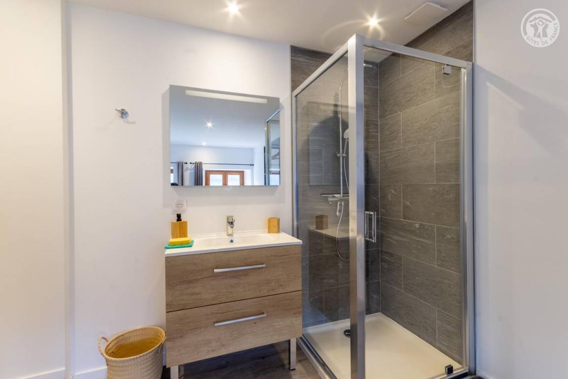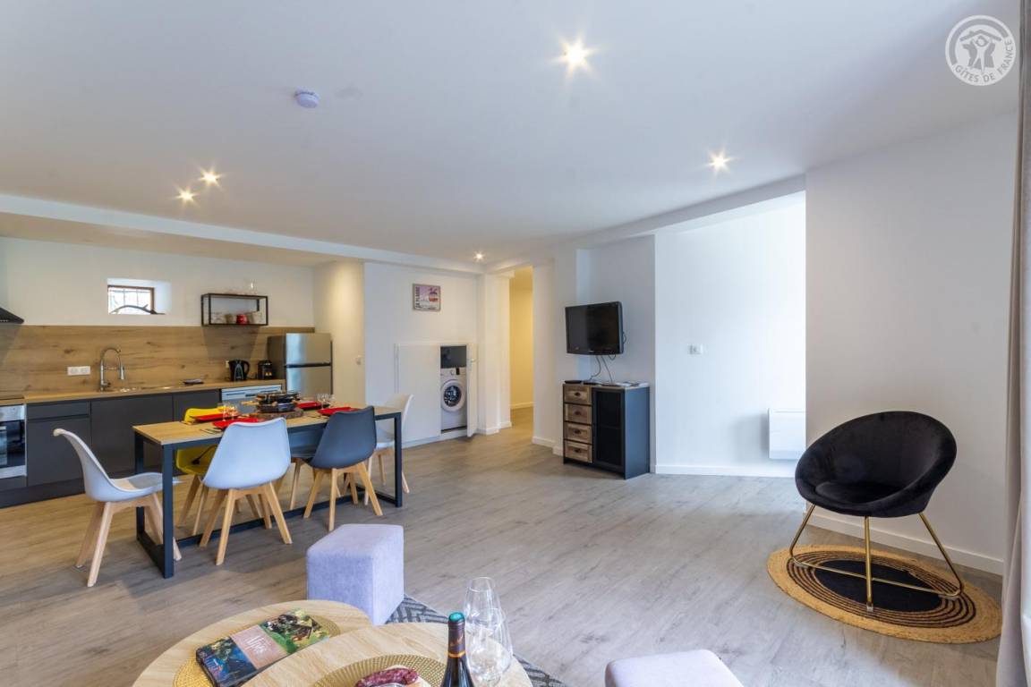 Wohnung im ersten Stock eines Dorfhauses. Zugang über eine Treppe. 1. Stock: Wohnzimmer - Wohnzimmer - Küche mit Zugang zu einem schmalen Balkon. 2 Schlafzimmer mit offenem Badezimmer (1 Doppelbett 140x190 cm / 1 Doppelbett 140x190 cm). Separates WC. Private Garage für ein Auto. Essbereich auf der Rasenfläche unterhalb der Gîte.