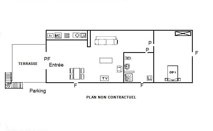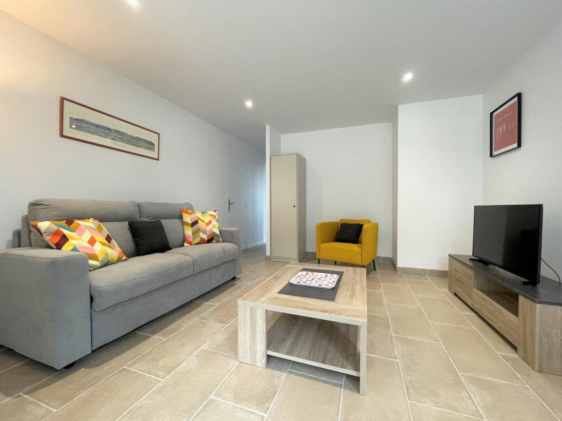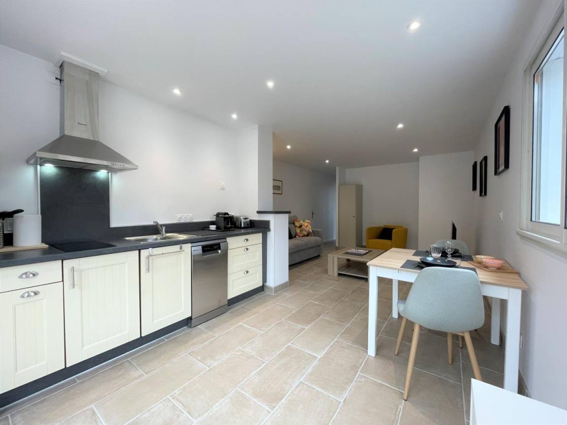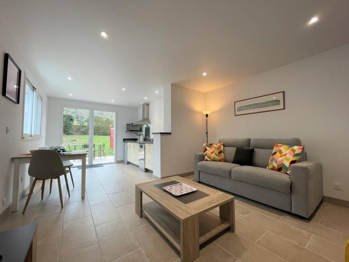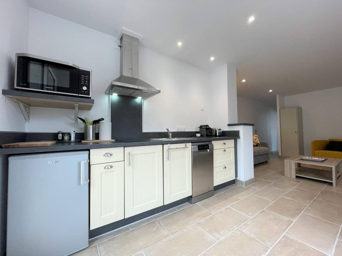 Aufenthaltsraum mit Einbauküche (2 Induktionskochfelder, oberer Kühlschrank, Minibackofen, Geschirrspüler), Wohnzimmer, Wohnbereich (WLAN-Internetverbindung), 1 Schlafzimmer (1 Doppelbett), Duschbad/WC.