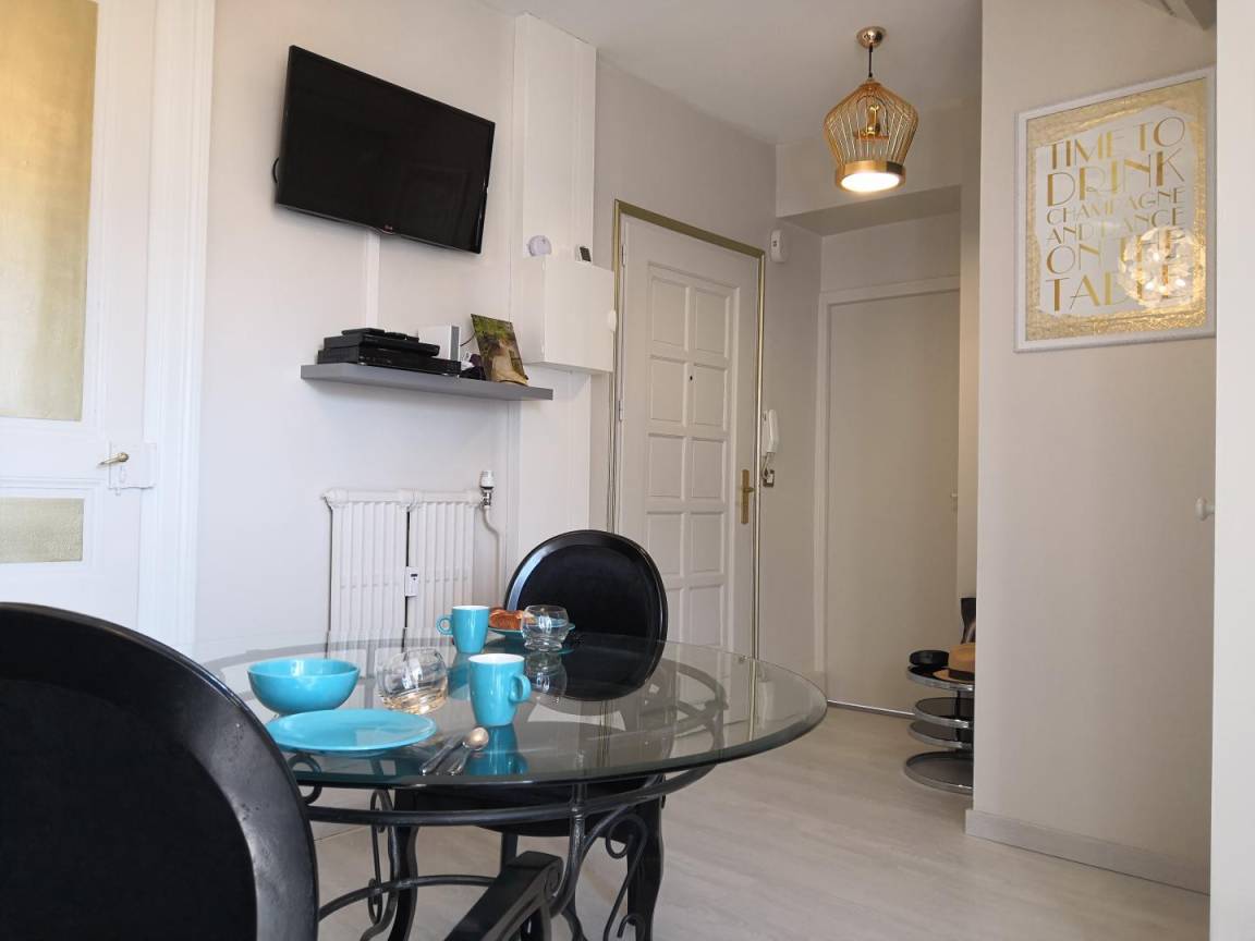 Apartment im Herzen von Aix les Bains, im 4. Stock eines Luxusgebäudes in einer Straße mit vielen Lebensmittelgeschäften und Boutiquen. Aufzug, der den Boden der Wohnung bedient. Angenehme und freie Sicht auf die Dent du Chat. Sehr ruhige Lage. Apartment bestehend aus 1 Wohnzimmer (Küche, Essbereich) und 1 Schlafzimmer (2 Einzelbetten 80 x 200 cm, die zu 1 Doppelbett 160 x 200 cm zusammengestellt werden können). Bettdecke, Bettwäsche inklusive und Betten bei der Ankunft gemacht. Badezimmer (Dusche) mit WC. Handtücher inklusive. WLAN-Internetverbindung. Gebührenpflichtige Parkplätze auf der Straße und überdachter Parkplatz ca. 100 m entfernt. Nur für Aufenthalte von einer Nacht, Frühstück im Preis inbegriffen.
