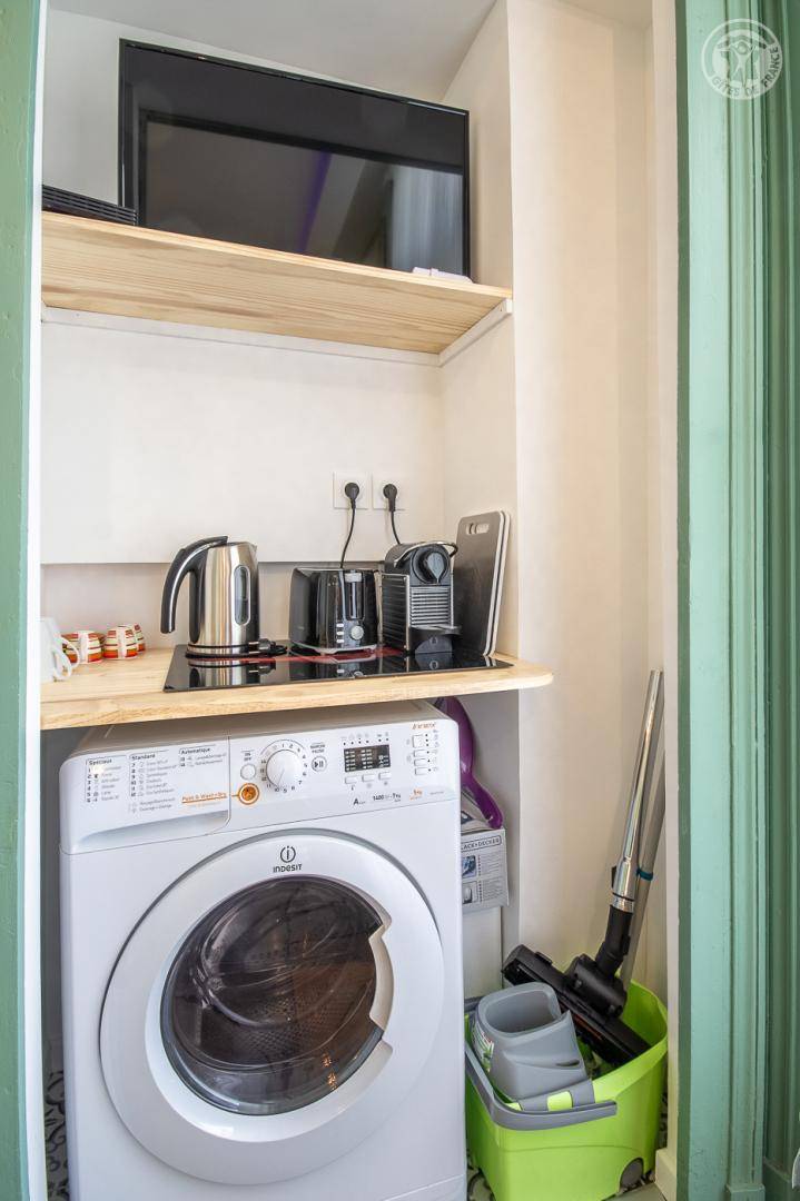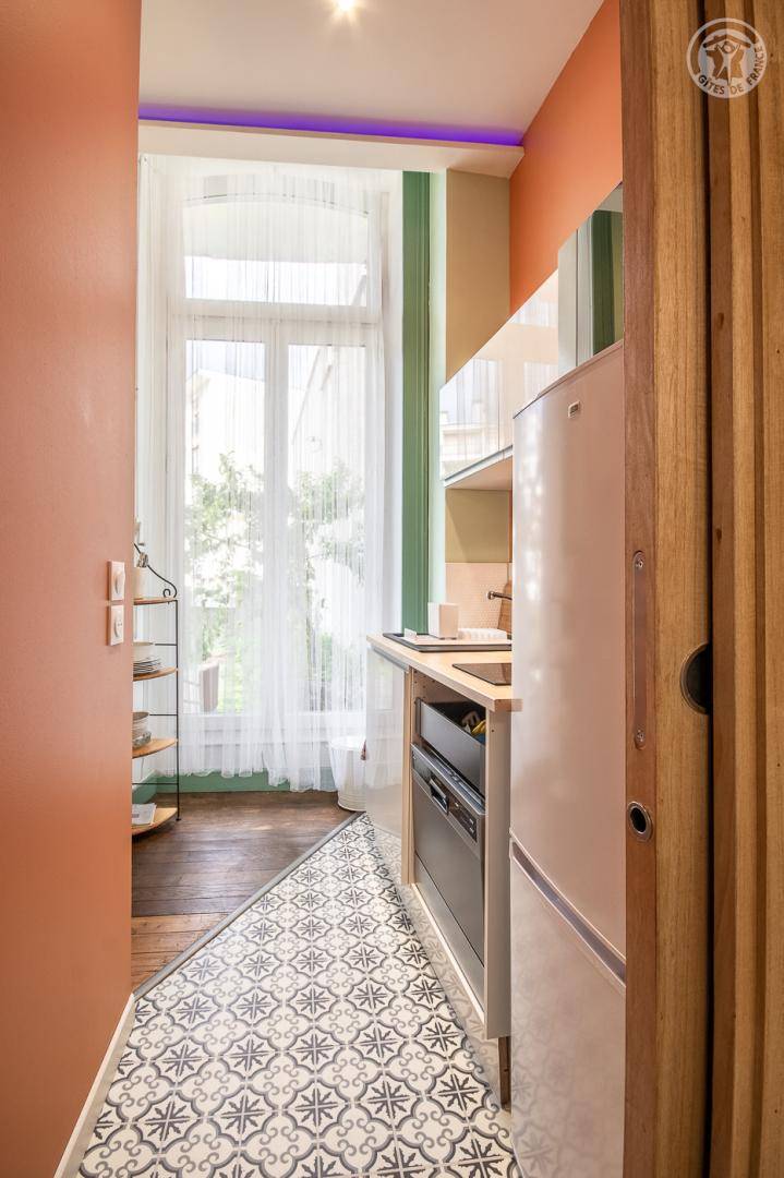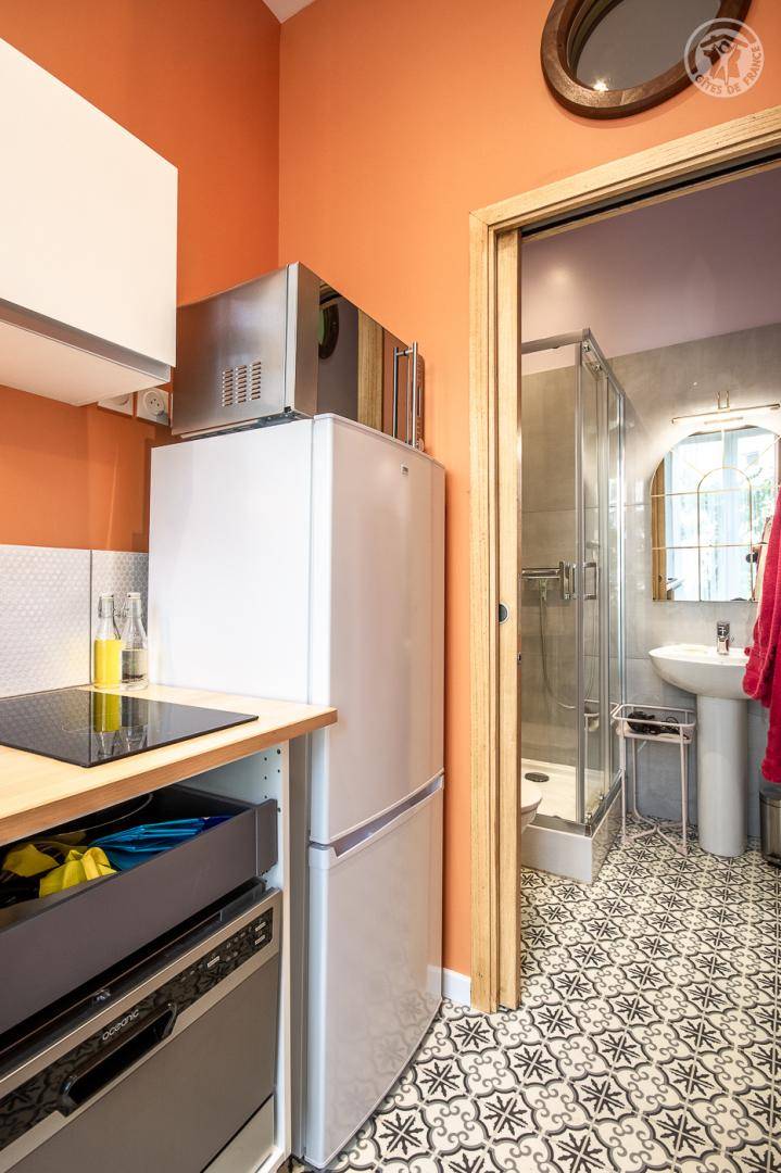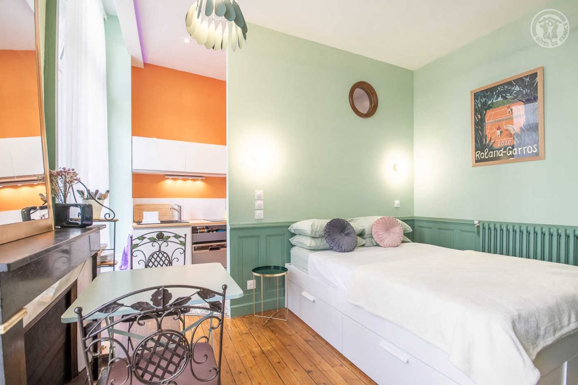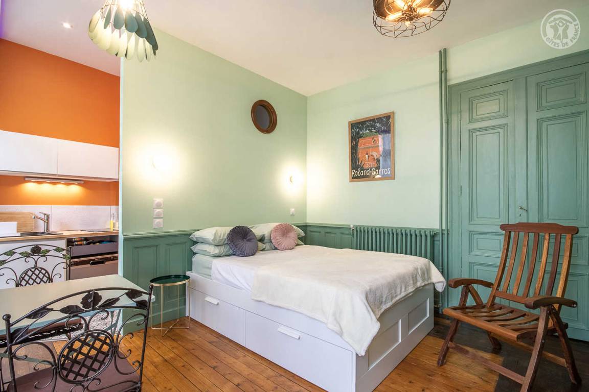 Studio im Erdgeschoss eines Gebäudes (Zugang über 2 Stufen) , darunter ein Wohnzimmer mit einem Doppelbett 140 x 190 cm (Memory - Schaum - Matratze), eine halb separate Küche mit Kühlschrank, 2 Kochplatten Induktion, ein kombinierte Mikrowelle mit Grill, ein Badezimmer mit WC und Waschtrockner. Fernsehen über die Internetbox mit Radio und USB-Buchse, Bluetooth-Lautsprecher. Terrasse und Garten der Wohnanlage (Zugang über 2 Stufen). Kostenpflichtiges Parken auf der Straße oder in der 100 m entfernten Tiefgarage.