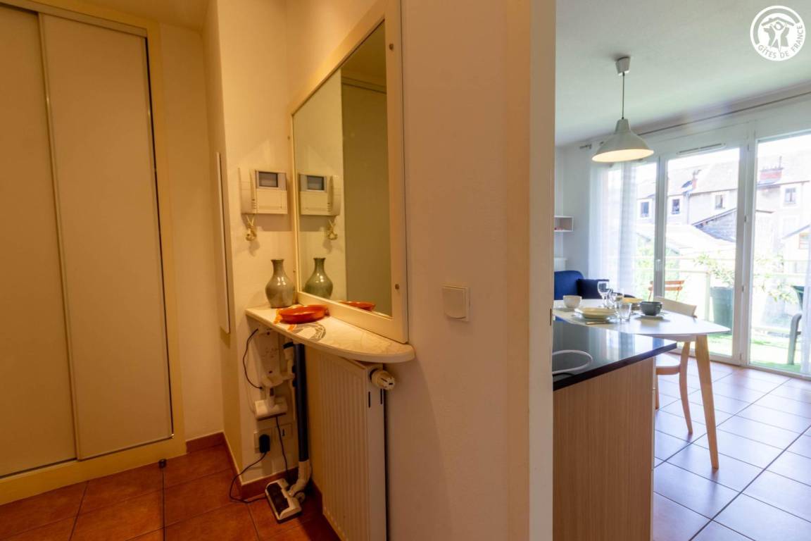 Wohnung im 3. Stock einer Residenz im Zentrum von Aix les Bains. 3. Etage: Eingang, Küche mit Sitzecke (1 Schlafsofa 120x190 cm), 1 Schlafzimmer (1 Doppelbett 140x190 cm), Duschbad mit WC (Dusche). Terrasse. Garage gegen Aufpreis.
