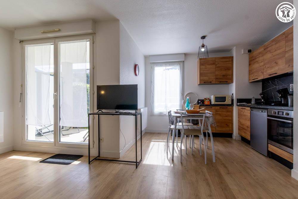 Apartment in einer sicheren, abgeschlossenen Wohnanlage mit 45 Wohnungen. Die Erdgeschosswohnung verfügt über ein Wohnzimmer mit Kochnische, ein Schlafzimmer (mit einem Doppelbett, 140 x 190 cm), ein Badezimmer mit Badewanne und ein separates WC. Die Nutzung eines gemeinschaftlichen, unbeheizten Pools ist von Mitte Juni bis Mitte September möglich. Ein privater Parkplatz ist vorhanden. Bettwäsche und Handtücher werden gestellt. Das Bett ist bei Ankunft bezogen. Innerhalb der Anlage befindet sich ein gemeinschaftlicher Fahrradabstellraum.