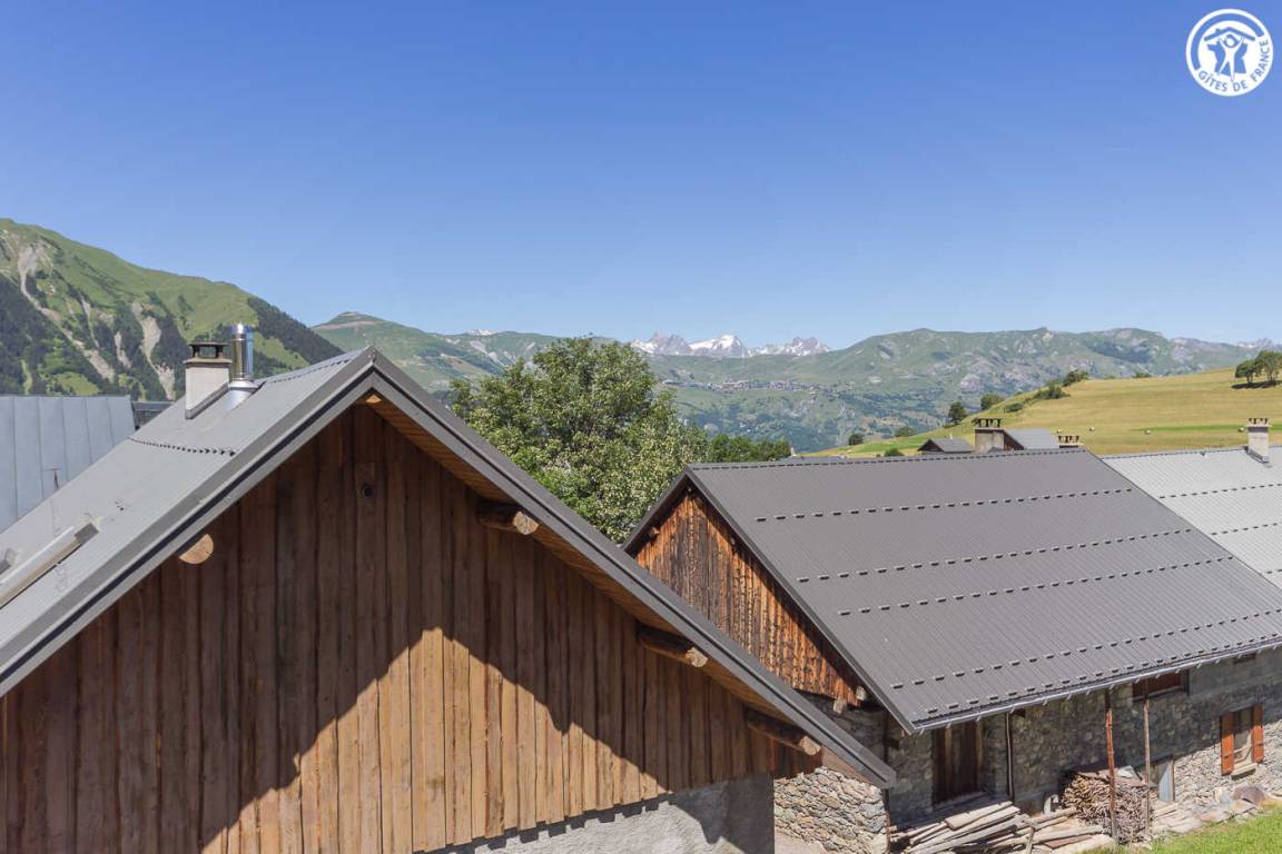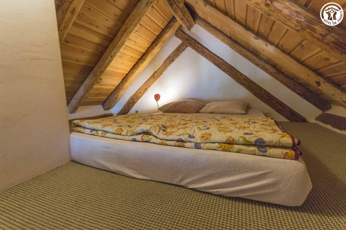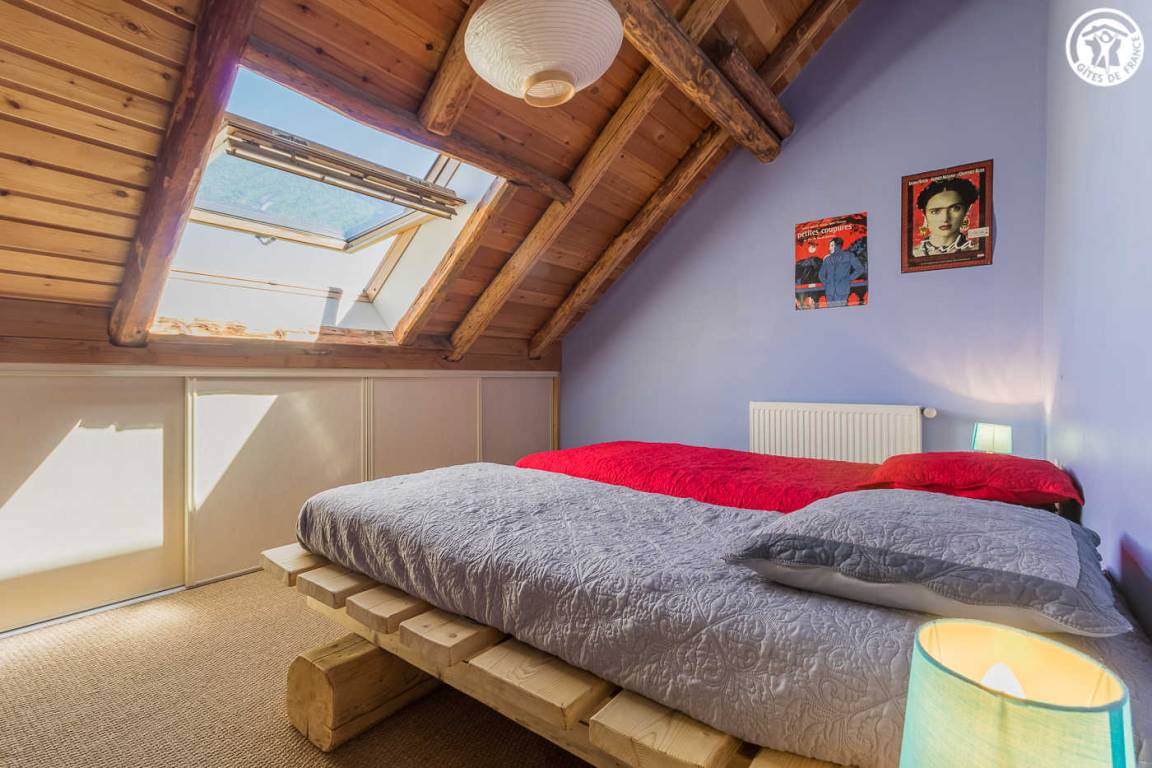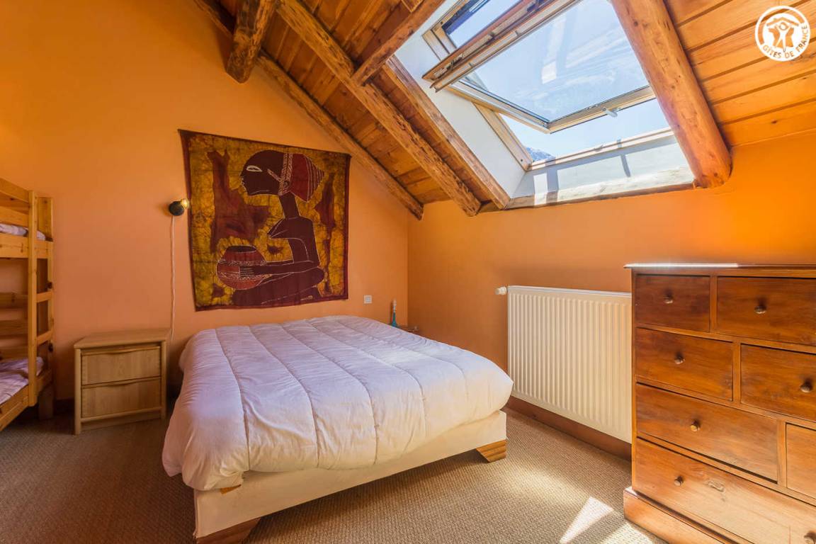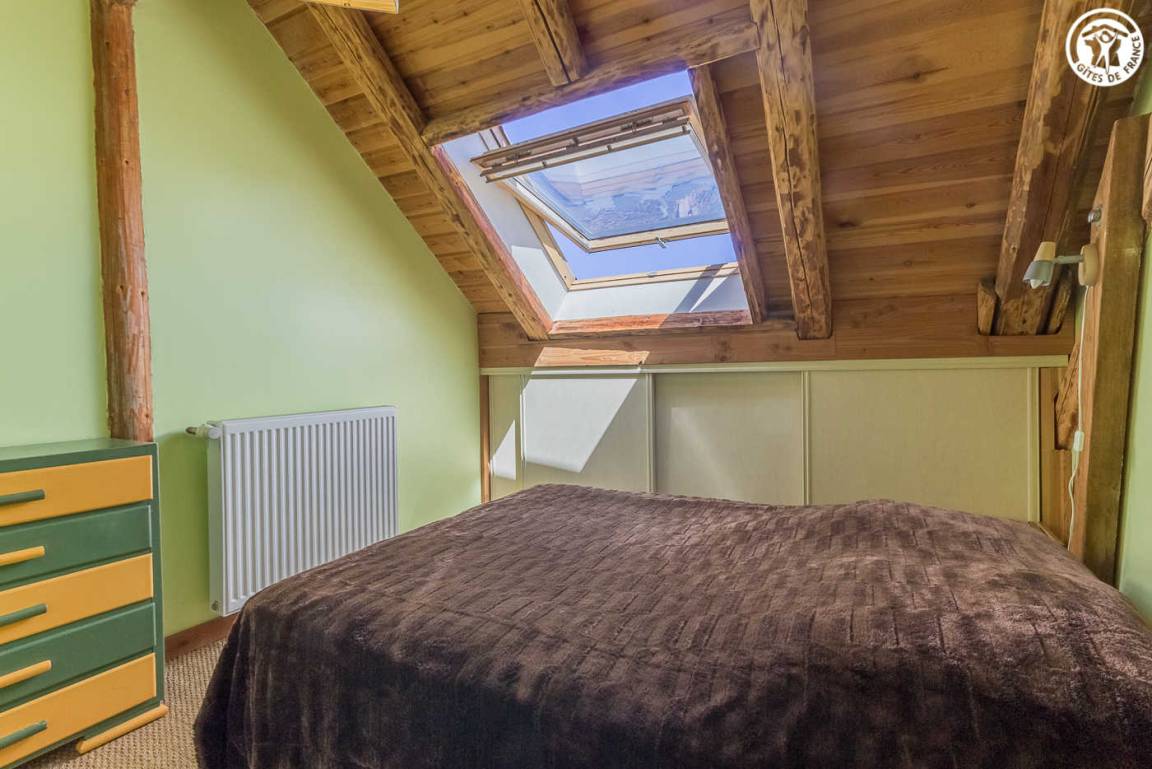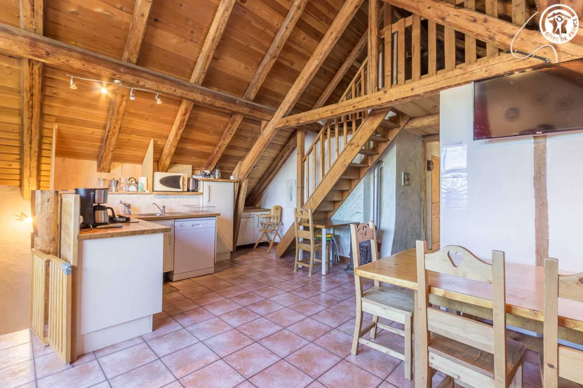 Chalet mit 2 Gîtes. Die Wohnung befindet sich im Dachgeschoss mit separatem Eingang über eine Außentreppe. Angenehme private Süd-West-Terrasse. Wohnzimmer mit Küche während des Aufenthalts. Großer Erker mit freiem Blick auf die Berge. 3 Schlafzimmer (2 Einzelbetten / 1 Doppelbett + 2 Einzelbetten / 1 Doppelbett). 2 Badezimmer mit Dusche und WC. Ski- und Fahrradraum.