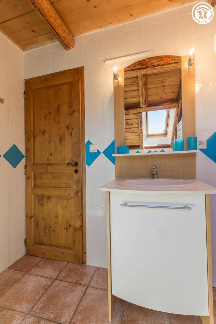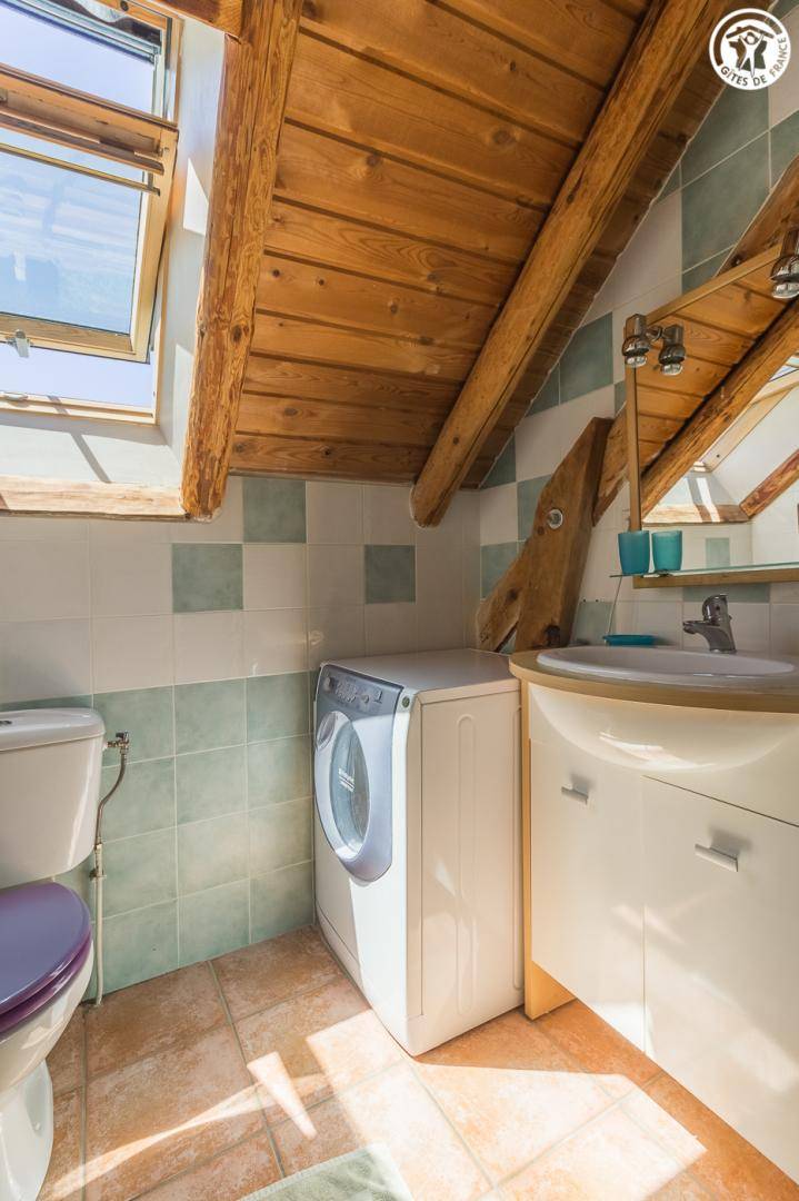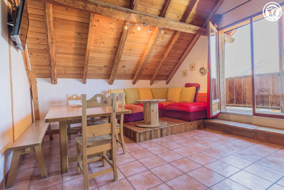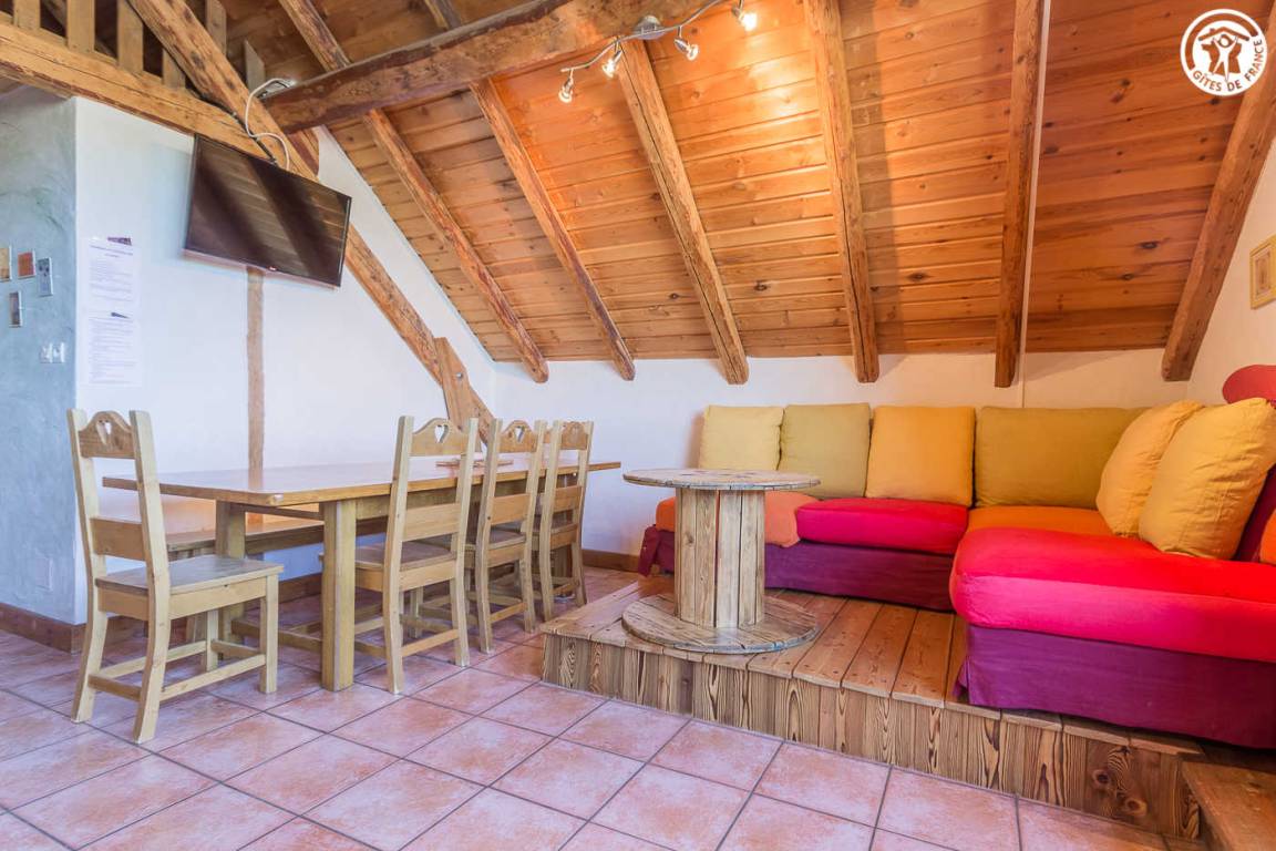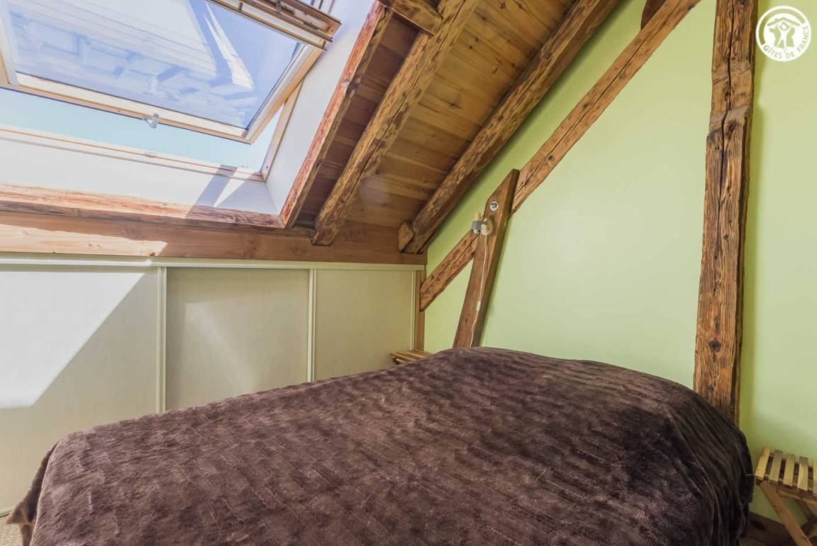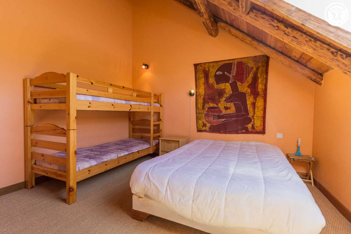 Chalet mit 2 Gîtes. Die Wohnung befindet sich im Dachgeschoss mit separatem Eingang über eine Außentreppe. Angenehme private Süd-West-Terrasse. Wohnzimmer mit Küche während des Aufenthalts. Großer Erker mit freiem Blick auf die Berge. 3 Schlafzimmer (2 Einzelbetten / 1 Doppelbett + 2 Einzelbetten / 1 Doppelbett). 2 Badezimmer mit Dusche und WC. Ski- und Fahrradraum.
