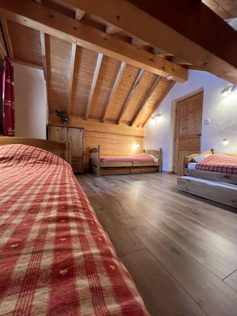 4 Einzelbetten 90 x 190 cm, davon 1 Ausziehbett 80 x 190 cm), Mezzanine (2 Einzel-Ausziehbetten, 2 Einzel-Etagenbetten), Badezimmer (Badewanne mit WC), Duschbad (Dusche), Separates WC. Balkon, gemeinsamer Boden.