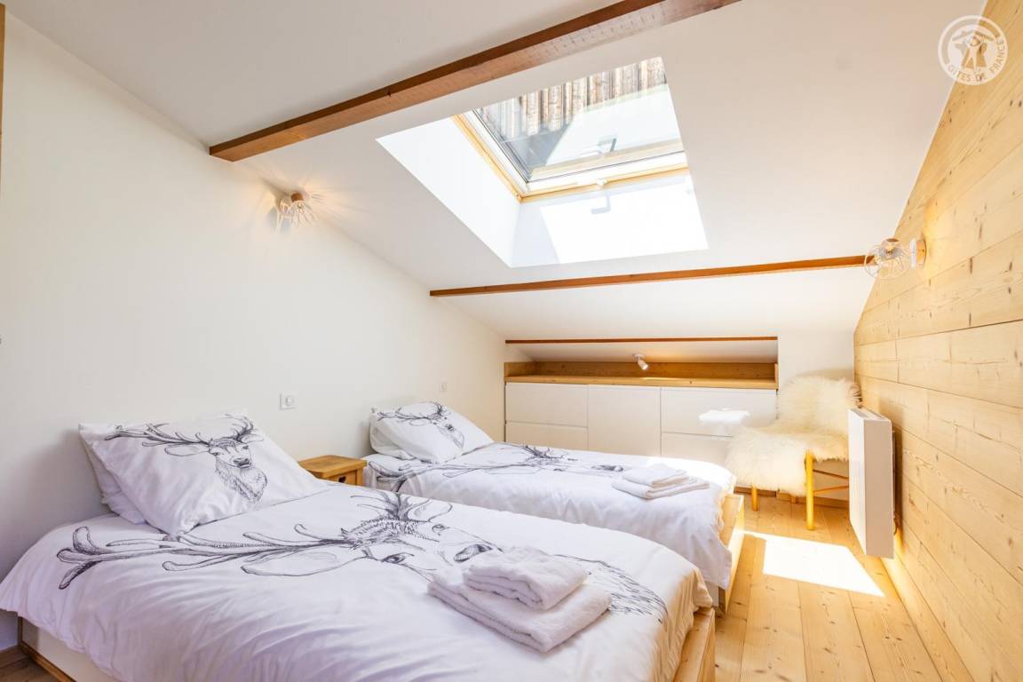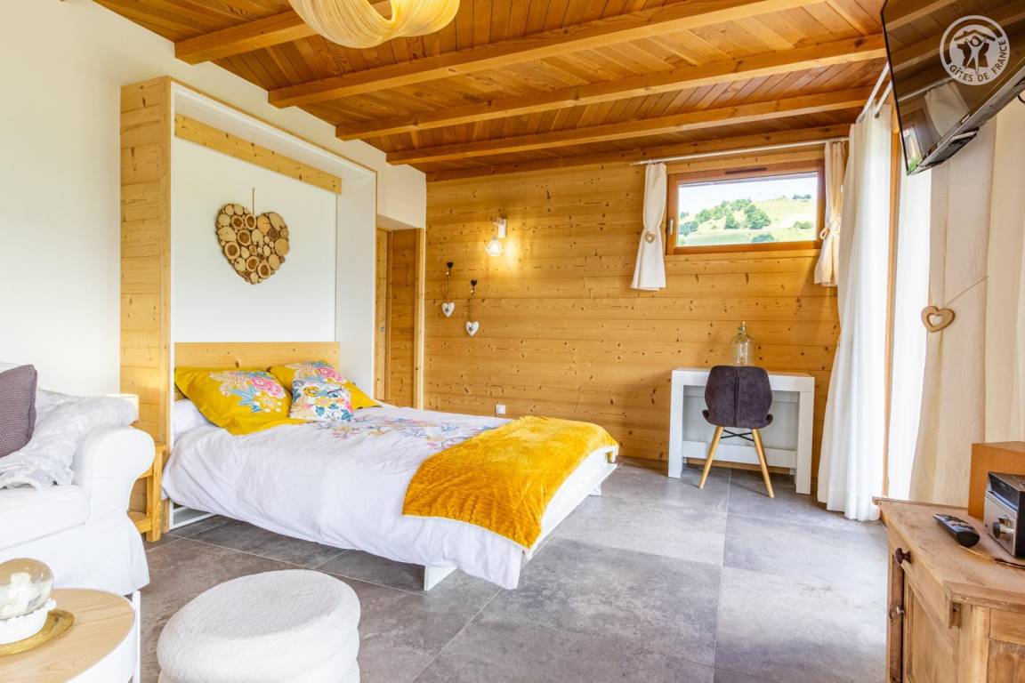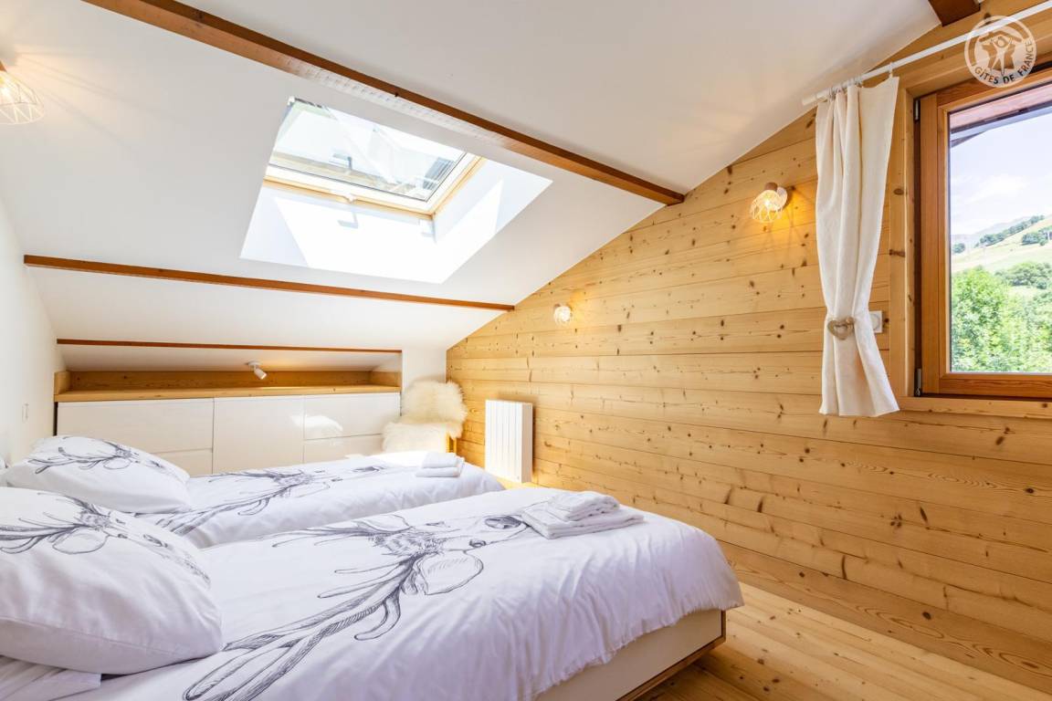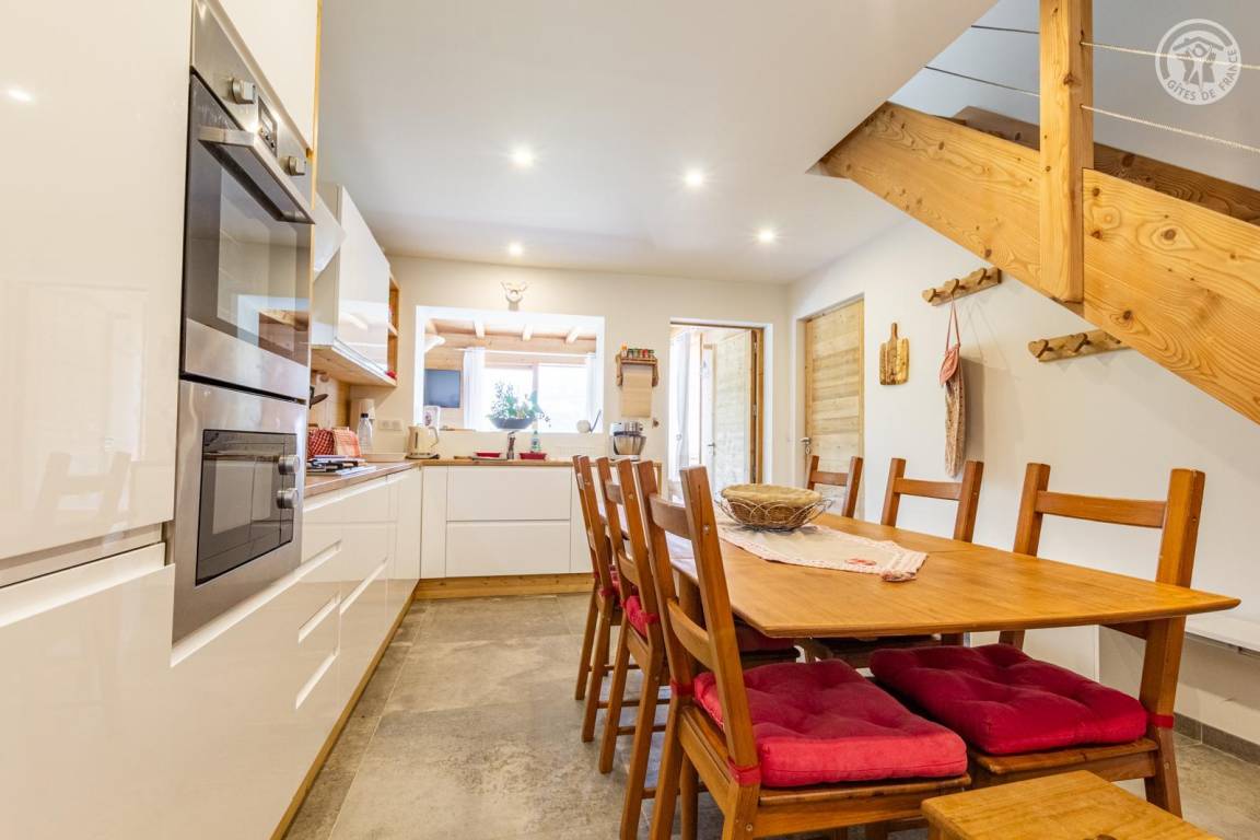 Die Unterkunft besteht aus zwei Gîtes de France-Apartments. Gemeinsamer Eingang im Erdgeschoss, dann Zugang zur Wohnung im Obergeschoss rechts. Wohnzimmer mit einem Doppel-Schrankbett (140x190), Zugang zu einem Badezimmer mit WC. Separate Küche. Im Obergeschoss befinden sich drei Schlafzimmer: eines mit zwei Einzelbetten (90x200), eines mit zwei Einzelbetten (90x190) und eines mit einem Doppelbett (140x190). Duschraum mit WC im Obergeschoss und Treppenabsatz, der als Kinderspielplatz umgebaut wurde. Gemeinsamer, nicht eingezäunter Garten.