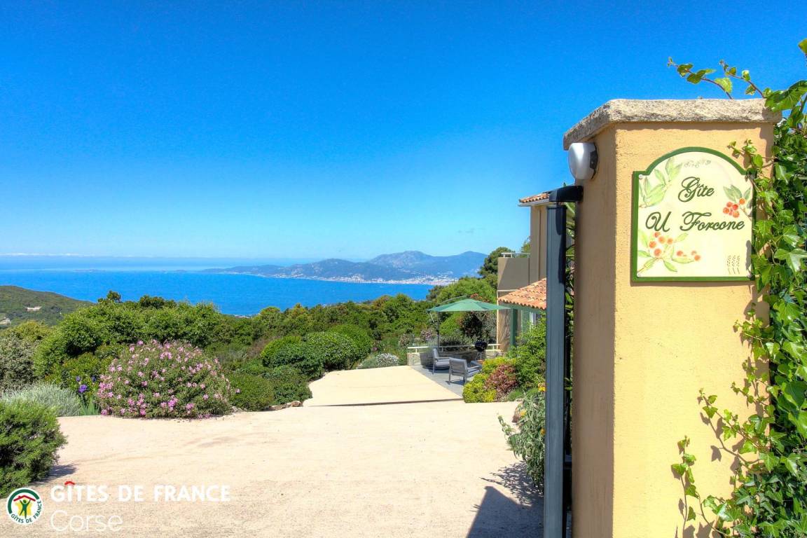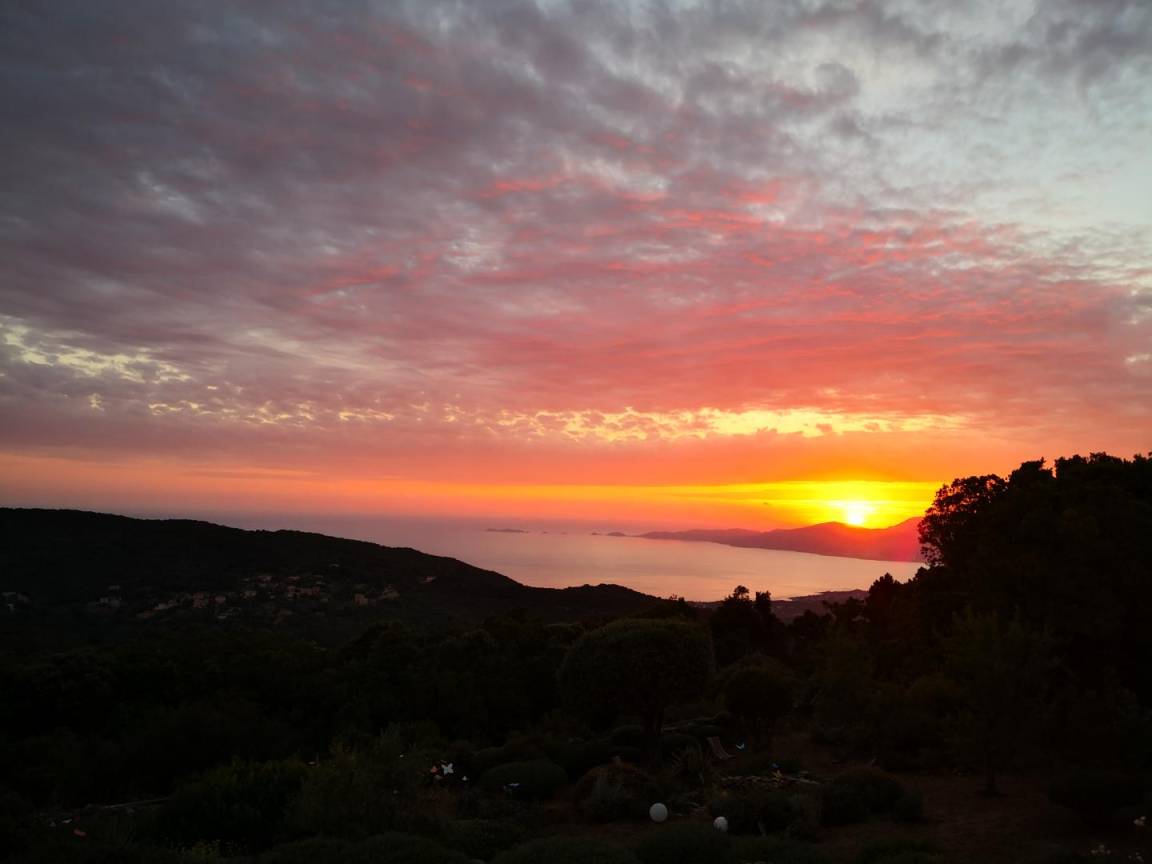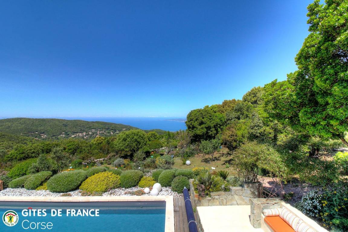 „Vue d'exception sur la baie d'Ajaccio (11 km à vol de "Milan") et les sanguinaires (22 km) du haut des 640 m du gîte de la Fourche (U Forcone). Accueil on ne peut plus chaleureux de Frédérique et Bernard dans leur superbe gite dôté d'un cadre floral et arboré exceptionnel fruit d'une plantation paysagiste et d'un entretien méticuleux. Le plaisir de la visite avec dénomination de toutes les plantations par Frederique qui ne quitte jamais son sécateur pour maintenir les formes...la forme étant asurée par l'arrosage quotidien de Bernard. Une superbe piscine de 10 m avec fond plat continu à 1.20 m d'où l'on peut chaque soir admirer les superbes coucher de soleil sur les sanginaires. Merci à tous deux pour cette convivialité rare. Merci encore pour le conseil de la virée vers les Sanguinaires pour admirer le plongeon du soleil. Grand merci à Migué et Valérie pour ces heures de convivialité et le repas corse sur la poupe après une petite baignade palmes/tuba aux pieds du sémaphore de Mezzu Mare. Avec notre meilleur souvenir. Bien cordialement“