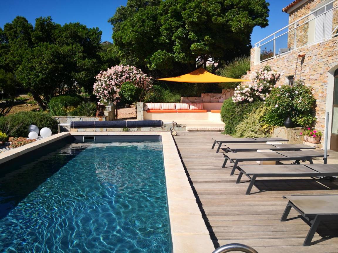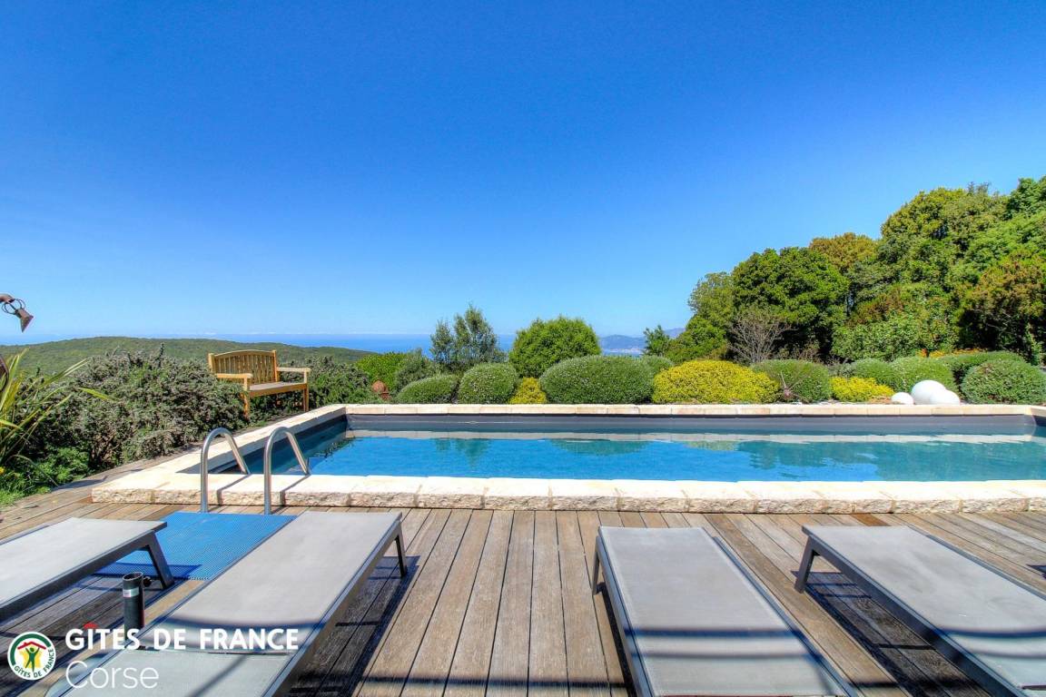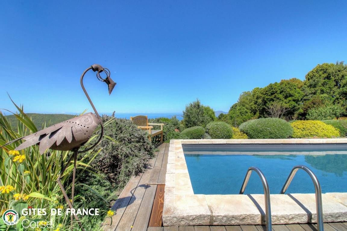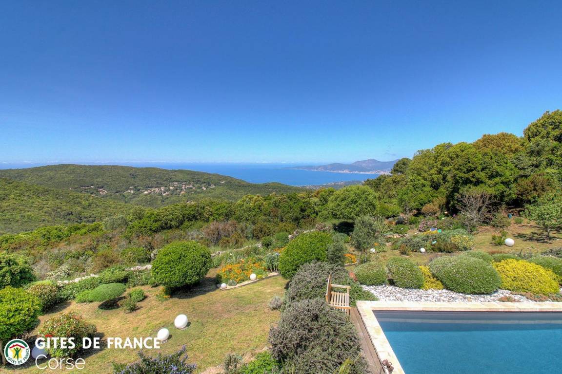 „Vue d'exception sur la baie d'Ajaccio (11 km à vol de "Milan") et les sanguinaires (22 km) du haut des 640 m du gîte de la Fourche (U Forcone). Accueil on ne peut plus chaleureux de Frédérique et Bernard dans leur superbe gite dôté d'un cadre floral et arboré exceptionnel fruit d'une plantation paysagiste et d'un entretien méticuleux. Le plaisir de la visite avec dénomination de toutes les plantations par Frederique qui ne quitte jamais son sécateur pour maintenir les formes...la forme étant asurée par l'arrosage quotidien de Bernard. Une superbe piscine de 10 m avec fond plat continu à 1.20 m d'où l'on peut chaque soir admirer les superbes coucher de soleil sur les sanginaires. Merci à tous deux pour cette convivialité rare. Merci encore pour le conseil de la virée vers les Sanguinaires pour admirer le plongeon du soleil. Grand merci à Migué et Valérie pour ces heures de convivialité et le repas corse sur la poupe après une petite baignade palmes/tuba aux pieds du sémaphore de Mezzu Mare. Avec notre meilleur souvenir. Bien cordialement“