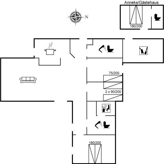 SchlafverhältnisseDie Schlafplätze verteilen sich auf 4 Schlafräume. 4 Schlafplätze in Doppelbetten. 3 Schlafplätze in Einzelbetten. 2 von diesen Schlafplätzen befinden sich im Gästehaus.