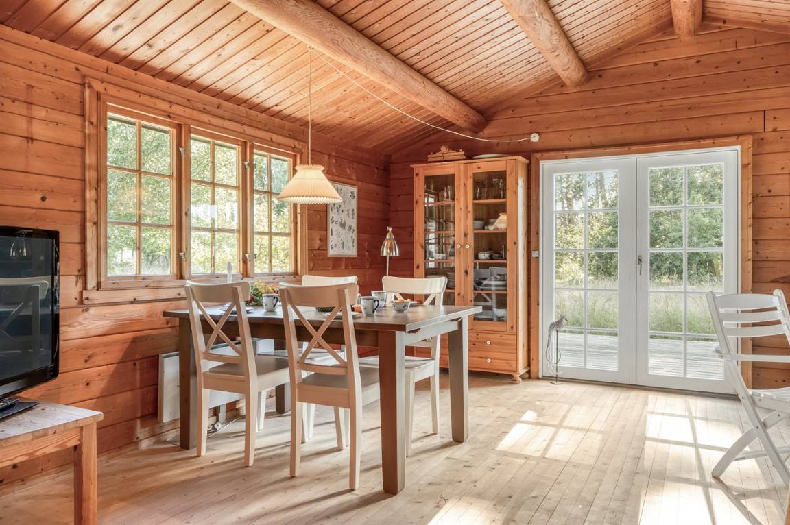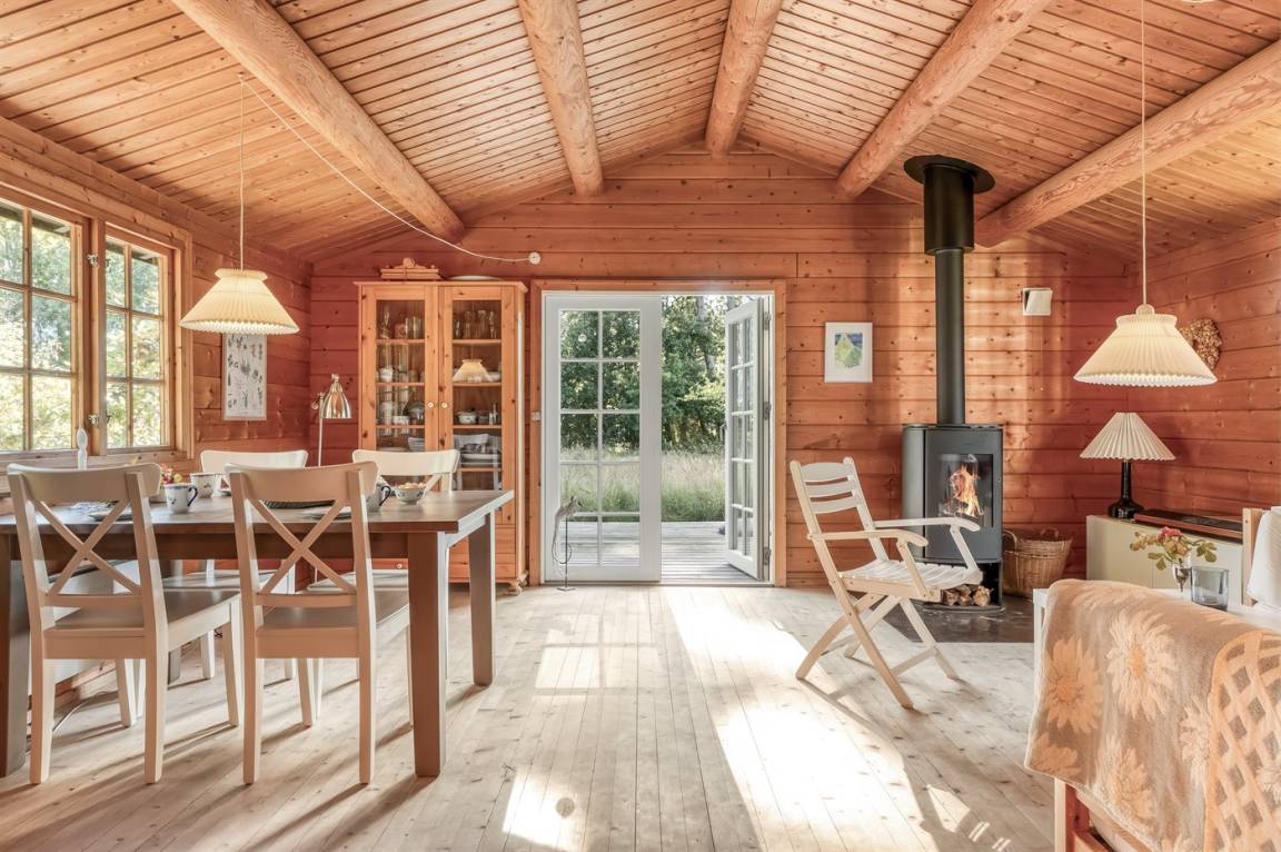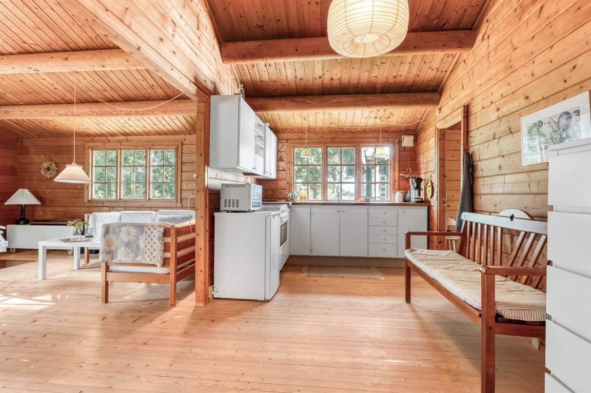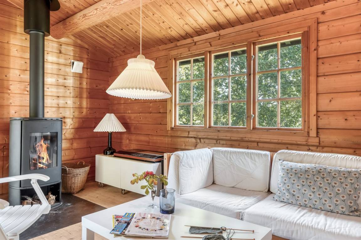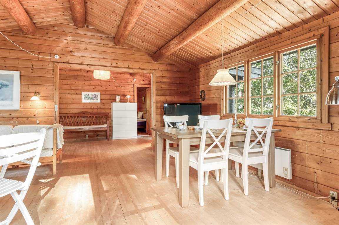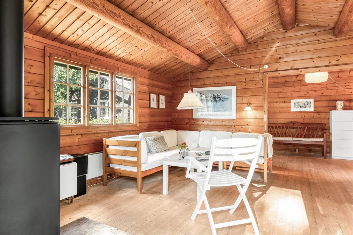 Das Haus ist mit offenen Decken gestaltet und verfügt über 2 geräumige Schlafzimmer, eine offene Küche sowie ein Wohnzimmer mit u. a. Kaminofen. Vom Wohnzimmer aus habt ihr Zugang zur Terrasse, wo ihr die stillen Abende mit gutem Essen vom Grill genießen könnt.