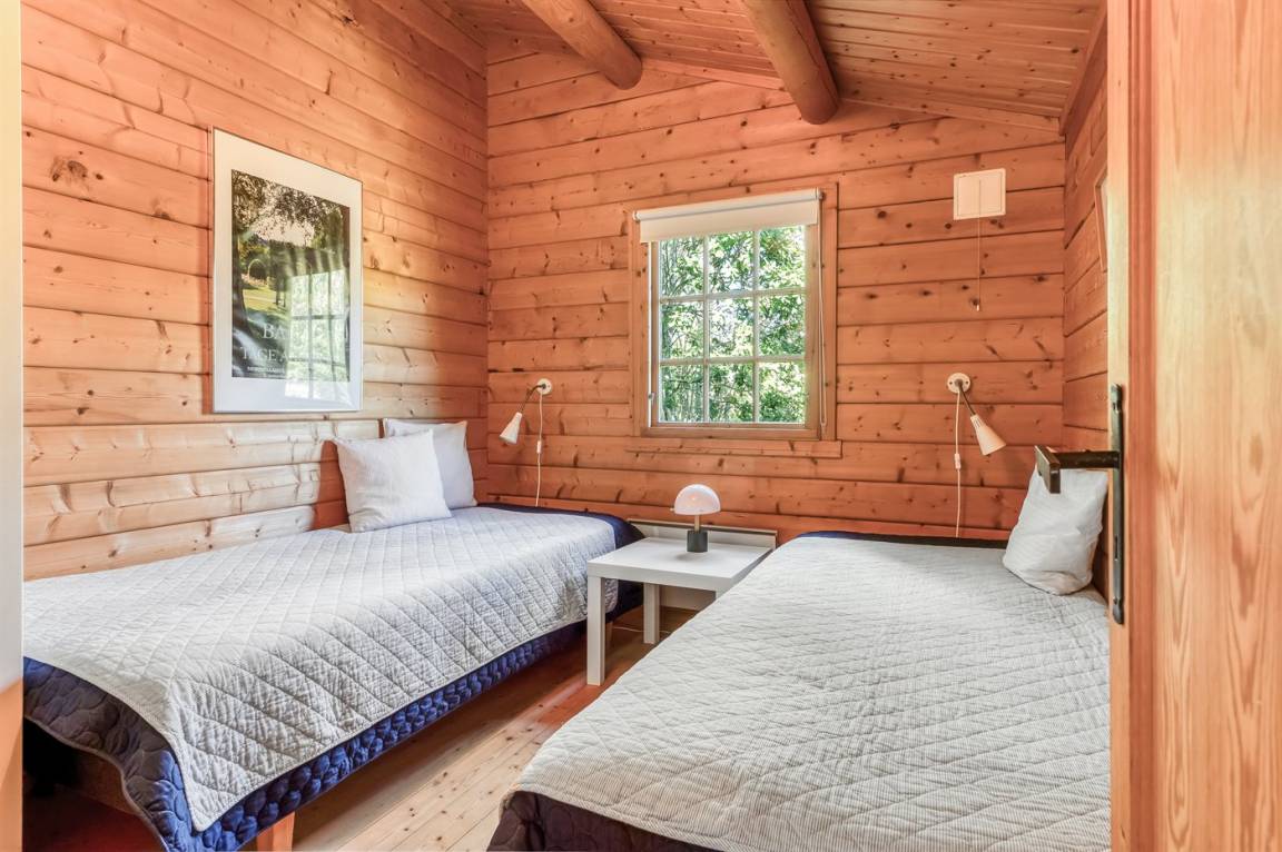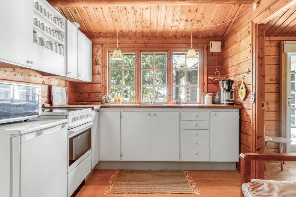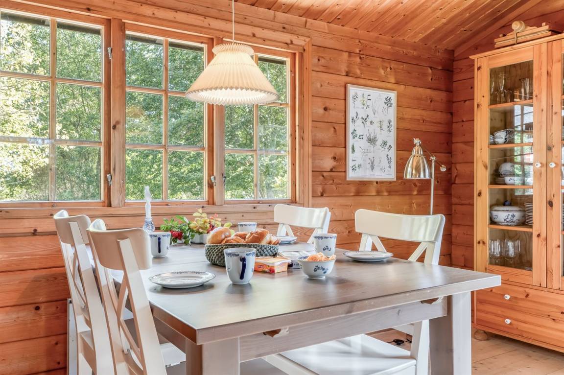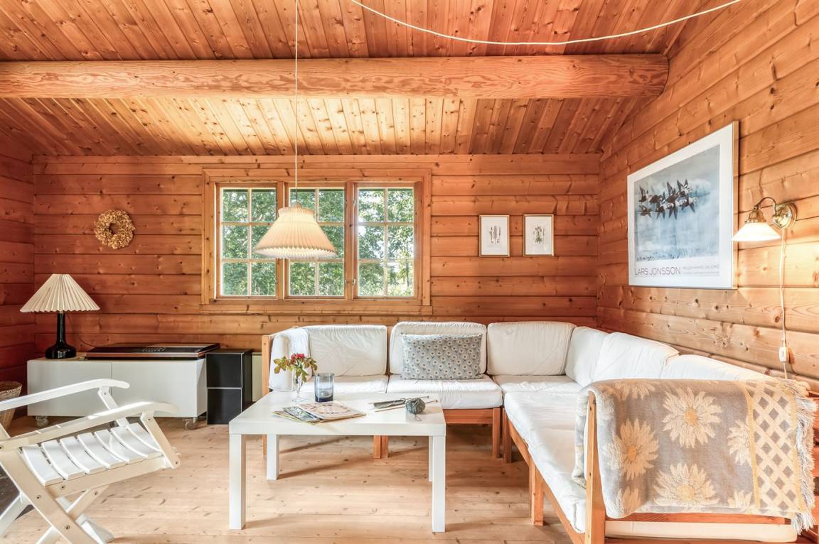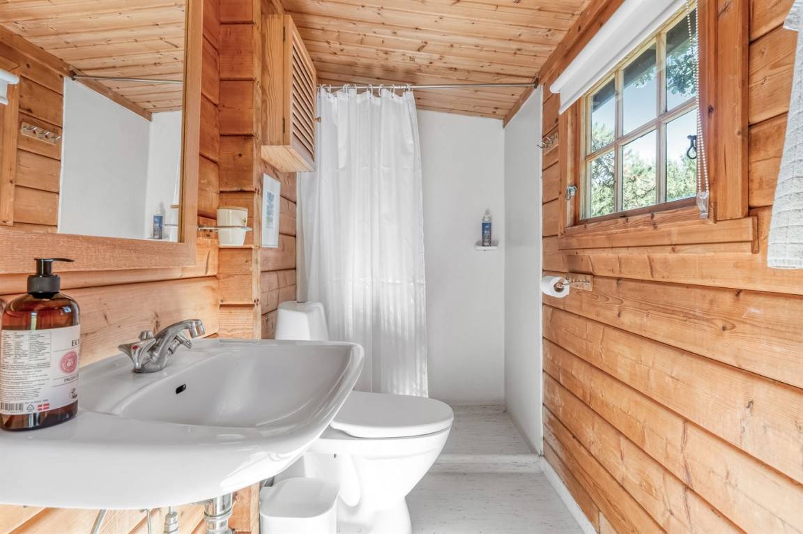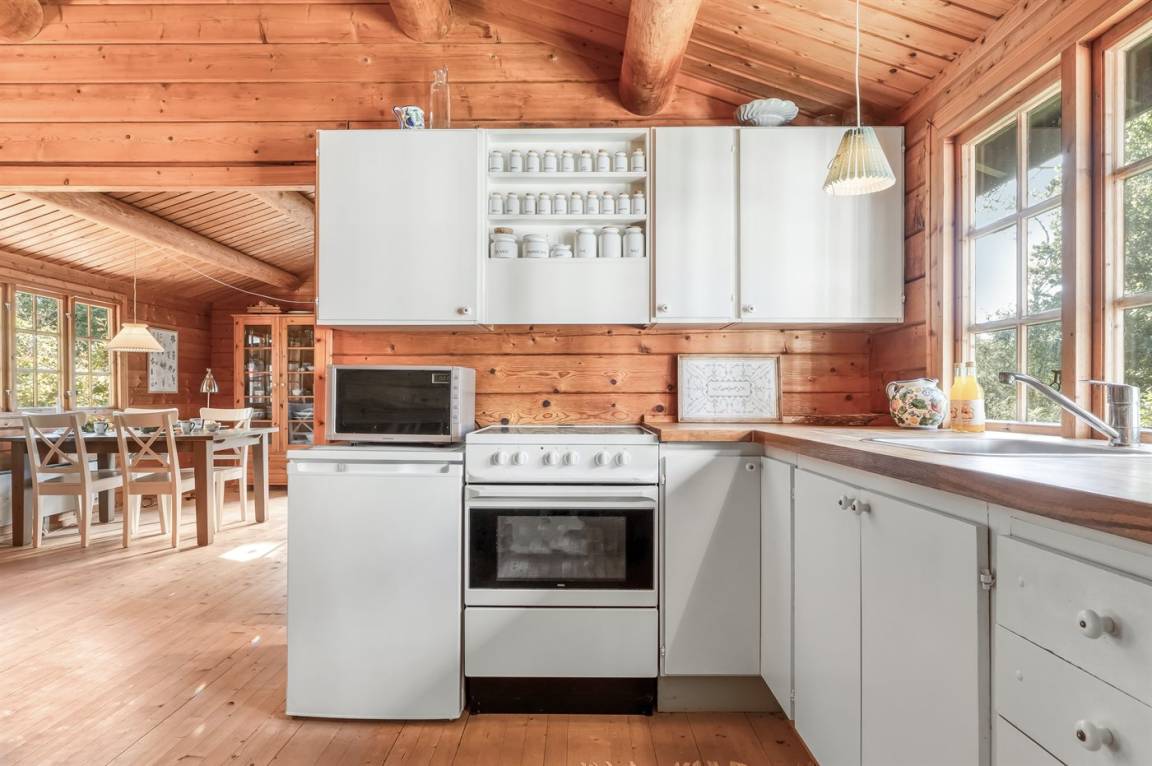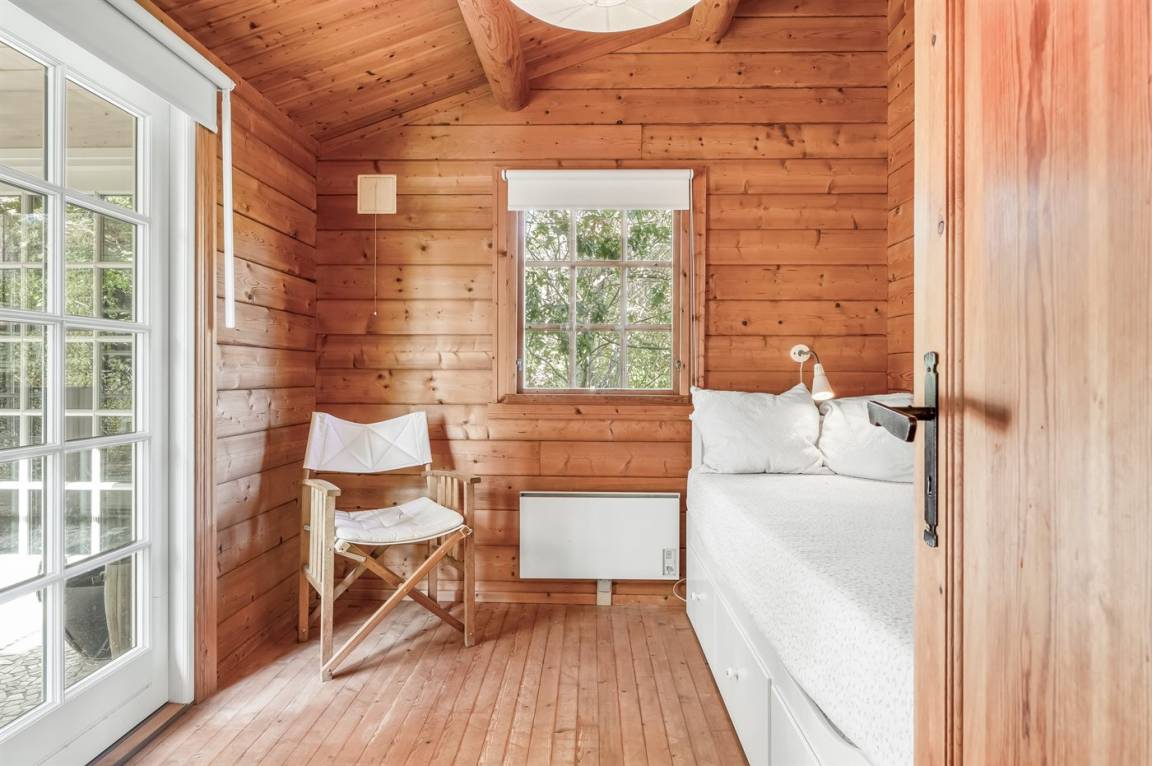 Das Haus ist mit offenen Decken gestaltet und verfügt über 2 geräumige Schlafzimmer, eine offene Küche sowie ein Wohnzimmer mit u. a. Kaminofen. Vom Wohnzimmer aus habt ihr Zugang zur Terrasse, wo ihr die stillen Abende mit gutem Essen vom Grill genießen könnt.