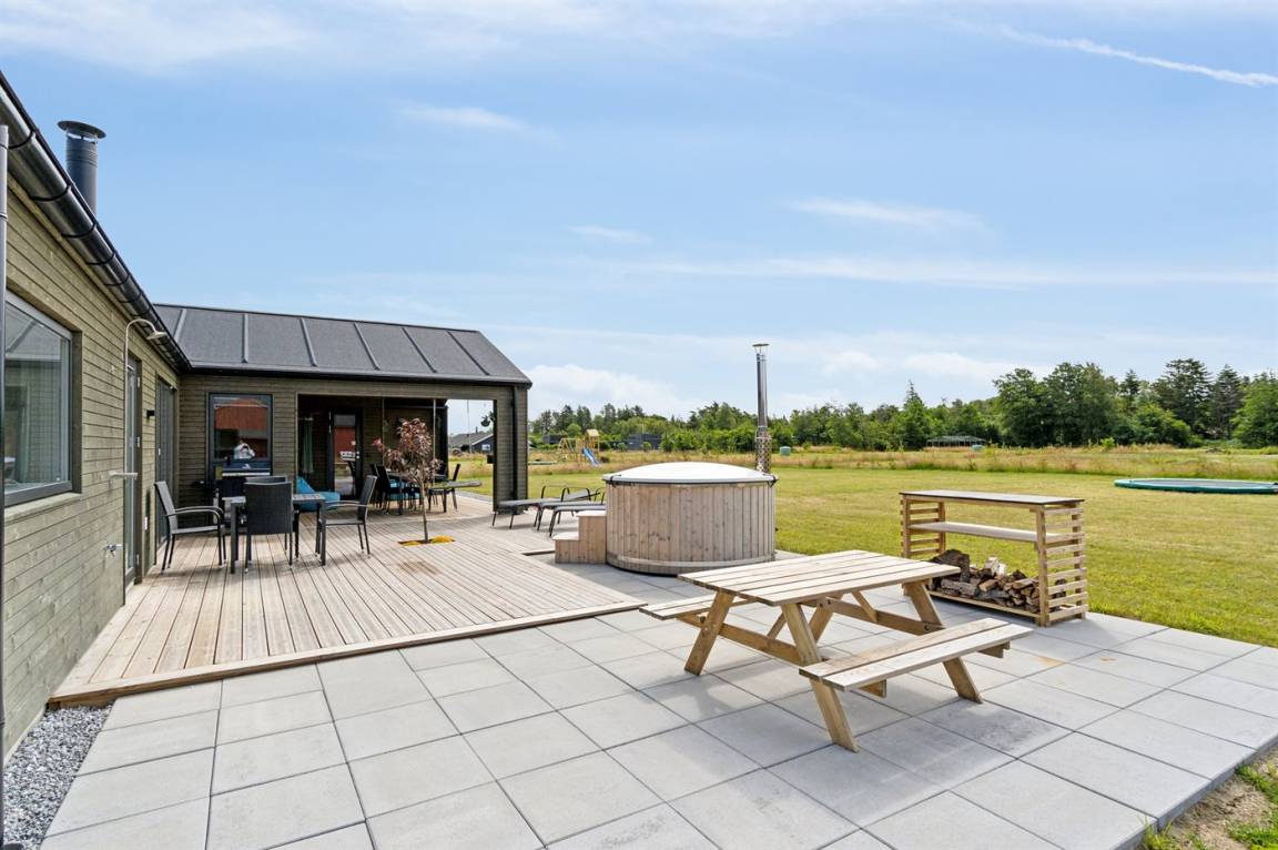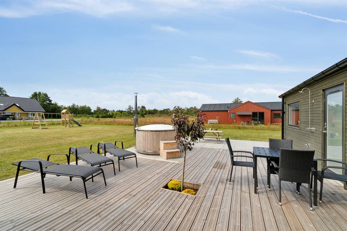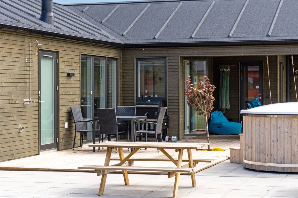 Auch die Außenanlagen des Hauses laden dazu ein, gemütliche Erinnerungen zu schaffen. Auf der gemütlichen Terrasse des Hauses mit Terrassenstrahler (an der Decke befestigt) findet ihr den einladenden Hot Tub, die Außensauna und die Außendusche. Hier könnt ihr euch komplett entspannen und den Stress des Alltags völlig vergessen.