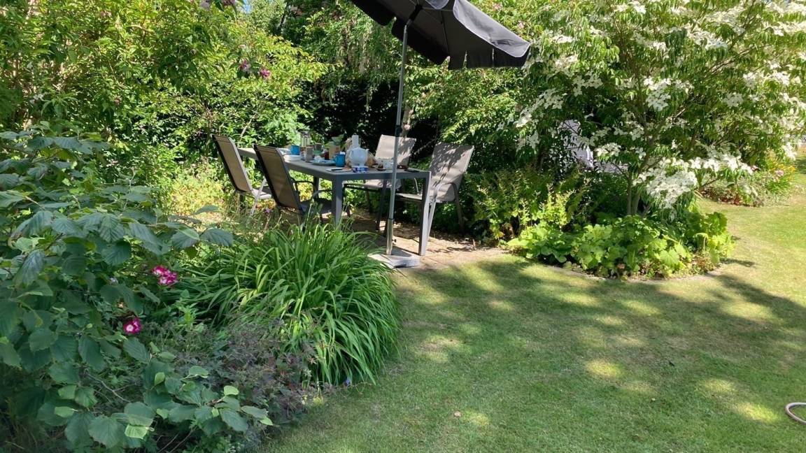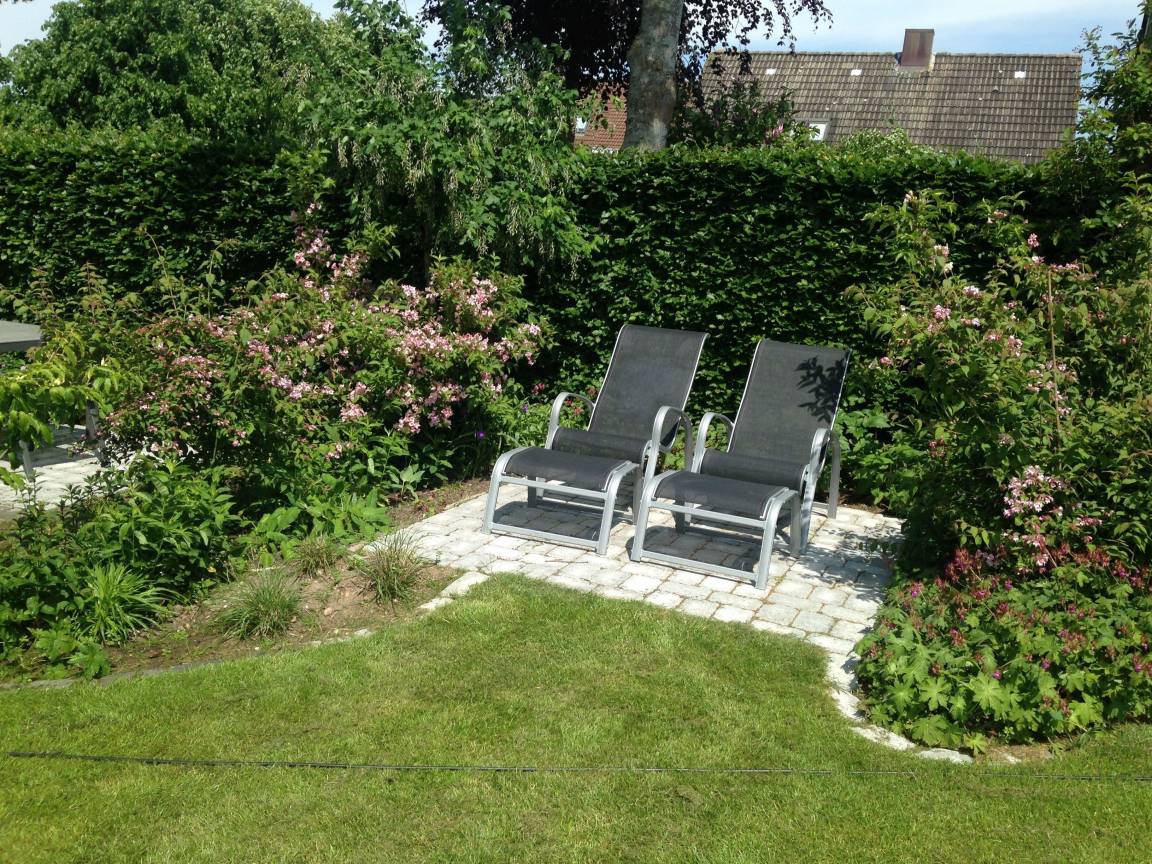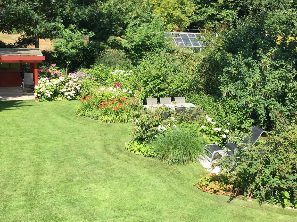 Im grossen Garten mit vielen Blumen und Stauden können Sie auf den Liegen und in den gemütlichen Sitzecken die Sonne genießen. Den Abend dann entspannt mit einem Glas Wein und Essen vom Grill ausklingen lassen.