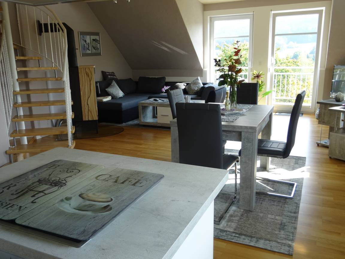 2. Stockwerk, Wohnraum mit Kaminofen und Küchenecke mit Essbereich, Bad mit sep. Toilette, ein Schlafzimmer mit Boxspring-Doppelbett und Schwebetürenschrank, zweites offenes Schlafzimmer im Maisonette mit zwei Boxspring-Einzelbetten, 7m² großer Balkon mit einmaligem Ausblick