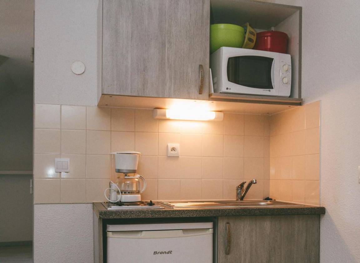 Mitten im Herzen von Allevard les Bains und 300 m von den Geschäften entfernt gelegen, bietet die Residenz Appart'Hôtel Le Splendid geräumige Appartements vom Studio für 2 Personen bis zum 3-Zimmer-Appartement für 6 Personen. Die Residenz, mit Fahrstuhl, liegt neben den Thermen, in einer Oase der Ruhe und Entspannung, und 12 km vom Wintersportort Le Collet d'Allevard in den französischen Alpen entfernt, das heißt 20 min mit dem Auto oder dem kostenpflichtigen Bus. Sie werden außerdem die Möglichkeit zum Ski fahren im Wintersportort Pleynet, les 7 Laux haben, der sich ungefähr 30 min entfernt befindet. Ein Aufenthalt in einem unserer Appartements ist der ideale Rahmen, um im Laufe sportlicher Aktivitäten, der Gesundheitserneuerung oder der Kur, beim Erleben der Natur, neue Kraft zu schöpfen. Fläche von ungefähr 35 m². Wohnzimmer mit Klappschlafcouch (140*190), Flachbildfernseher. Schlafzimmer mit Doppelbett (140*190). Kochnische mit Wasserkocher, Kaffeemaschine, Toaster, Geschirrspülmaschine, Mikrowellenherd, 2 Herdplatten, Kühlschrank. Badezimmer mit Haartrockner.