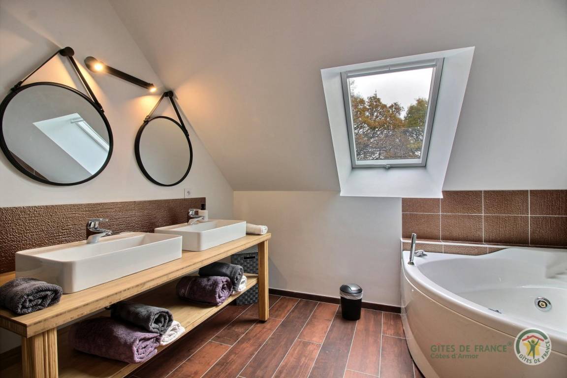 „Belle maison au calme à la campagne avec un beau jardin. Jacuzzi, piscine, ping-pong, pétanque, velos... beaucoup d'occupations sur place pour les jeunes et les moins jeunes... Proche de la baie de Saint Brieuc et de la cote de Granit rose pour visiter. Merci à Christian et Yveline pour leur accueil“