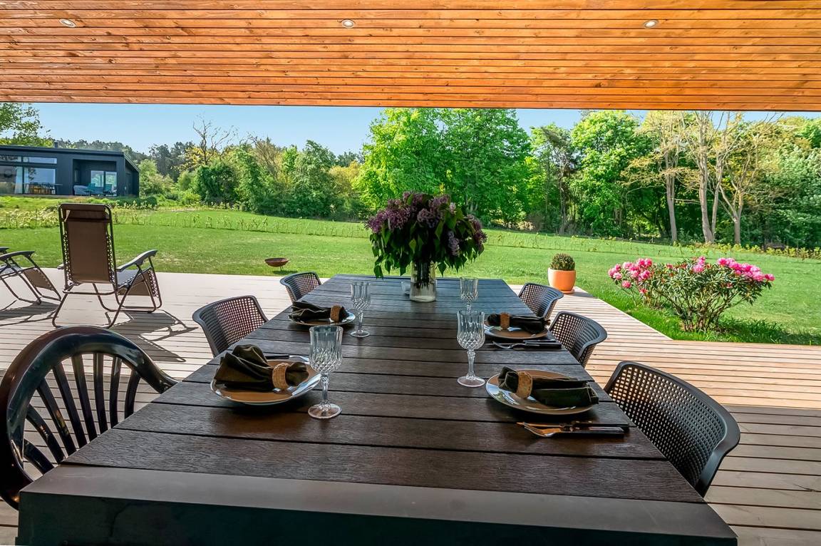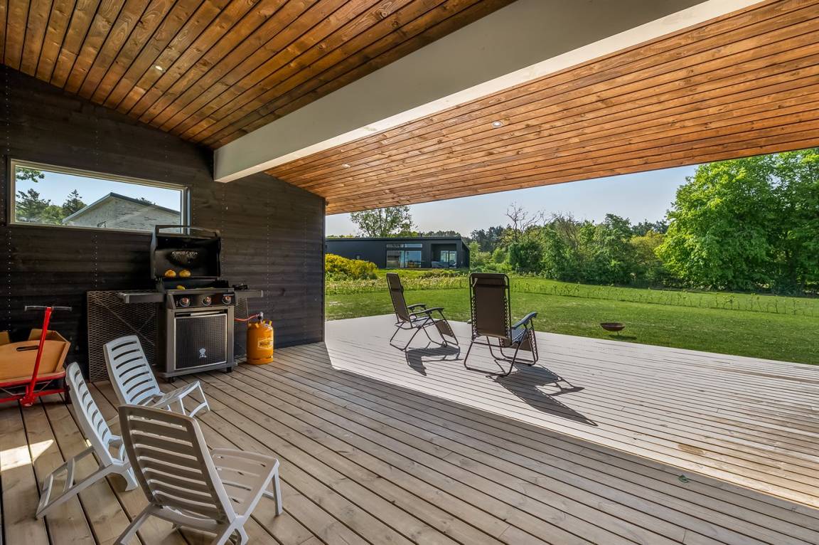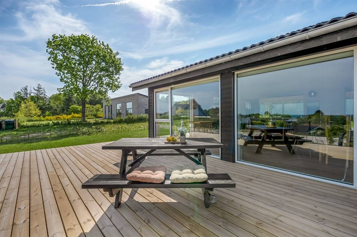 Zum Haus gehören auch großartige Terrassenbereiche, die sich auf beide Seiten des Hauses verteilen. Die große überdachte Terrasse zum Garten hin lädt dich dazu ein, in aller Ruhe die Stille zu genießen, während du den Kindern beim Spielen im Garten zusiehst. Auf der Vorderseite des Hauses findest du noch eine schöne Terrasse, wo die Aussicht wirklich im Mittelpunkt steht – hier kannst du mit einem guten Glas Wein oder einer Tasse Kaffee die herrliche Umgebung genießen.