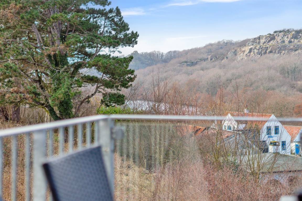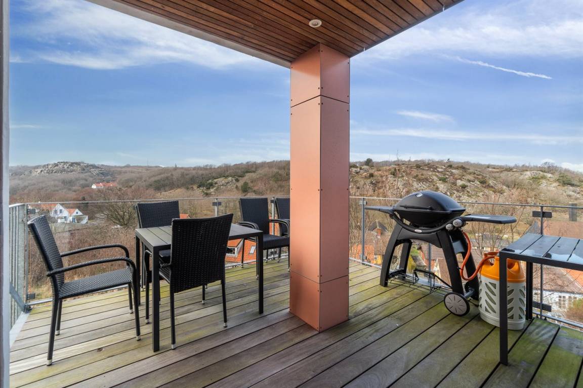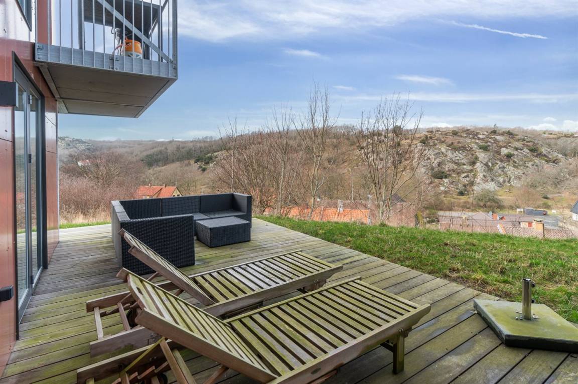 Das Ferienhaus wurde auf einem abfallenden Grundstück gebaut, und beim Betreten des Hauses und Hinabgehen befindet man sich dennoch auf der Höhe der erhöhten Terrasse. Wenn man hingegen nach oben geht, hat man die Möglichkeit, auf die überdachte Terrasse zu treten. Beide Terrassen bieten eine fantastische Aussicht. Der Morgenkaffee kann besonders gut auf der Terrasse beim Eingang genossen werden.