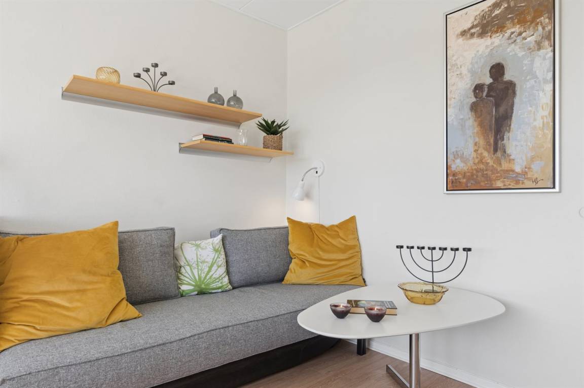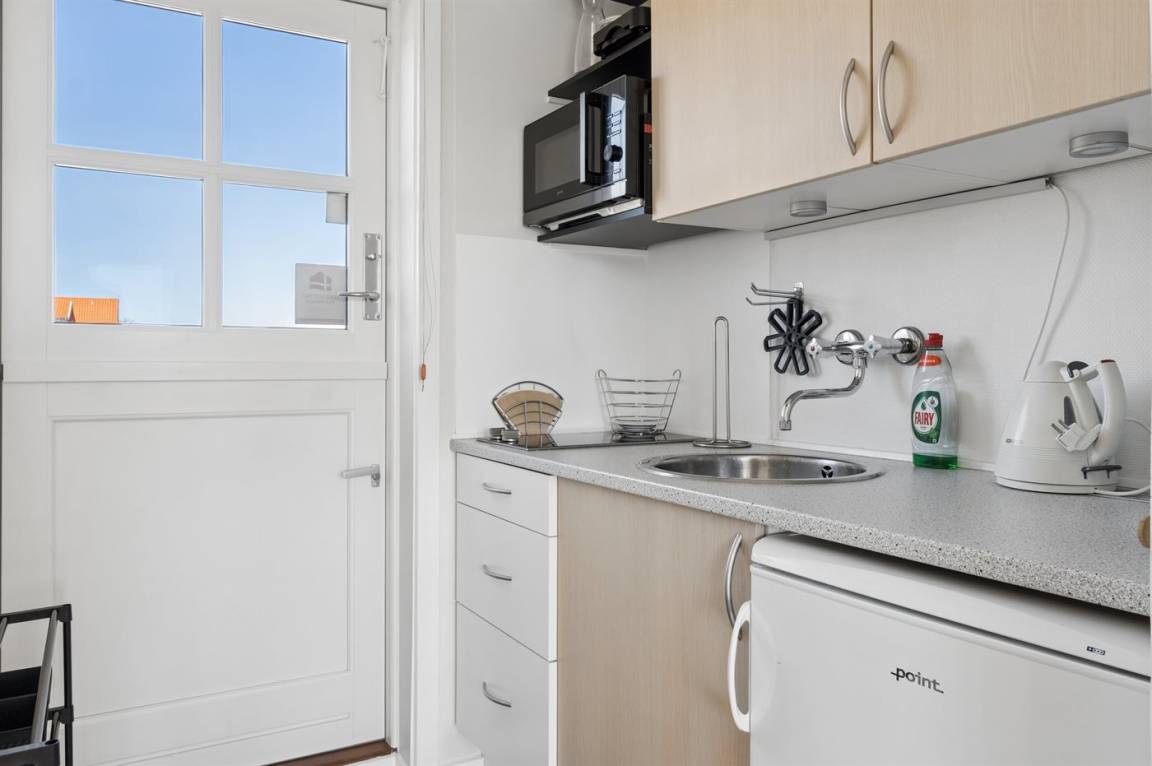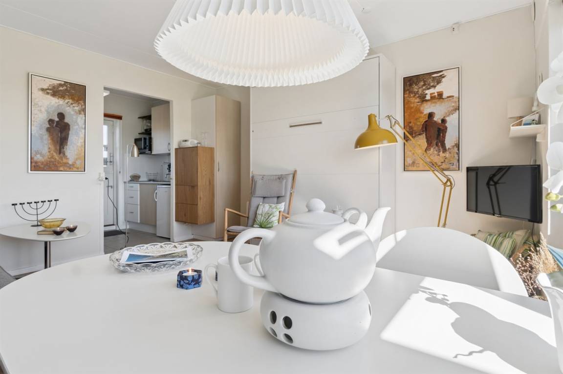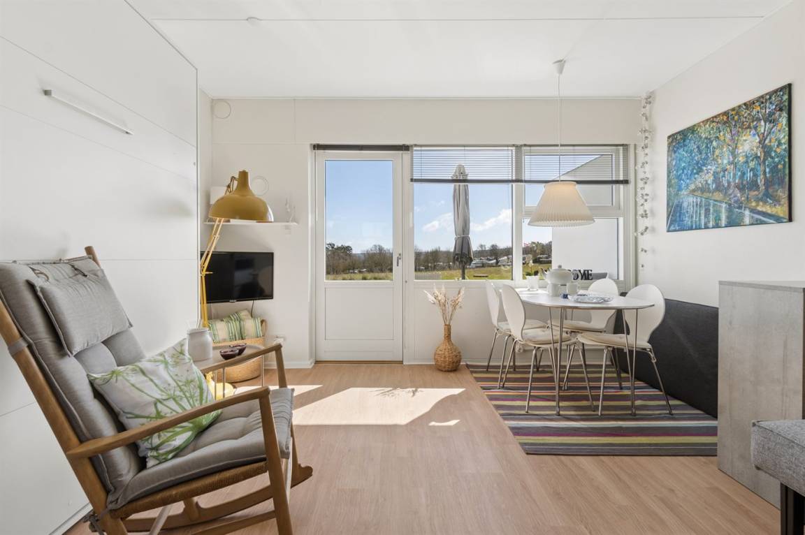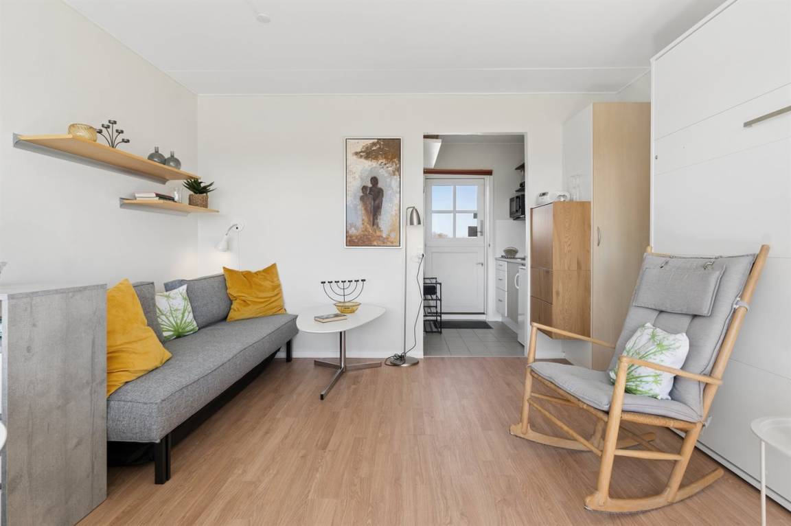 Helle Ferienwohnung mit 27 Quadratmetern, gelegen mit einem schönen Blick über die Felder im sanft abfallenden Gelände und über die Ostsee mit Christiansø in der Ferne.