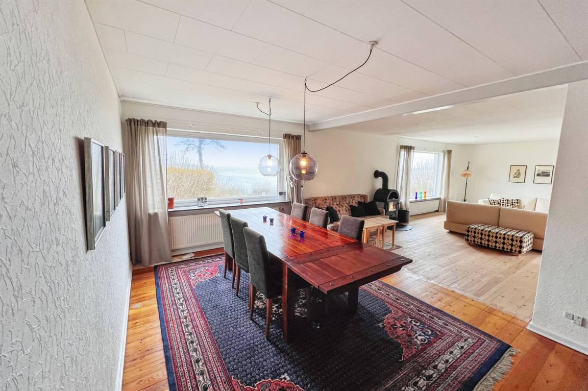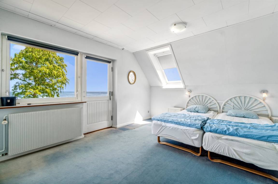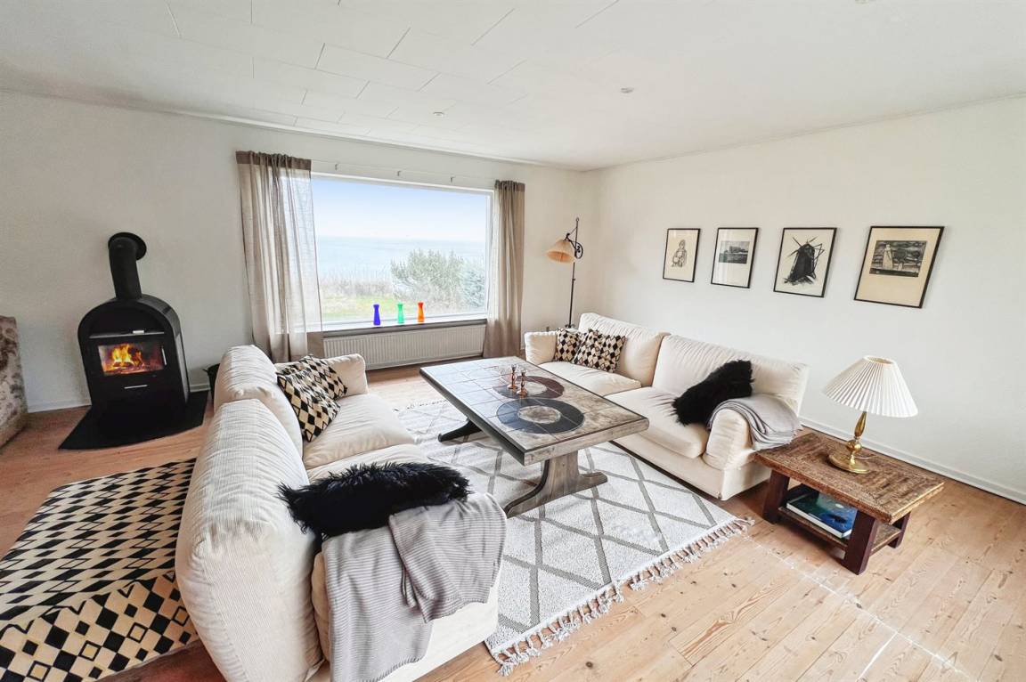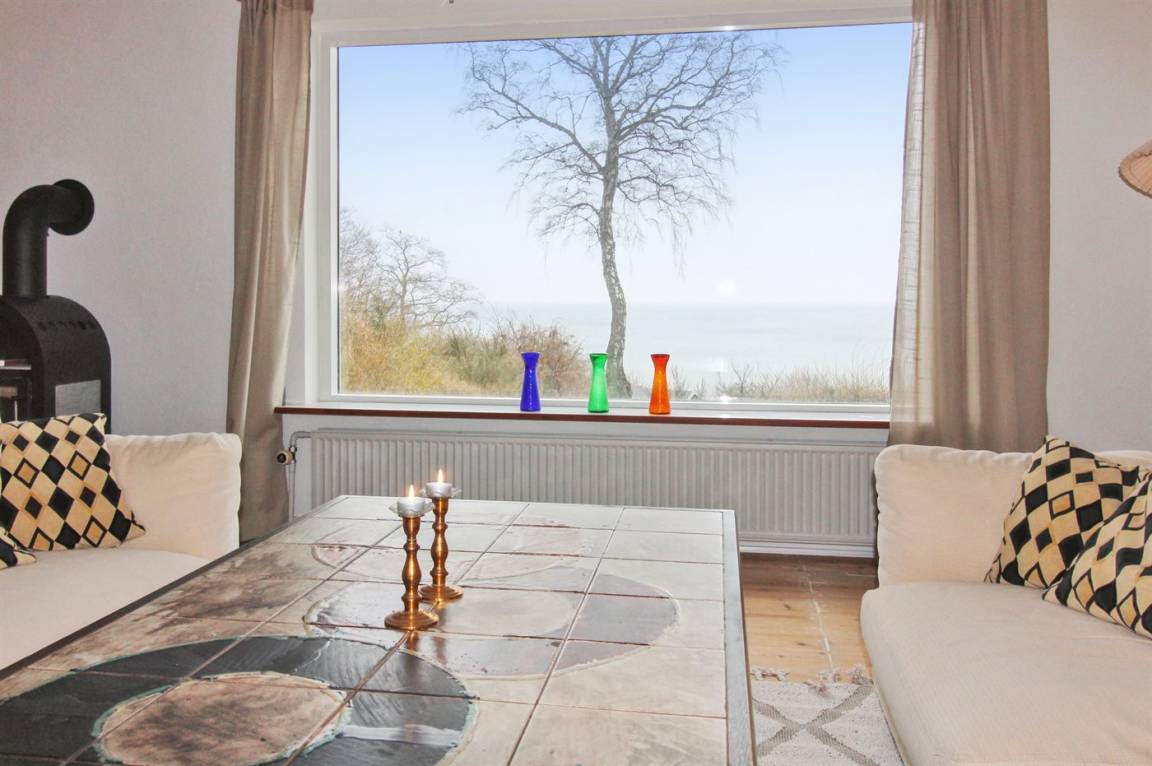 Das Haus ist auf zwei Etagen und die Bauweise ist ganz besonders, sodass man sofort das Gefühl eines exklusiv gelegenen Ferienhauses bekommt. Vom Panoramafenster im Wohnzimmer hast du die schönste Aussicht über das Grundstück und auf das Meer, sodass es schwerfällt, sich beim gemütlichen Kaminfeuer nur auf das Lesen eines guten Buches zu konzentrieren, weil die Aussicht so fesselnd ist. Im großen Schlafzimmer im ersten Stock können die Türen zum französischen Balkon geöffnet werden, sodass du auch dort den vollen Genuss der Aussicht hast.