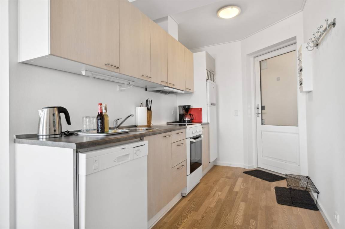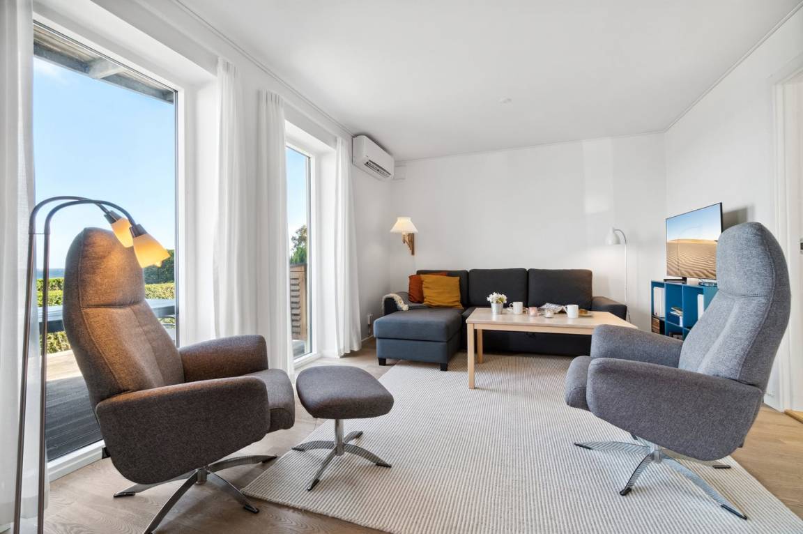 Die Wohnung befindet sich in der Ferienanlage Sjølyst, wo sich hinter dem Hauptgebäude eine größere erhöhte Terrassenfläche zur gemeinsamen Nutzung mit anderen Gästen in Sjølyst befindet. Von hier oben ist der Blick auf das Meer noch besser.