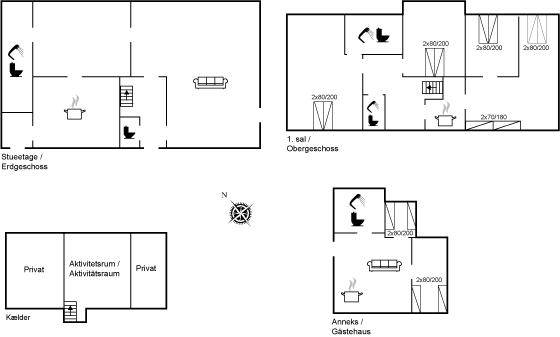 SchlafverhältnisseDie Schlafplätze verteilen sich auf 6 Schlafräume. 8 Schlafplätze in Doppelbetten. 4 Schlafplätze in Einzelbetten. 2 Schlafplätze auf Matratzen. 2 von diesen Schlafplätzen befinden sich im offenen Obergeschoss. Ferner stehen 2 Kinderbetten zur Verfügung.
