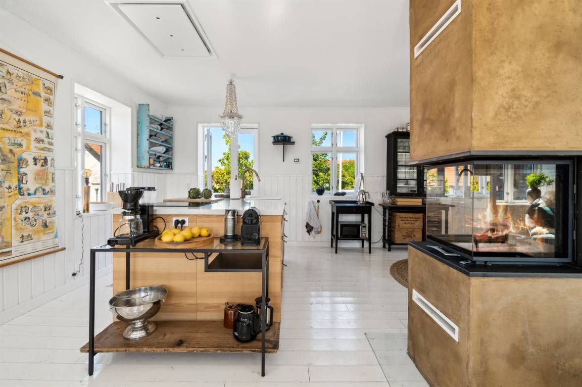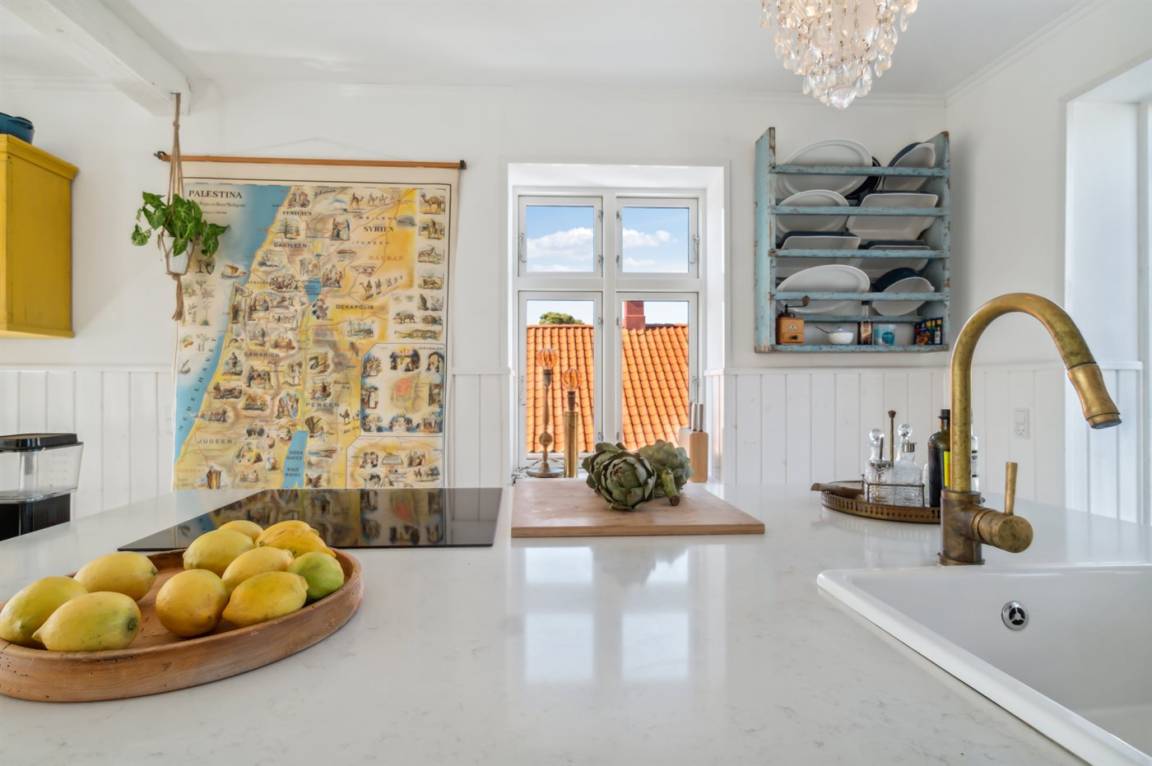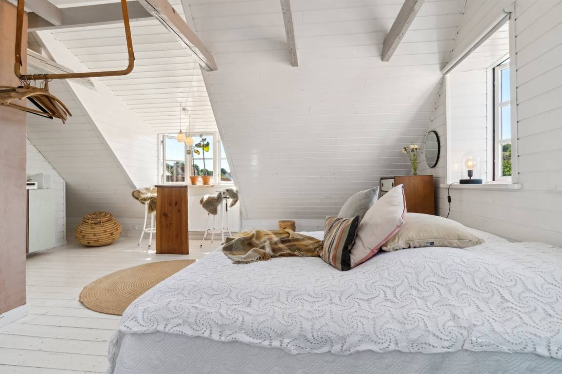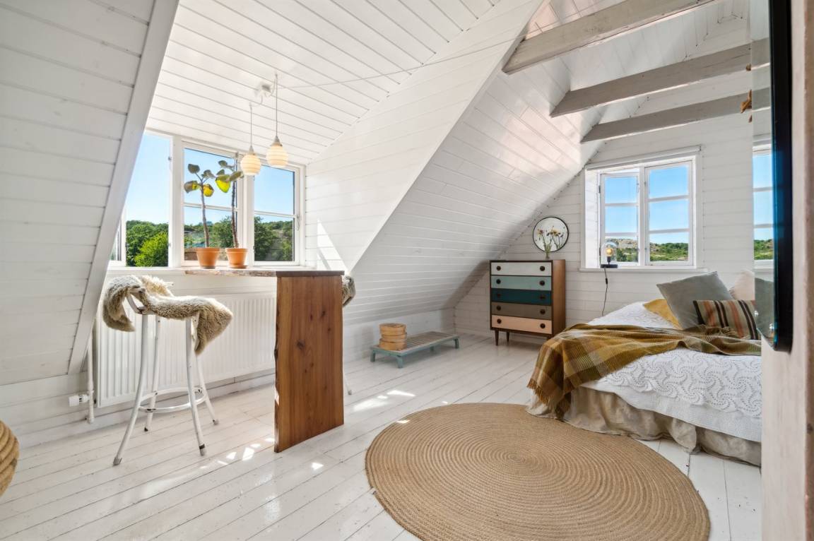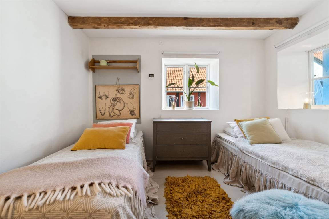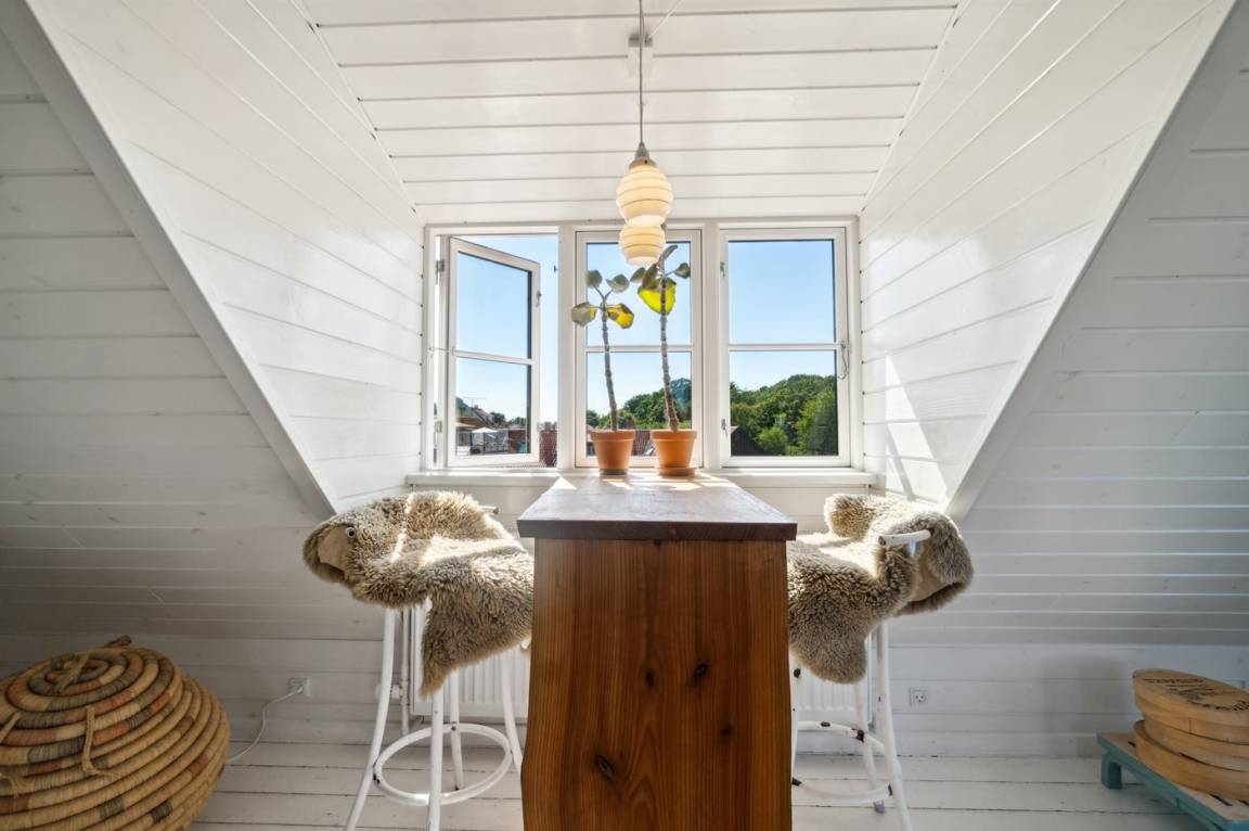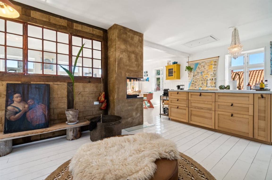Du wohnst in einem sehr persönlich und geschmackvoll eingerichteten Haus mit Kunst und kuriosen Funden. Überall gibt es interessante handgefertigte Details, wie z.B. die alte geschwungene Treppe mit den Bornholmer Kanonenkugeln oder die luxuriösen Badezimmer mit Marmorino vom Boden bis zur Decke. An Materialien wurde nicht gespart. Das Obergeschoss ist ein großer heller Aufenthaltsraum mit großem Fernseher und Doppelbett. Von hier aus genießt du einen beeindruckenden Blick in alle vier Himmelsrichtungen mit Hammerknuden, dem Meer und den schönen Fachwerkhäusern von Sandvig. Hier befinden sich auch ein neues, schönes Badezimmer und ein kleines offenes Obergeschoss. Das Erdgeschoss besteht aus einer Küche mit Essbereich, mit hohen Decken und Paneelen. Hier gibt es eine schöne neue Küche aus Eschenholz, einen Essbereich und einen Loungebereich mit Fernseher und einer gemütlichen Couch. In der Mitte des Raumes befindet sich ein luxuriöser Einsatzkamin mit Glas auf drei Seiten. Von der Küche aus gelangst du auf eine gemütliche Holzterrasse und in den Steingarten mit vielen Obstbäumen. Vom Erdgeschoss und vom Garten aus gelangst du in das Untergeschoss. Hier gibt es einen Eingangsbereich mit einem Waschtrockner unter der Treppe. Ein großes und schönes, neues Badezimmer mit Badewanne und Dusche. Zwei schöne Schlafzimmer, eines mit Doppelbett und eines mit zwei Einzelbetten. Das Haus wurde komplett renoviert, isoliert und verfügt über Fußbodenheizung.