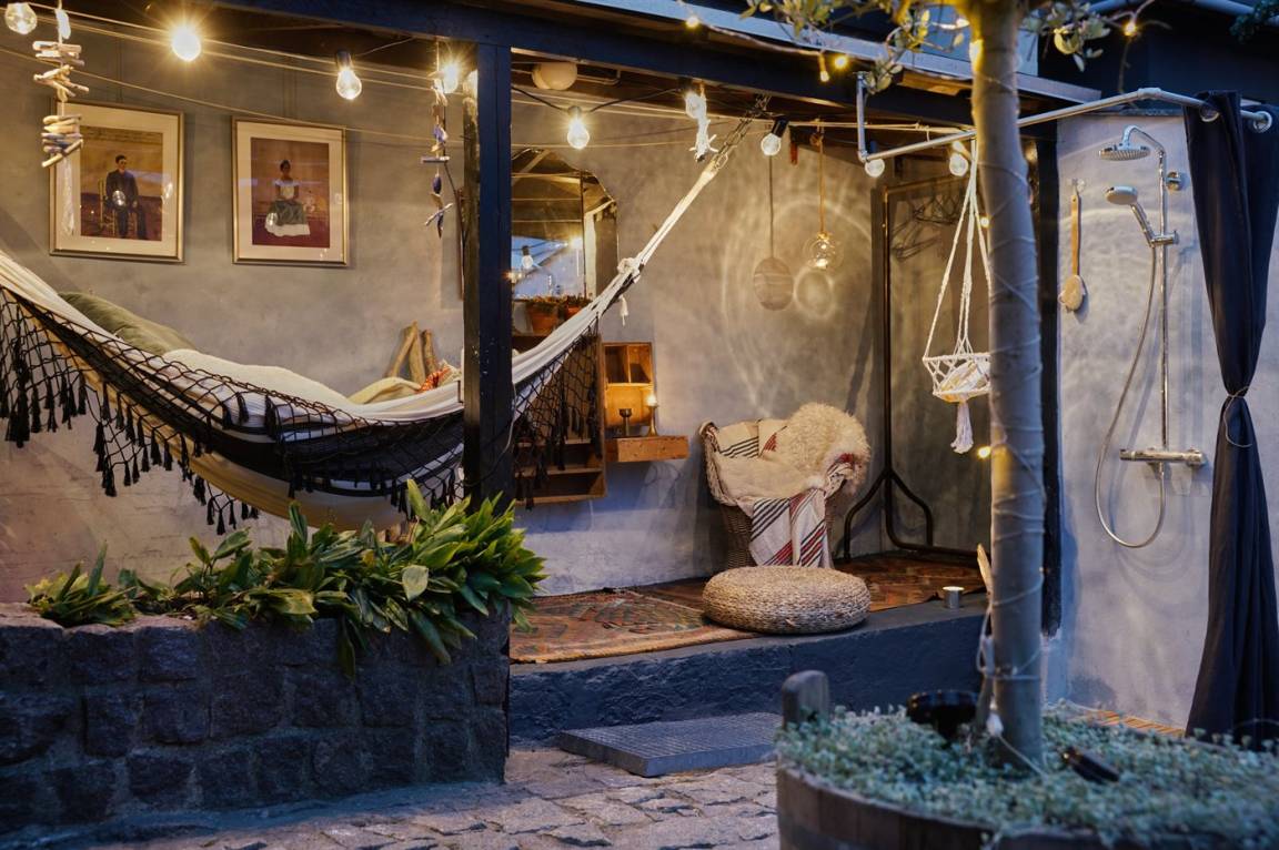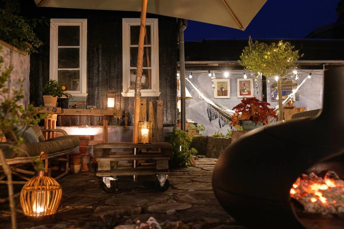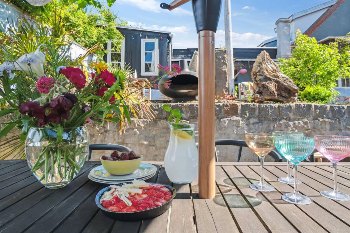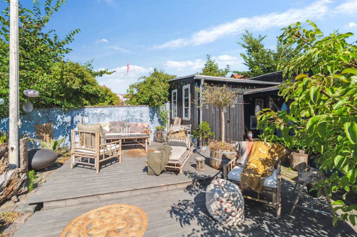 Das Haus bietet einen fantastischen und einzigartigen Bornholmer Steingarten mit mehreren Sonnenterrassen und Aufenthaltsbereiche. Zwischen den Bornholmer Pflastersteinen und Eichenfliesen, die von der Sonne erwärmt werden – hier kannst die Abende und Nächte genießen, wo du ungestört grillen und dich entspannen kannst. Du kannst auch den Morsø-Terrassenheizer anzünden, der auch als Brot- und Pizzaofen fungiert, was allen Altersgruppen Spaß macht. In einem hübschen Schuppen, der ursprünglich als Steinmetzhütte des Hausgründers diente und damals im Steinbruch bei Hammershus stand, befindet sich eine kleine Küche mit zusätzlichem Kühlschrank/Gefrierschrank, Kochplatten, Wasserkocher und einer Cocktailbar sowie einer kleinen Außentoilette. Unter einer Abdeckung kannst du im Schatten in einer Hängematte lesen oder nach einem Strandspaziergang im Außenduschbereich, mit warm und kalt Wasser, den Sand abspülen.