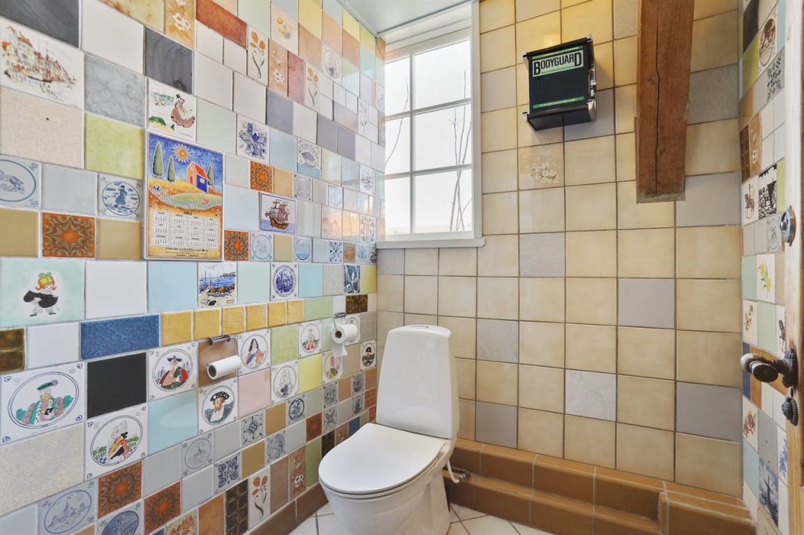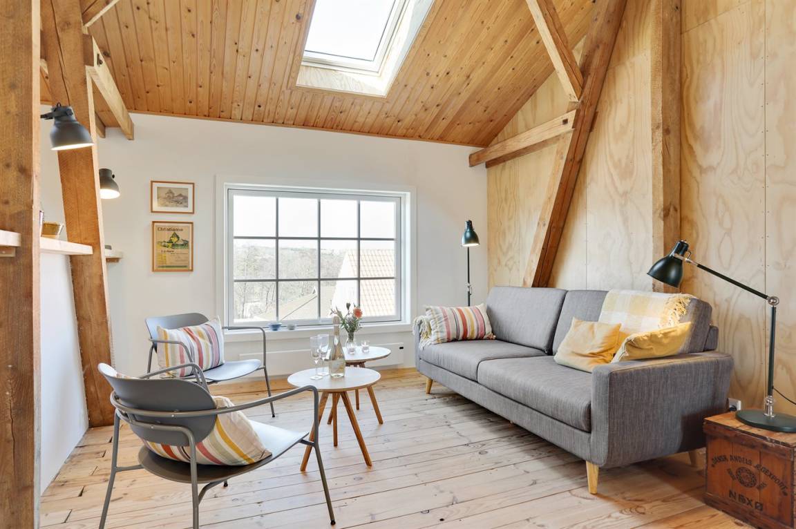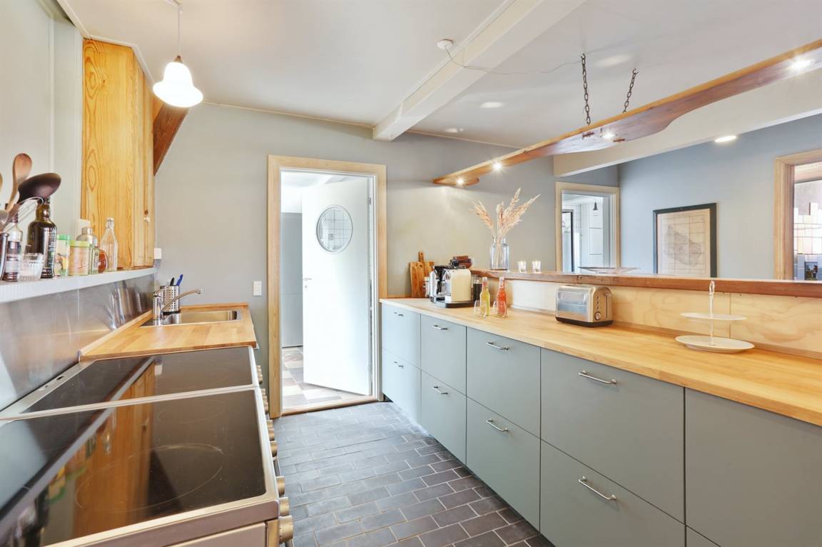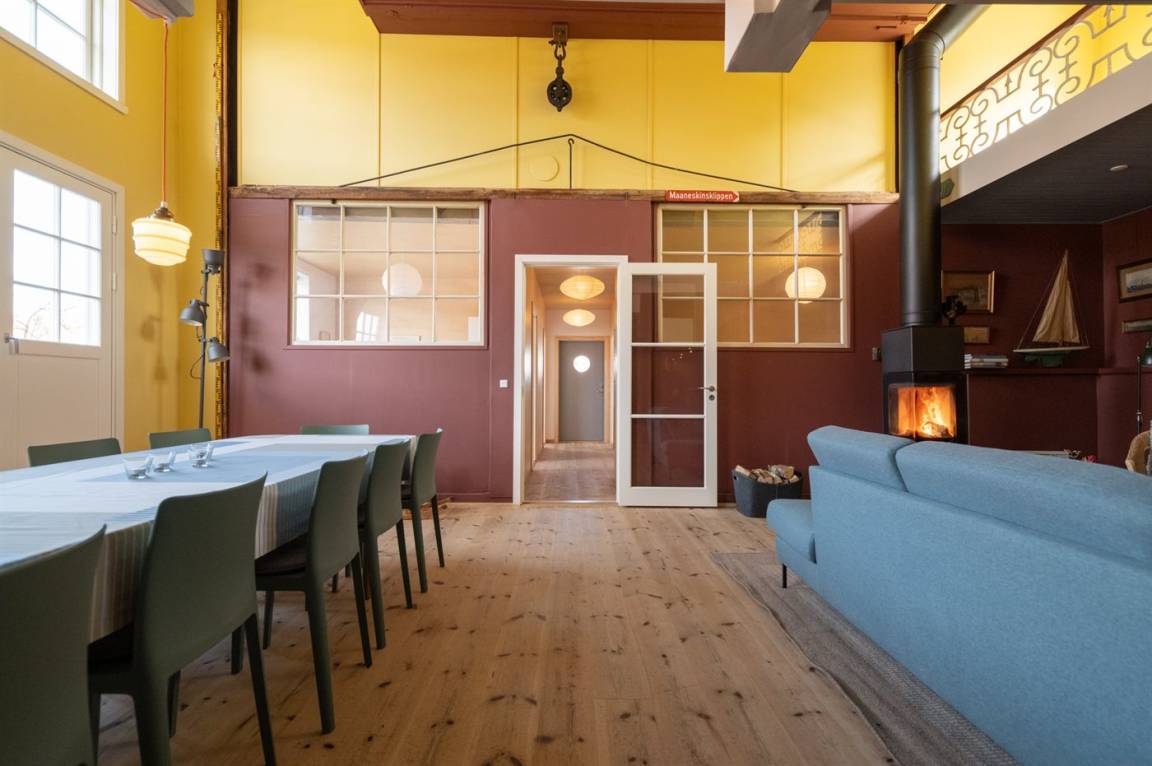 Es wurde großen Wert darauf gelegt, die Geschichte der Werft zu erhalten und sichtbar zu machen. In dem Zimmer mit doppelter Raumhöhe sieht man noch die Schiene und den Flaschenzug, an dem die ursprüngliche Fassade hochgezogen werden konnte, wenn die fertigen neuen Boote die Werft verließen. So wurden zum Beispiel die Ausflugsboote von Hammerhavn in der Werft gebaut. Die Fenster zwischen dem Wohn- und den anderen Zimmern stammen von der Originalfassade. Die Werft wurde später zum Café Værftet umgebaut. Wir haben die sehr außergewöhnlichen und farbenfrohen Fliesenwände im Eingangsbereich, Flur und in den Toiletten erhalten. Die Farbgebung der Räume stammt vom Café Værftet. Die verschiedenen Farben verleihen dem Raum einen ganz eigenen Charakter und über den ganzen Tag ein besonderes Raumerlebnis.