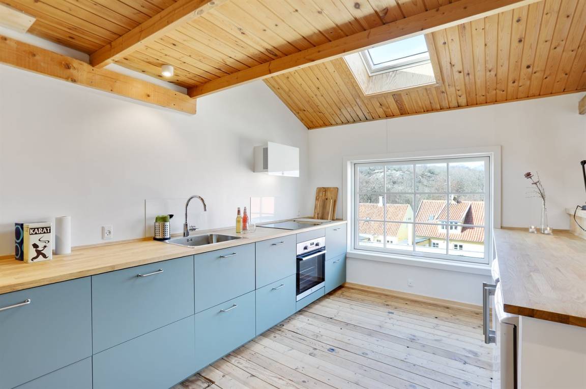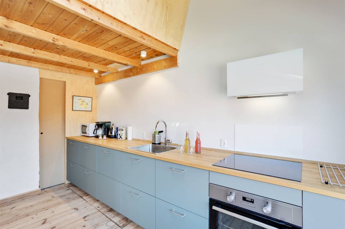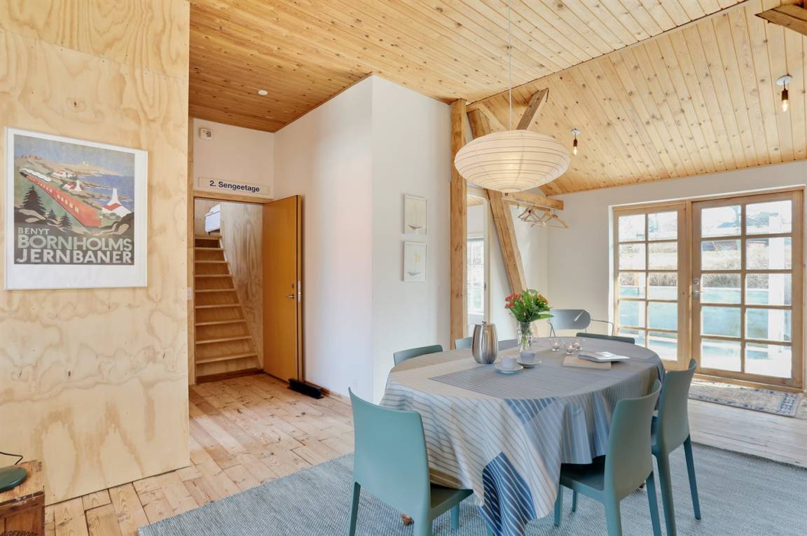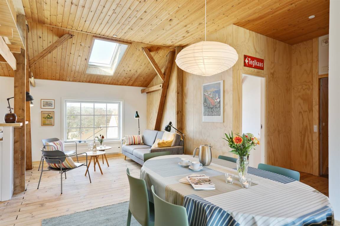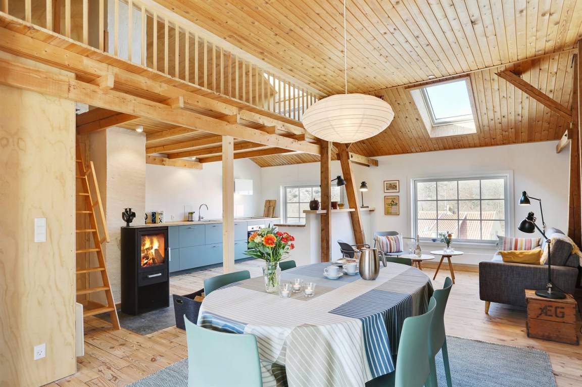 Værftet Sandvig – der zentrale Raum von Værftet Sandvig („Werft Sandvig") ist die große Wohnküche im Erdgeschoss, die Platz für alle Gäste bietet. Die stellenweise doppelte Raumhöhe sorgt für eine ganz besondere Atmosphäre und einen sehr schönen Lichteinfall. Mit ca. 165 m² im Erdgeschoss sowie ca. 100 m² im 1. Obergeschoss ist ausreichend Platz für alle vorhanden und daher eignet die Werft perfekt für mehrere Generationen, die den Urlaub gemeinsam verbringen möchten.