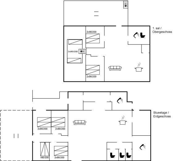 SchlafverhältnisseDie Schlafplätze verteilen sich auf 7 Schlafräume. 2 Schlafplätze in einem Doppelbett. 14 Schlafplätze in Einzelbetten. Das eine Schlafzimmer ist außerdem mit einem offenen Obergeschoss ausgestattet, wo sich 2 Schlafplätze auf Matratzen befinden. Ferner stehen 2 Kinderbetten zur Verfügung.