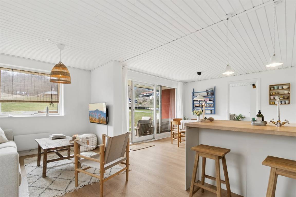 Eine besonders schöne Ferienwohnung mit Meerblick und Zugang zu einem Außenpool in dem attraktiven Feriengebiet in Sandkås. Der Außenpool ist vom 1. Juni bis zum 30. August nutzbar sowie beheizt und elegant in die große, nach Süden ausgerichtete Holzterrasse integriert. Das Haus verfügt über insgesamt drei Terrassen, von denen eine teilweise überdacht ist, sodass er hier viel Platz zum Entspannen und gemütliche Stunden in der Sonne gibt.