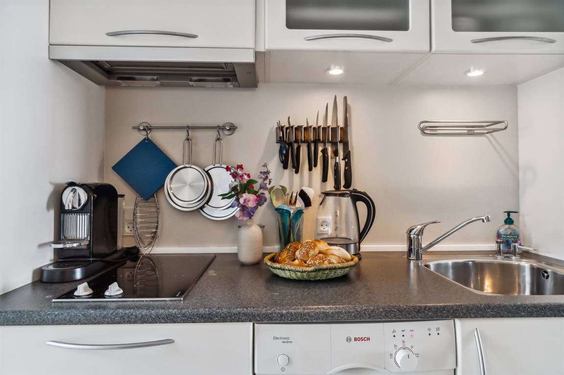 Der Mittelpunkt der Wohnung ist das schöne Wohnzimmer mit Essbereich. Die Schlafcouch und die übrigen Möbel sind von hoher Qualität, und es gibt direkten Zugang zur Meeres-Terrasse mit Gartenmöbeln. Es ist eine Press-Stempelkanne für die Kaffeezubereitung vorhanden, und wenn man sich besonders verwöhnen möchte, kann man die Nespresso-Maschine verwenden.