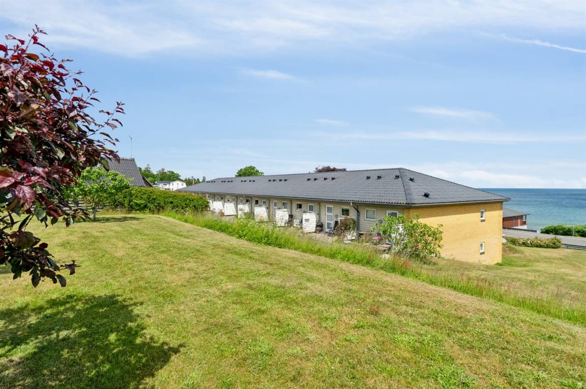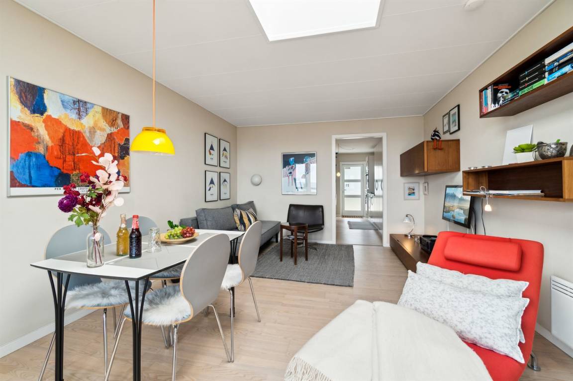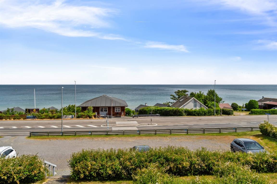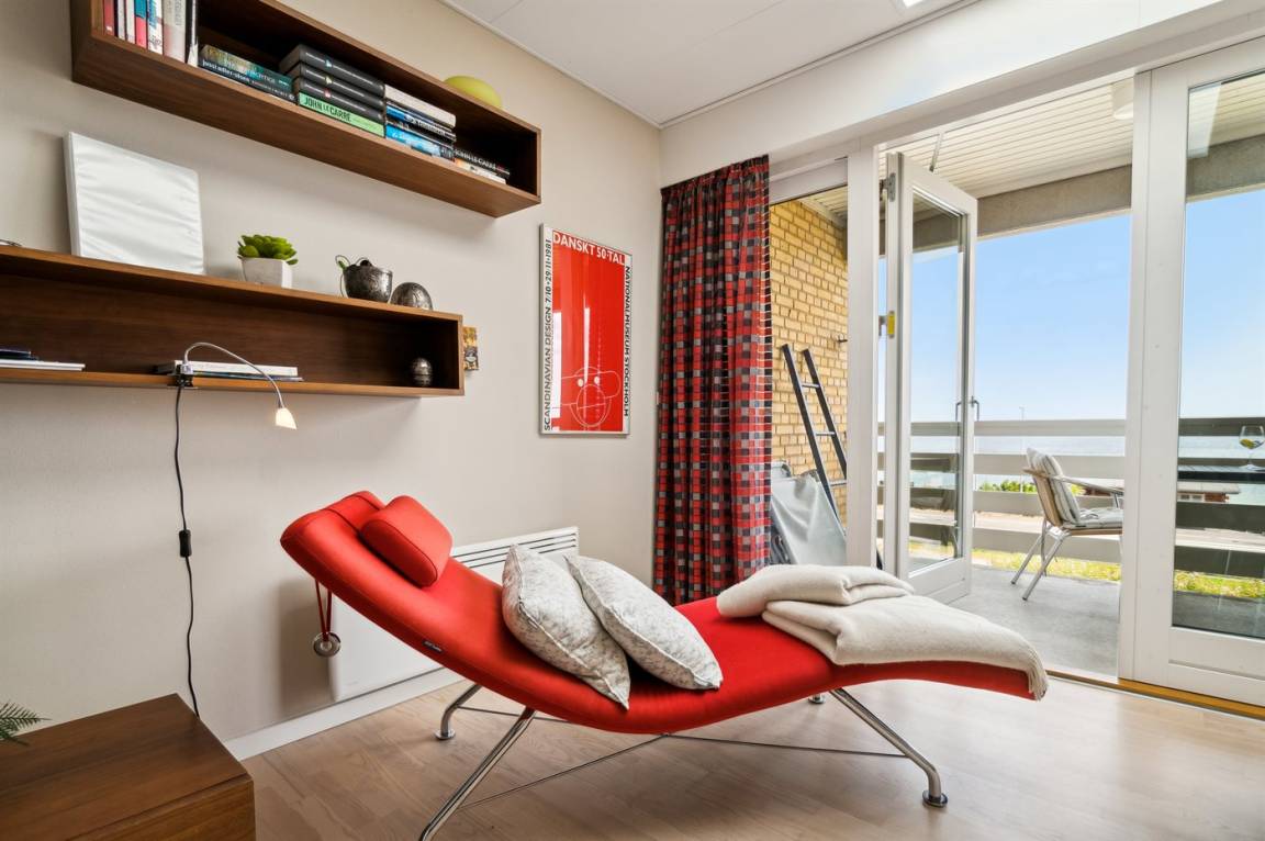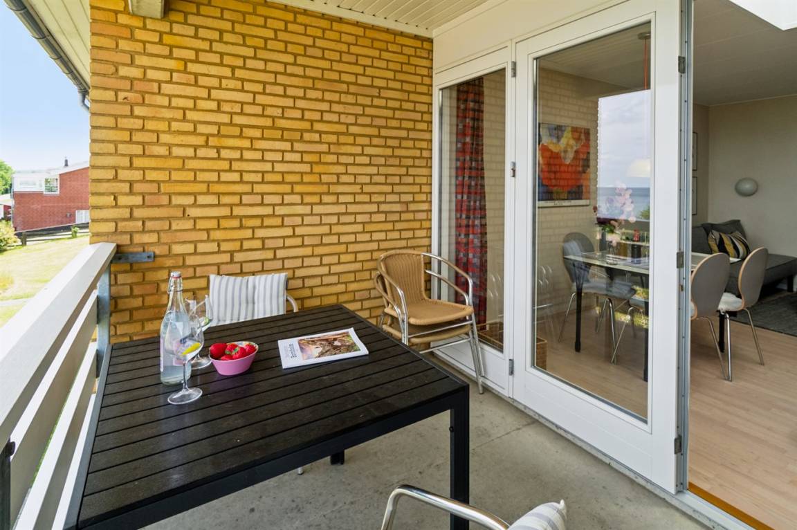 Diese schön eingerichtete Ferienwohnung im Obergeschoss bietet einen 180-Grad-Meerblick über die wunderschöne Ostsee. Die Wohnung ist Teil einer Reihenhauslösung, die am Hang zum Sandstrand in Sandkås liegt. Die Wohnung ist besonders hell, da in dieser Wohnung ein großes Oberlichtfenster montiert wurde, dadurch wird die Wohnung vor allem an bewölkten Tagen heller. Zum Oberlichtfenster gehören Jalousien, sodass das man das Fenster zuziehen kann, wenn die Schlafcouch im Wohnzimmer benutzt wird. Am anderen Ende der Wohnung befindet sich eine kleine Terrasse, auf der man die Sonne genießen kann, wenn sie von der Meerseite verschwindet.