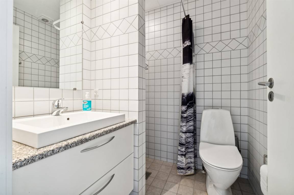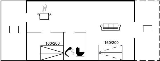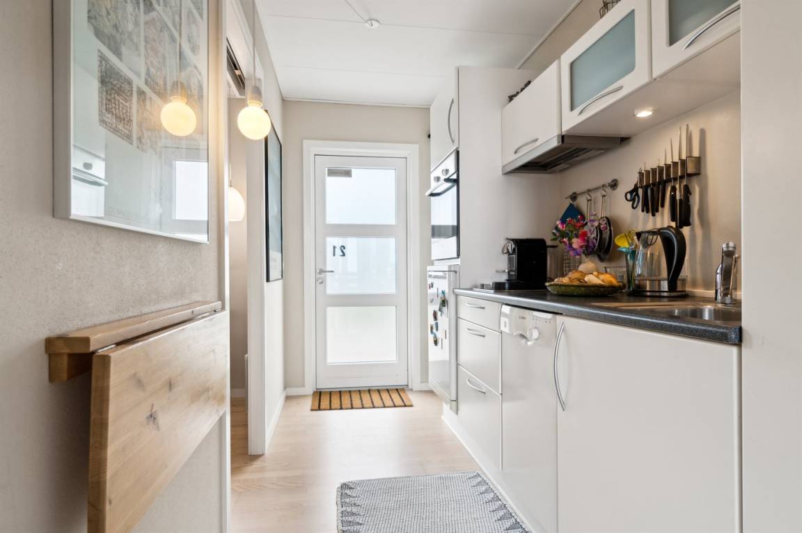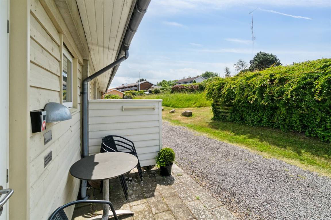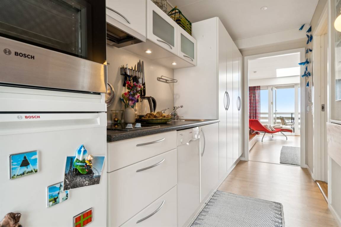 Diese schön eingerichtete Ferienwohnung im Obergeschoss bietet einen 180-Grad-Meerblick über die wunderschöne Ostsee. Die Wohnung ist Teil einer Reihenhauslösung, die am Hang zum Sandstrand in Sandkås liegt. Die Wohnung ist besonders hell, da in dieser Wohnung ein großes Oberlichtfenster montiert wurde, dadurch wird die Wohnung vor allem an bewölkten Tagen heller. Zum Oberlichtfenster gehören Jalousien, sodass das man das Fenster zuziehen kann, wenn die Schlafcouch im Wohnzimmer benutzt wird. Am anderen Ende der Wohnung befindet sich eine kleine Terrasse, auf der man die Sonne genießen kann, wenn sie von der Meerseite verschwindet.