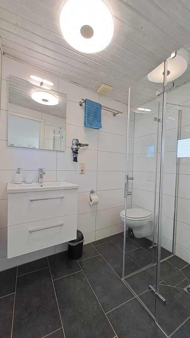 - mit Fenster, ebenerdiger Dusche, Waschbecken, Unterschrank, Spiegel und WC