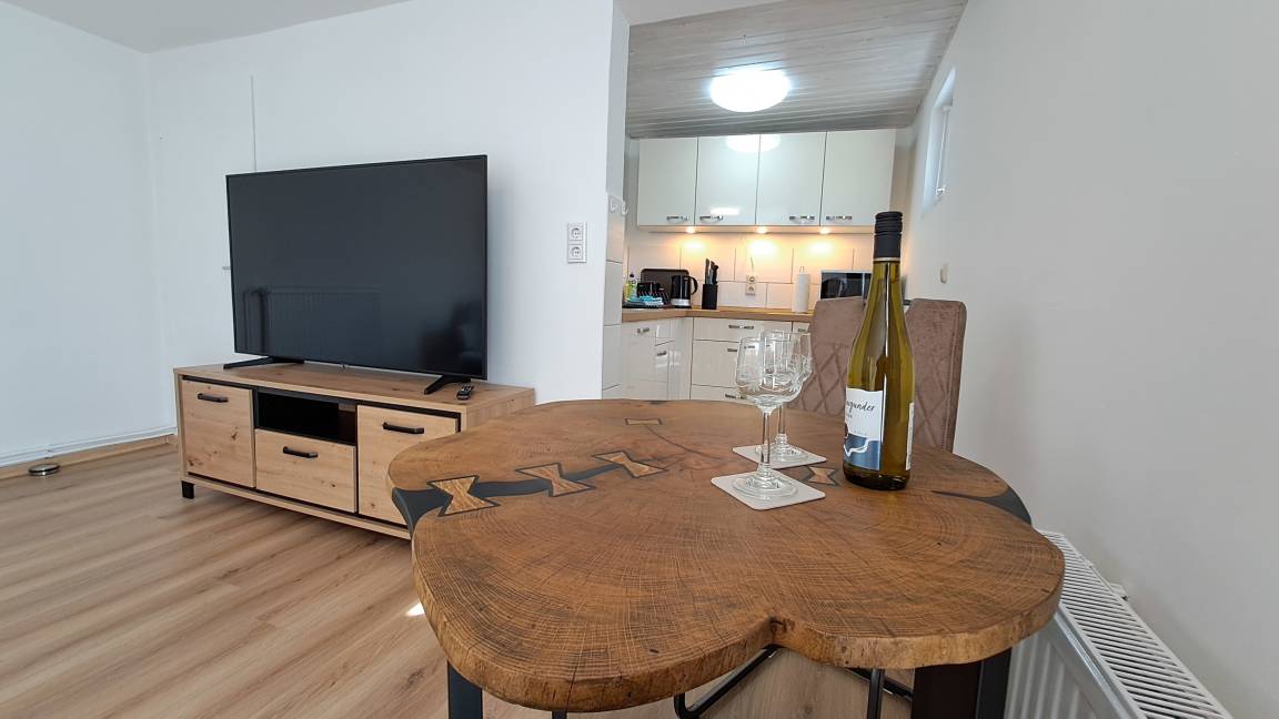 - Großer Smart-TV (Netflix & Amazon mit eigenem Account schauen) und natürlich WLAN Ein Hingucker ist der handgefertigte Esstisch aus Eichenholz.