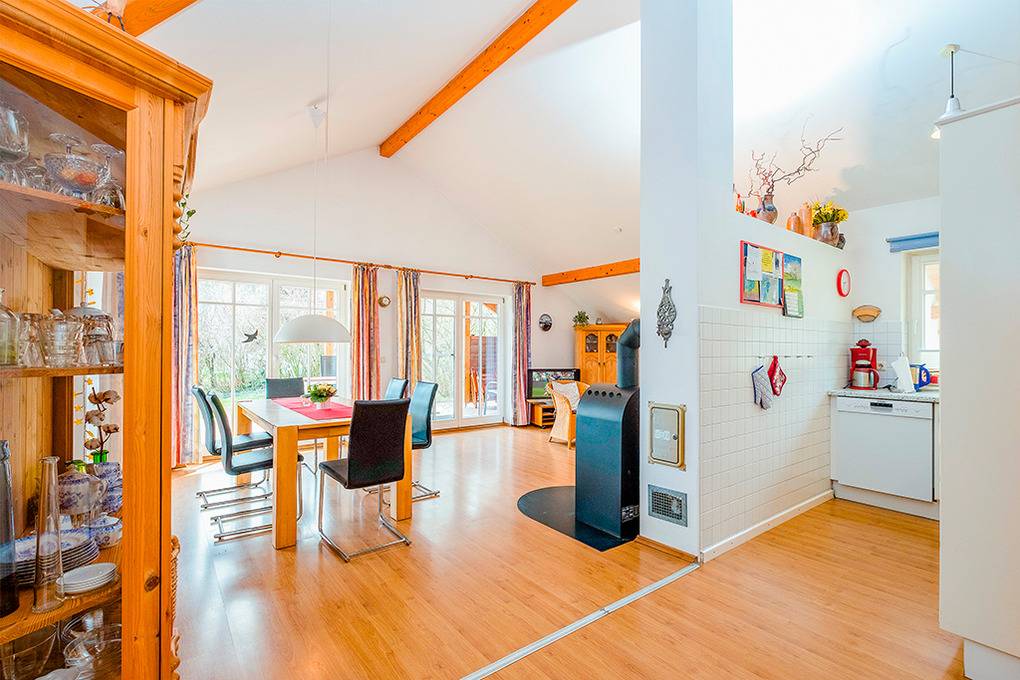 Haus: Vier schöne, auf einem 6000 qm großen Grundstück erbaute Ferienhäuser mit Kaminofen. Geschmackvolle Einrichtung und großes Platzangebot im Wohnraum. Fußbodenheizung. Waschmaschine. Kostenloser Internetzugang über Wlan. Terrasse mit Sitzmöbeln, Garten. Die Ferienhäuser verfügen über Grill- und Spielplatz und eine Tischtennisplatte (jeweils gemeinschaftliche Nutzung).
