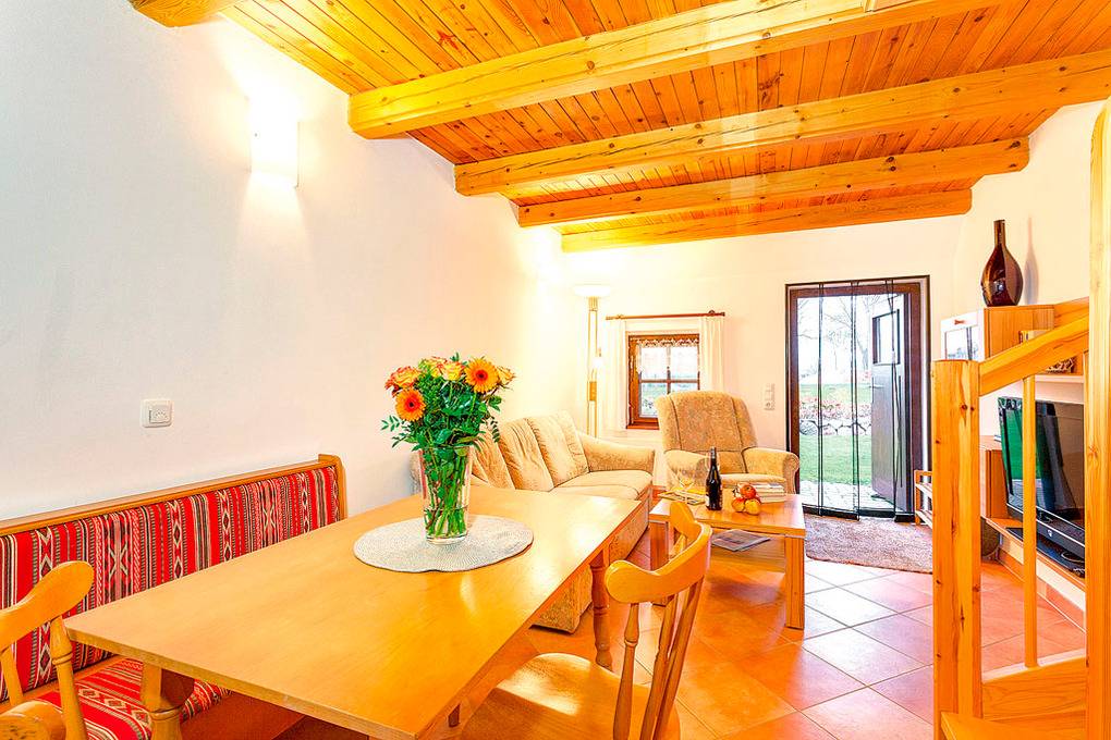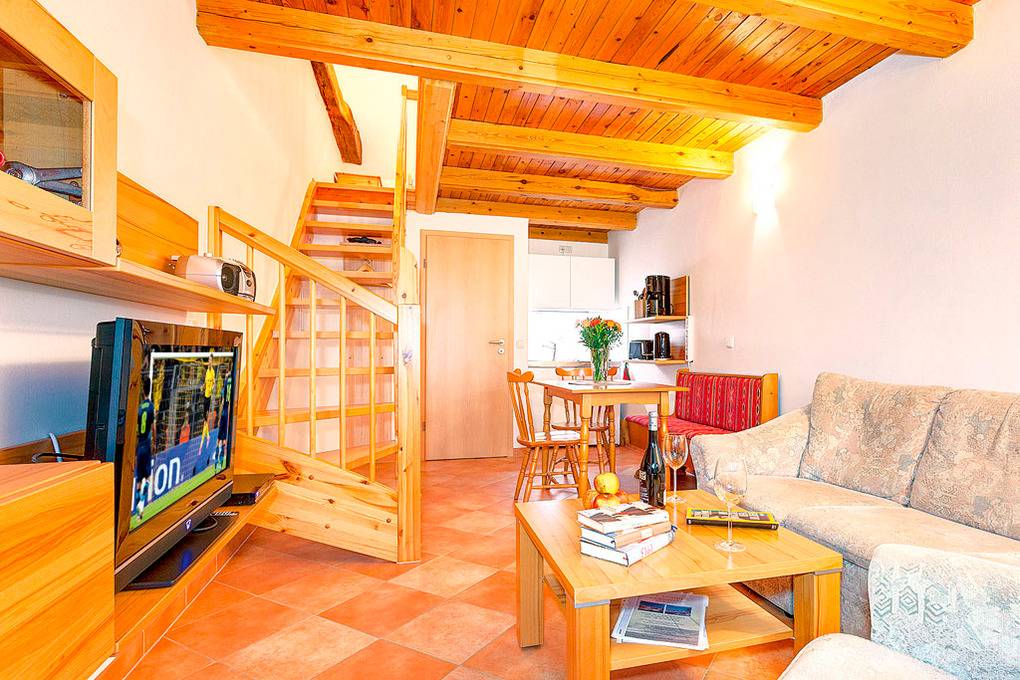 D 133.115 Wohnung 2-3 Pers.: 2-Zimmerwohnung mit ca. 40 qm Wohnfläche. Parterre: Wohn-/Essraum mit gemütlicher Sitzgruppe, Sat-TV, Radio/CD, Esstisch, Pantryküche. Bad/WC. Vom Wohnraum aus Treppe ins ausgebaute Dachgeschoss: offenes 3-Bettzimmer mit 3 Einzelbetten.