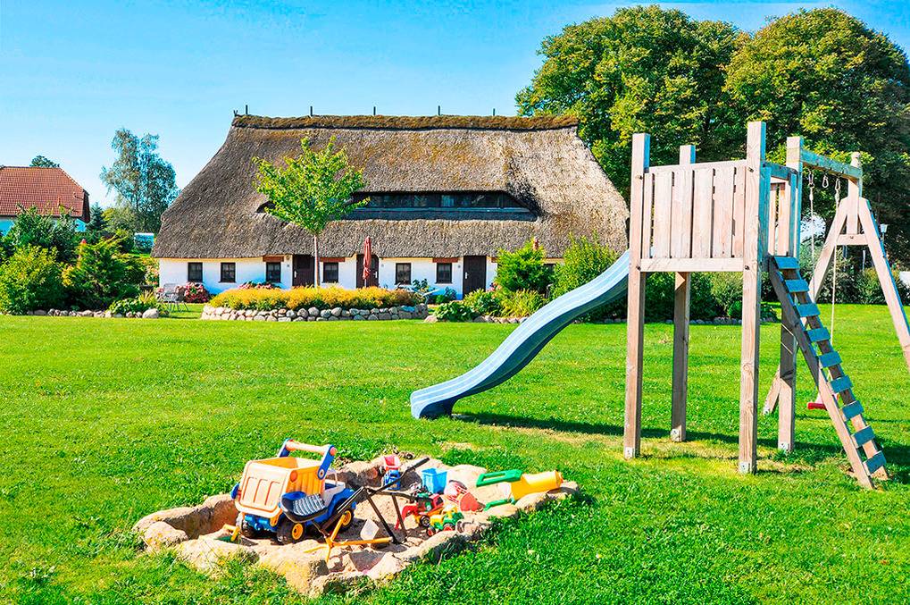 Haus: Regionaltypisches Reetdachhaus einer ehemaligen Büdnerei. Das kleine ländliche Anwesen wurde mit viel Liebe zum Detail umgebaut und restauriert zu einem Ferienhaus mit fünf Wohnungen. Geschmackvolle Einrichtung, gemütlich-rustikales Ambiente mit schönen Holzbalkendecken. Kostenloser Internetzugang über W-Lan. Zentralheizung. Nichtraucherwohnungen. Großer Garten mit Wasserblick aufs Salzhaff, 1 Sitzecke pro Fewo, Spiel- und Liegewiese, Sandkasten, Schaukel, Rutsche, Grill (Gemeinschaftsnutzung). Parkmöglichkeiten für einen Pkw pro Fewo auf dem Anwesen. Hinweis: Fahrradverleih in Neubukow, Lieferservice zum Haus.